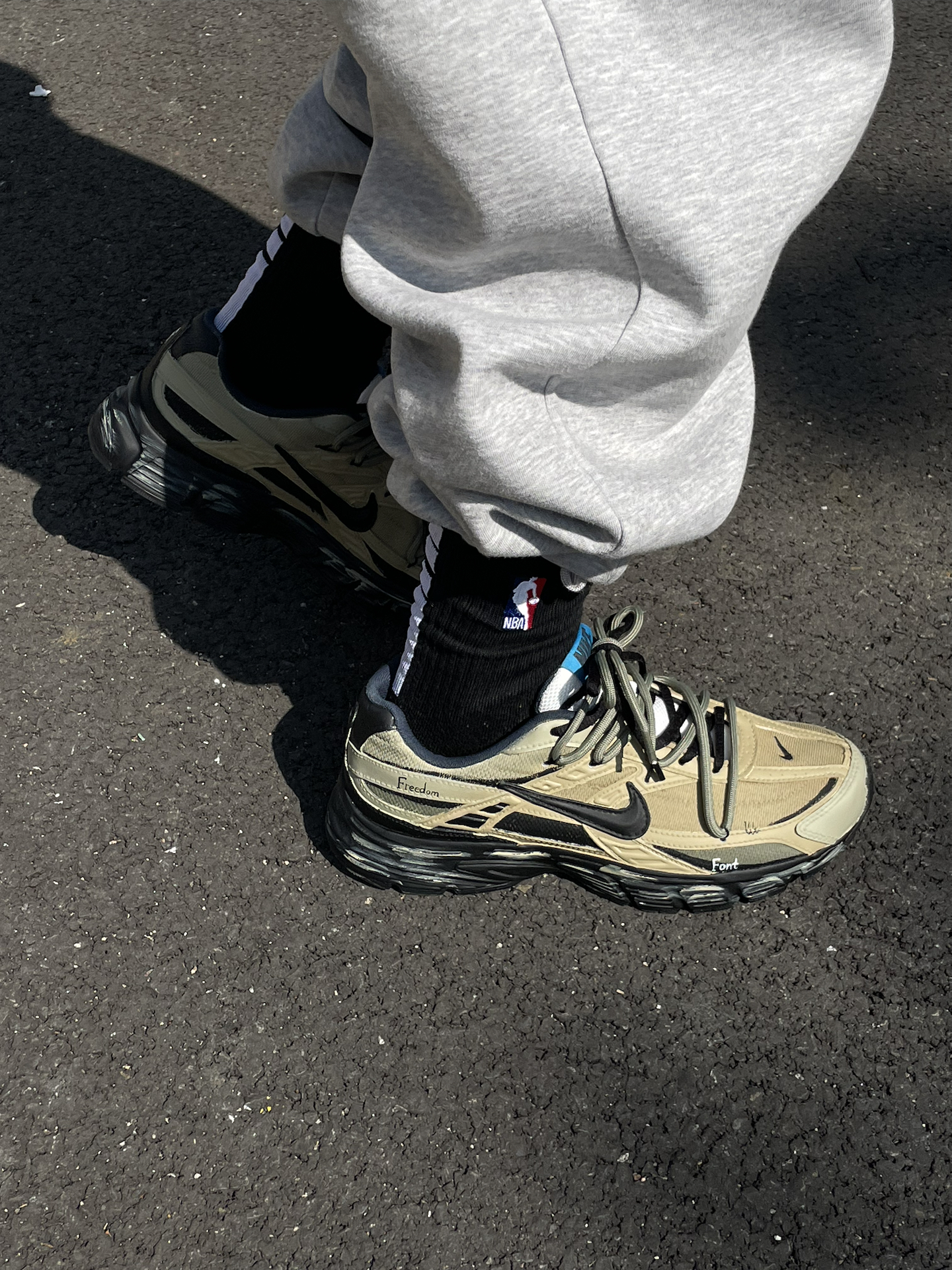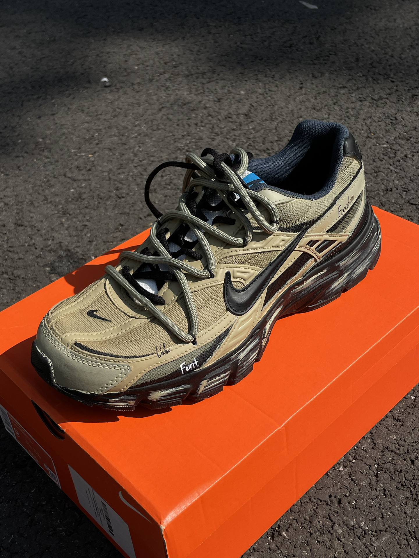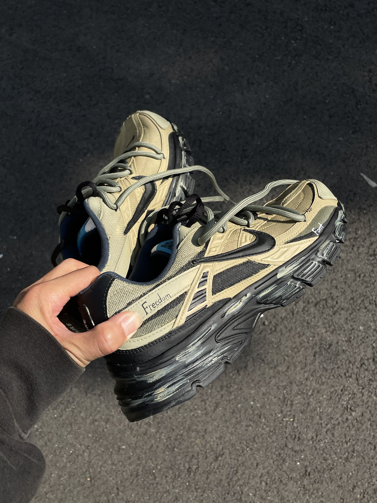 给大家简单分享一双我最近常穿的 Nike 定制老爹鞋(Initiator) 整体是军绿色工装风,搭配黑色鞋标和鞋带,再加一点擦色做旧和双鞋带设计。鞋身还有定制涂鸦和 “Freedom” 字样,上脚蛮个性的。 中底软硬适中,走路久了不容易累。前掌空间比较宽,对脚型包容度高,尺码正常选就行。中底大概有 3cm 左右的增高,站着走着都挺舒服。 搭配上我一般拿它配宽松卫裤、牛仔裤or工装裤,很容易融...