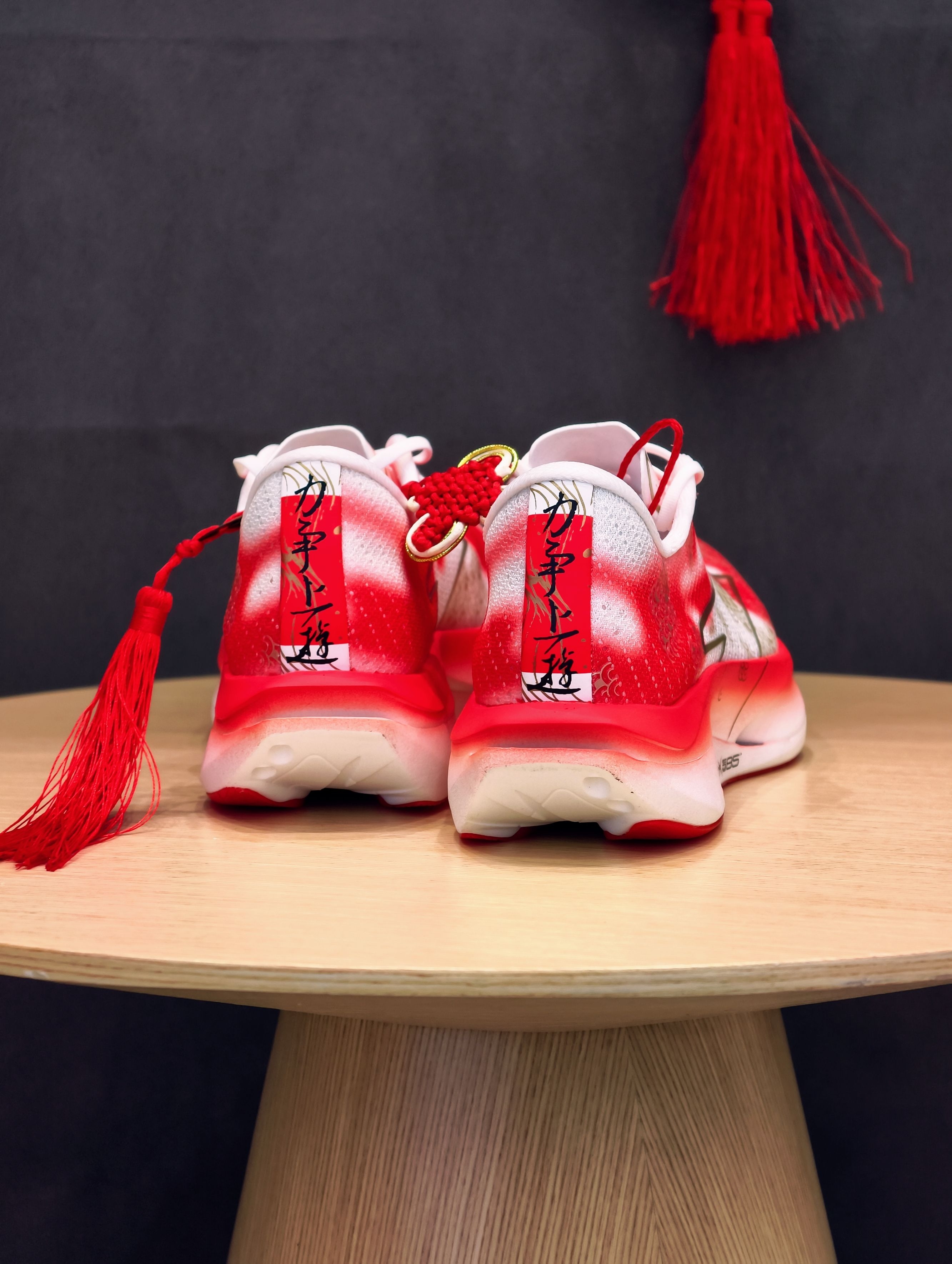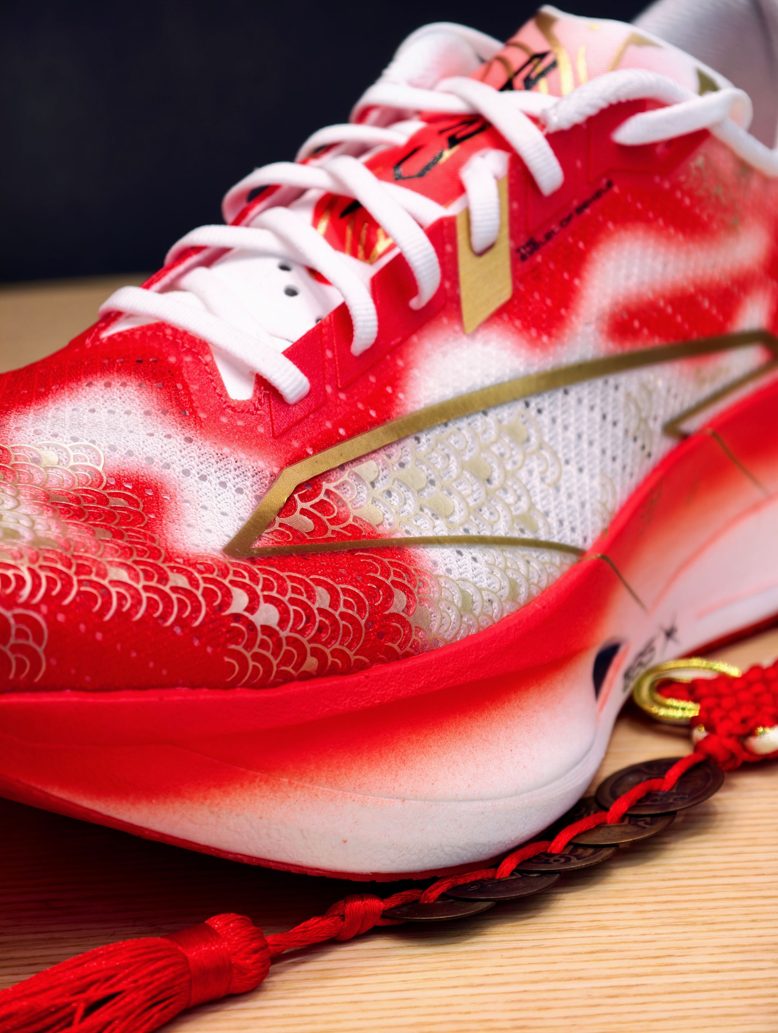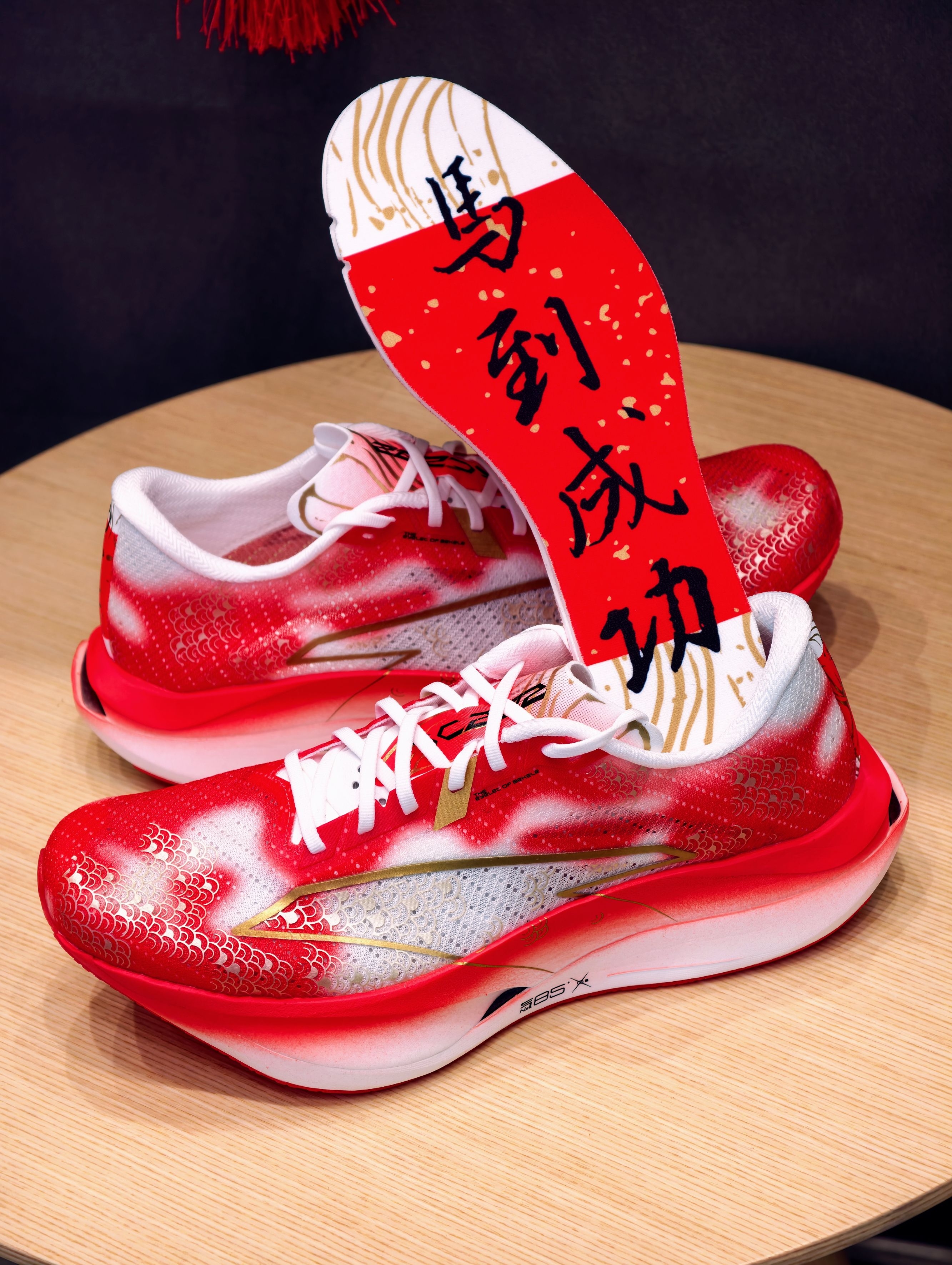 先吹爆这个颜值——红白渐变鞋身像锦鲤跃出水面,金色鱼鳞压胶在光下闪着细闪,鞋侧烫金LOGO戳中审美点,连附赠的红色鞋带都在暗戳戳讨彩头~ 细节控狂喜!后跟毛笔字“力争上游”超有力量感,鞋垫居然藏着“马到成功”“高分上岸”的彩蛋,新年穿它出门,感觉每一步都在叠好运buff,体测、备赛、通勤都自带仪式感!