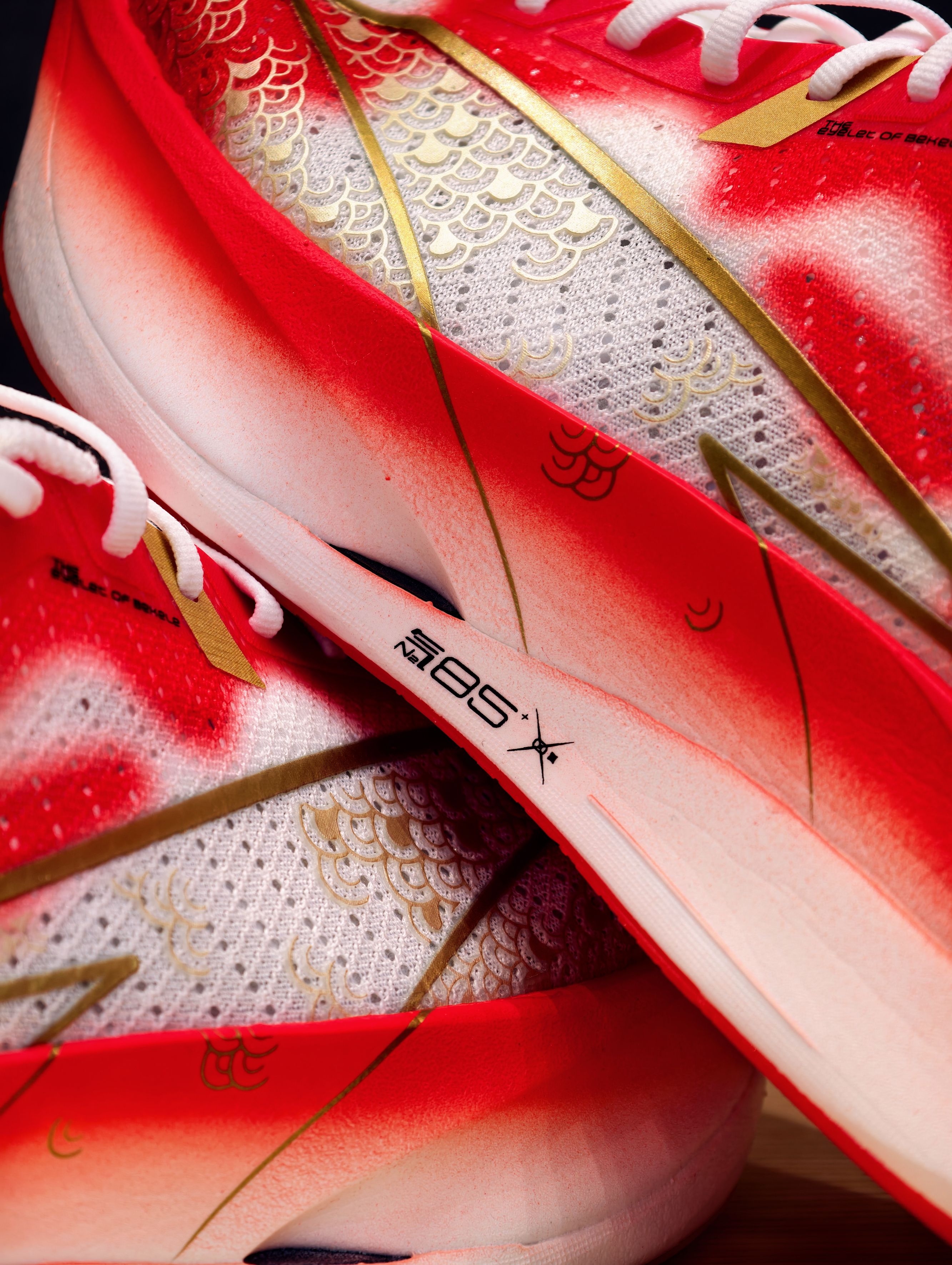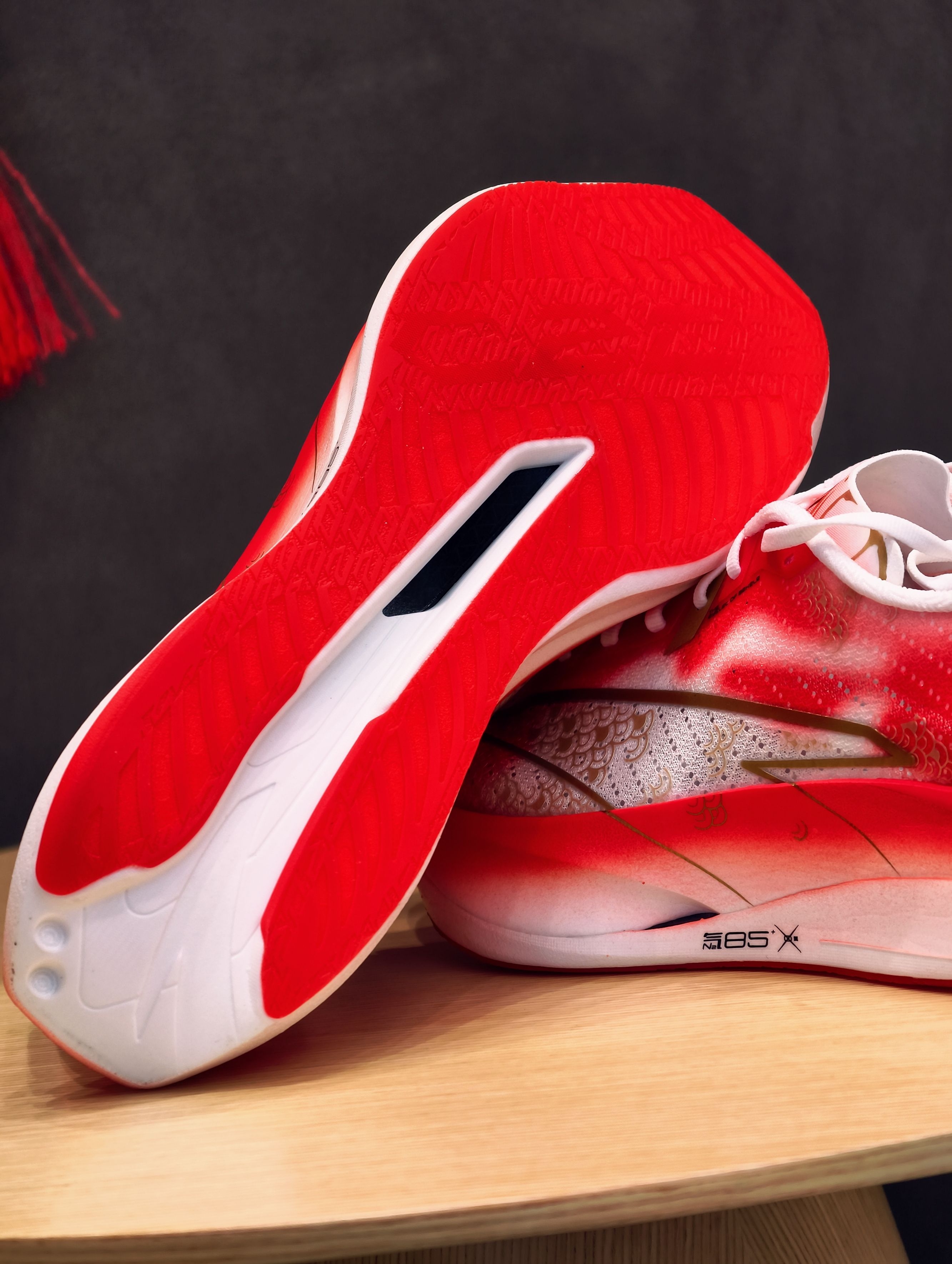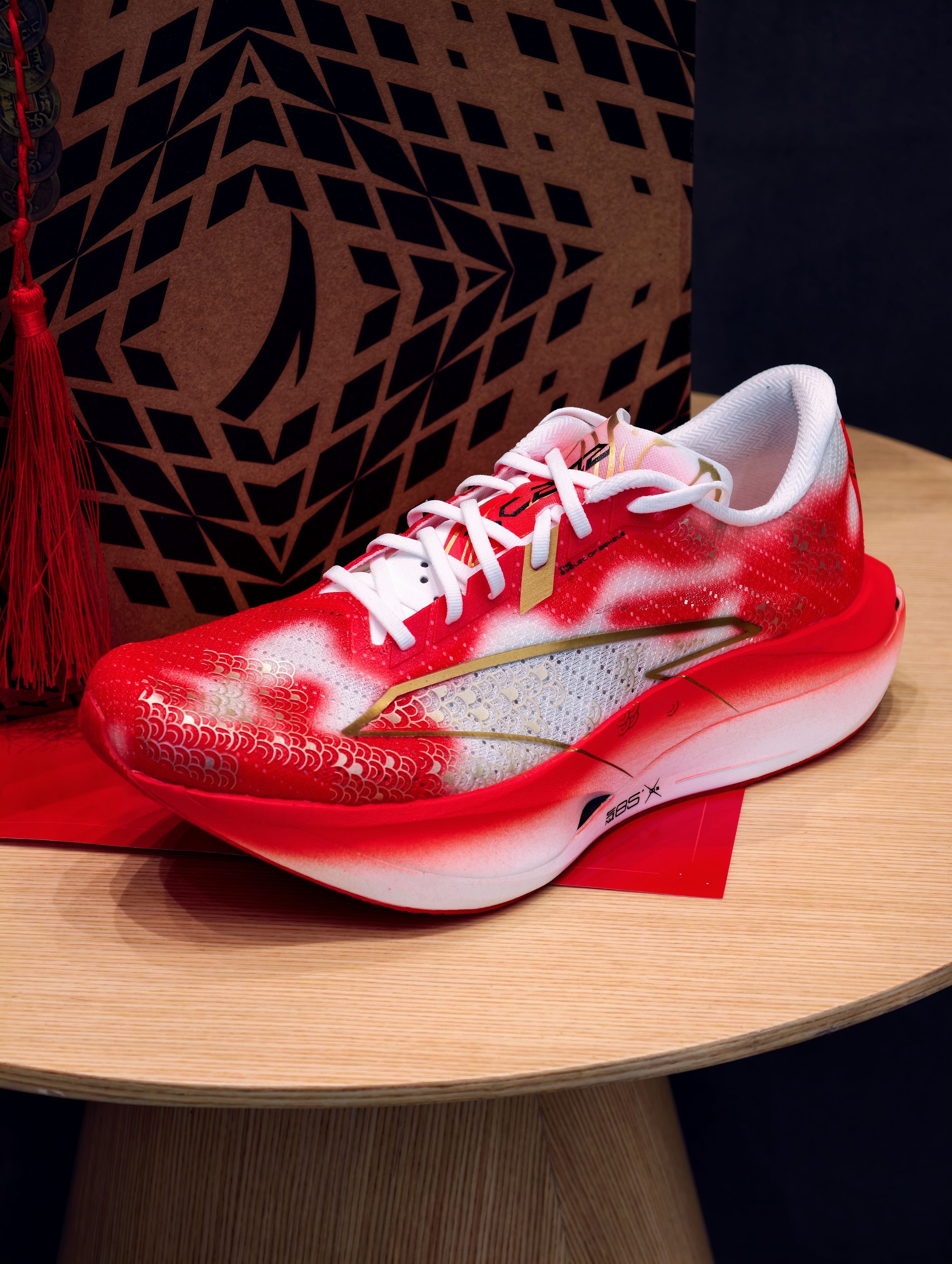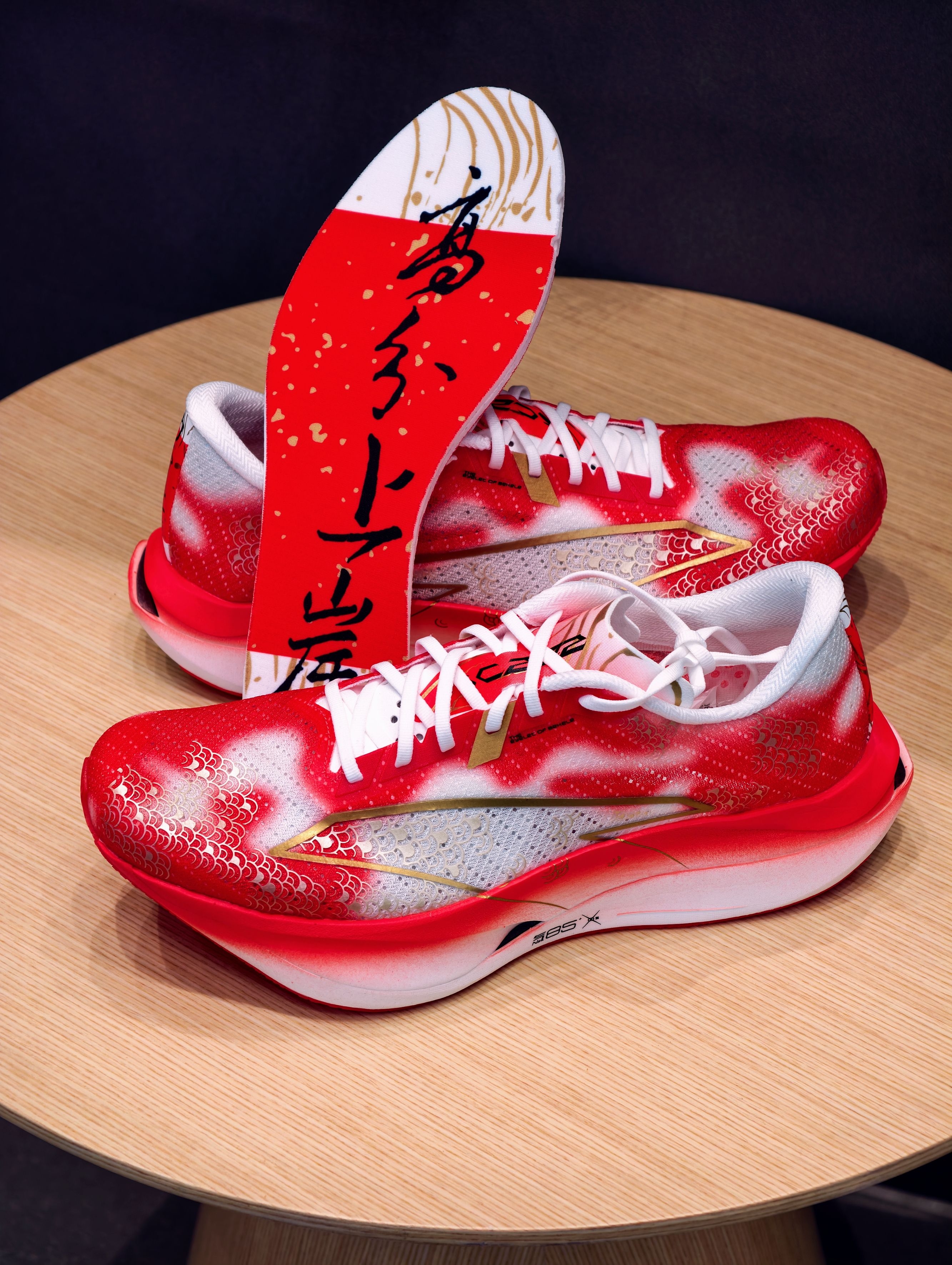 先吹爆这个颜值——红白渐变鞋身像锦鲤跃出水面,金色鱼鳞压胶在光下闪着细闪,鞋侧烫金LOGO戳中审美点,连附赠的红色鞋带都在暗戳戳讨彩头~ 细节控狂喜!后跟毛笔字“力争上游”超有力量感,鞋垫居然藏着“马到成功”“高分上岸”的彩蛋,新年穿它出门,感觉每一步都在叠好运buff,体测、备赛、通勤都自带仪式感!