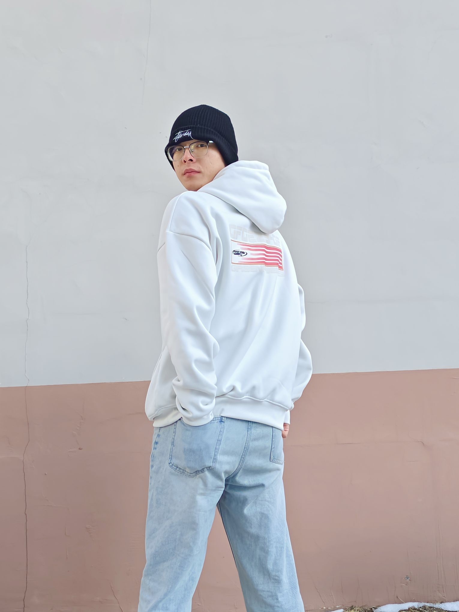 今天带来的白色连帽卫衣里面还有小颗粒绒。再也不怕冬天冷了。 整体浅色系,让别人看起来很干净轻盈,很符合年轻人的气质,牛仔裤作为百搭的单品衣柜里真是缺他不可了,这一套日常通勤还有校园生活都是没有问题滴。 卫衣还有裤子都很宽松很藏肉,体重大一点的朋友们也不用害怕。