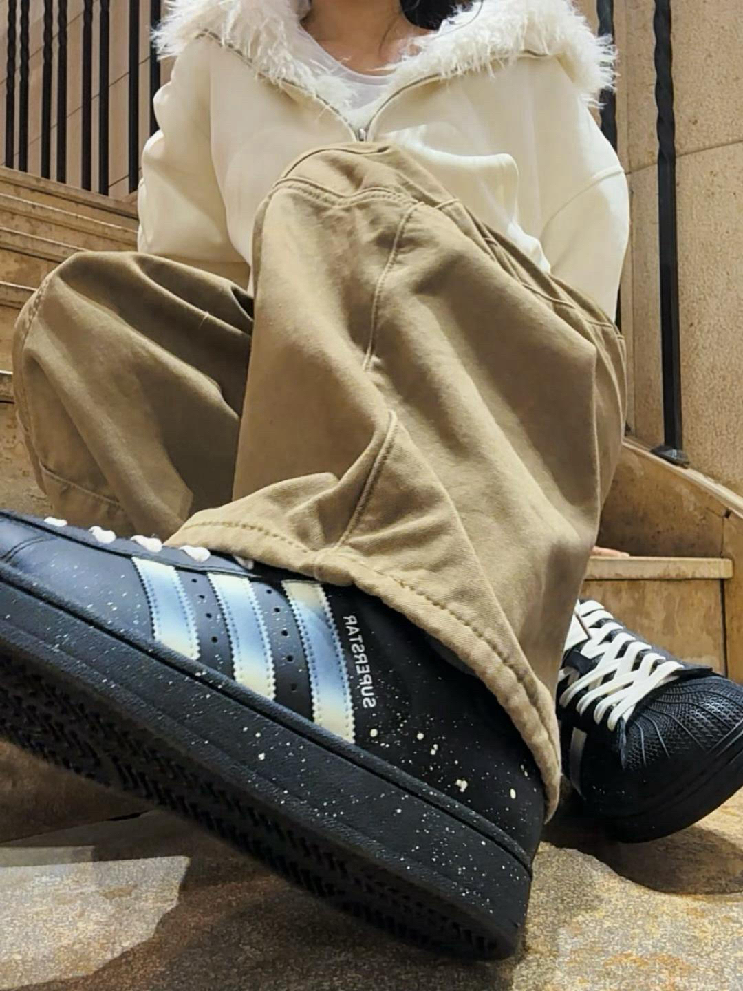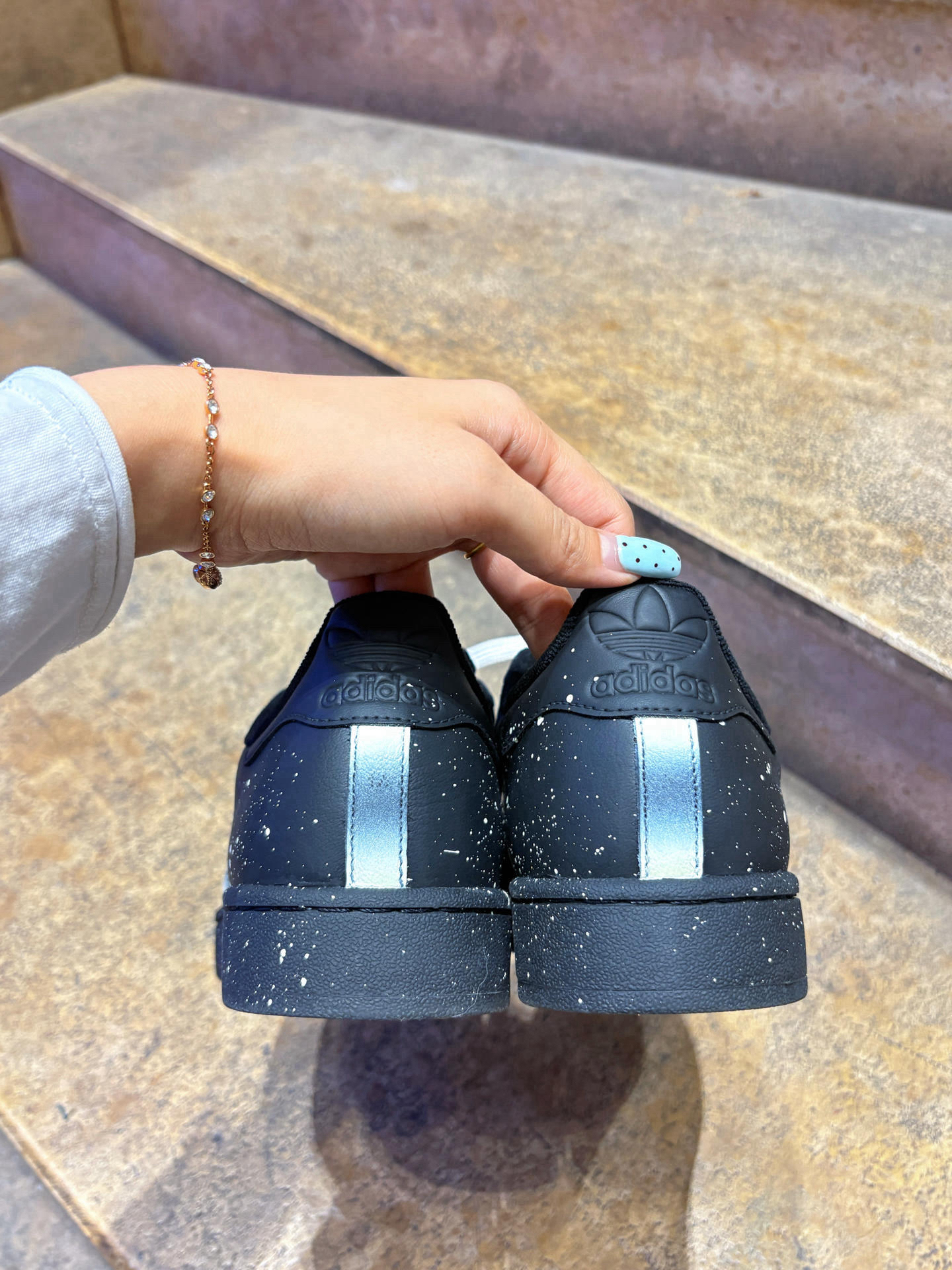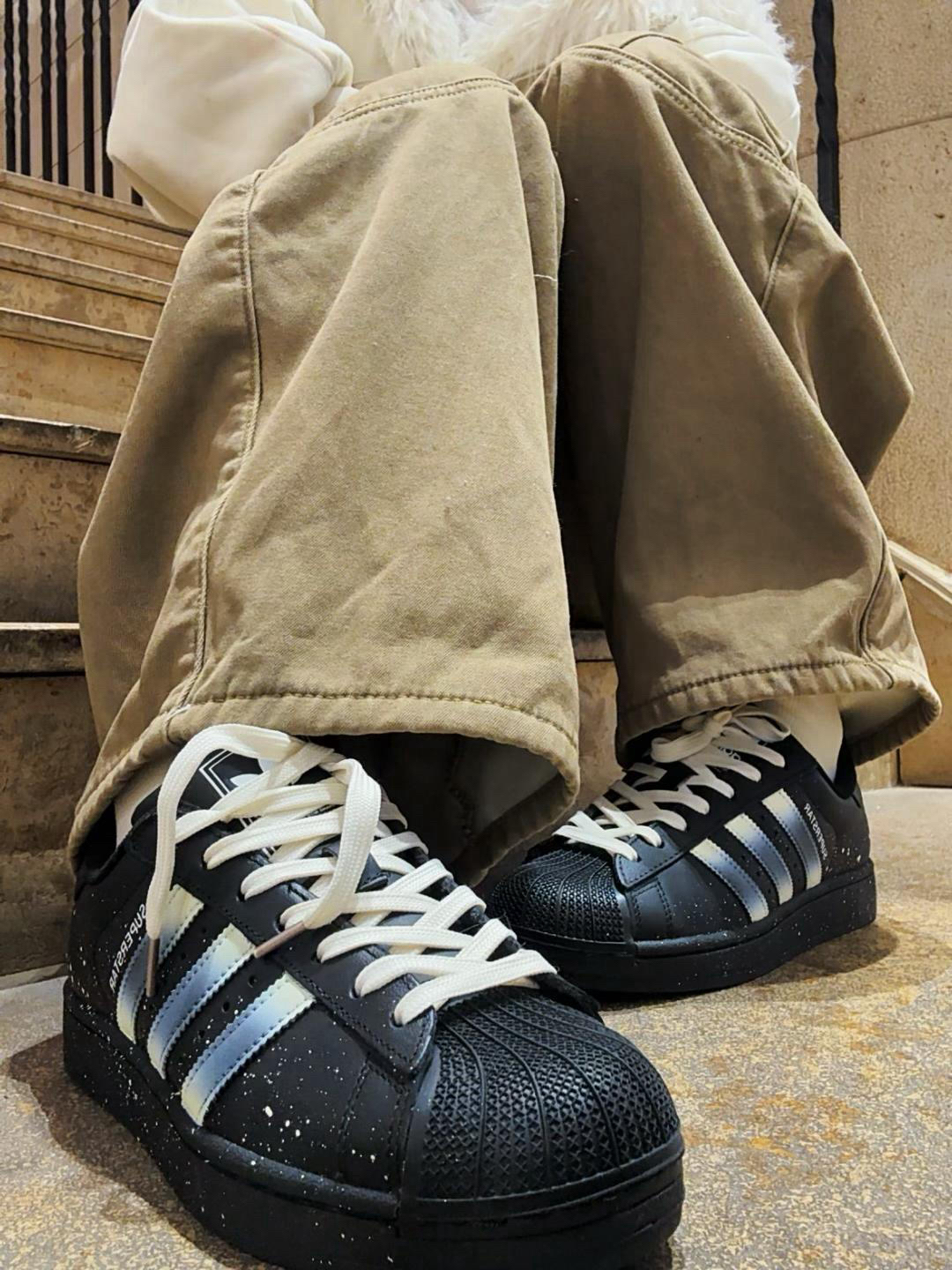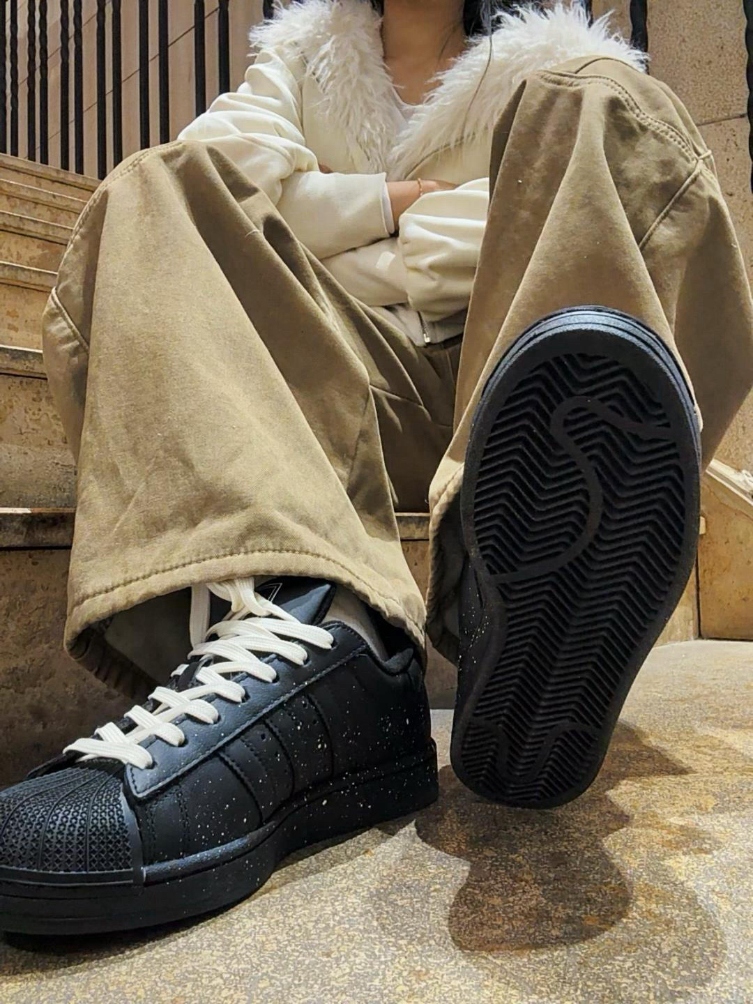 跟着Jennie学穿搭阿迪是必备单品✌🏻 阿迪贝壳头是经典中的经典啦 新入手这款是满天星定制款哦📸 保留了经典鞋型和配色 在原有基础上添加了泼墨元素 墨点像满天星一样✨ 黑色板鞋也很百搭 休闲裤、牛仔裤都可以哦 姐妹们快快穿起来吧 👟