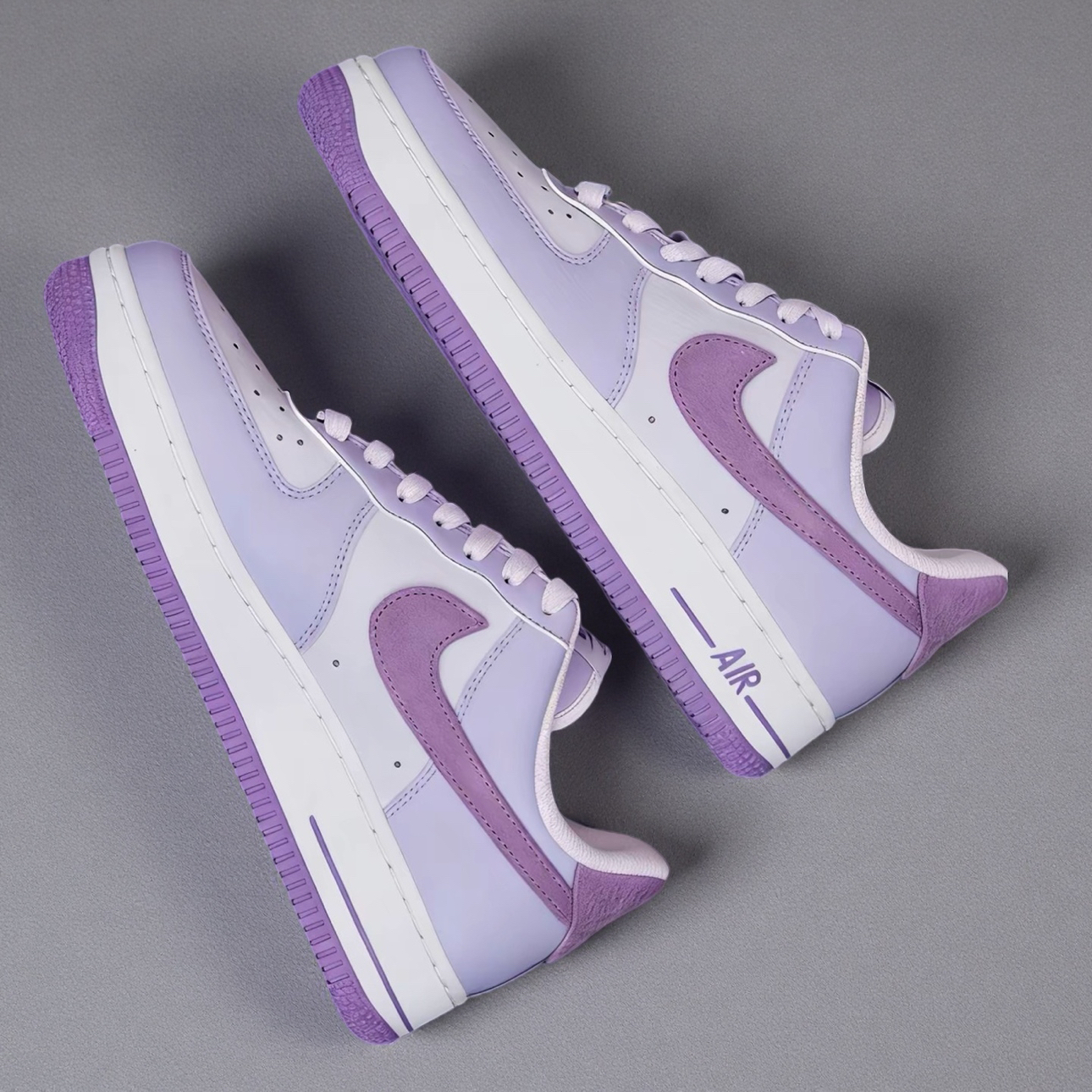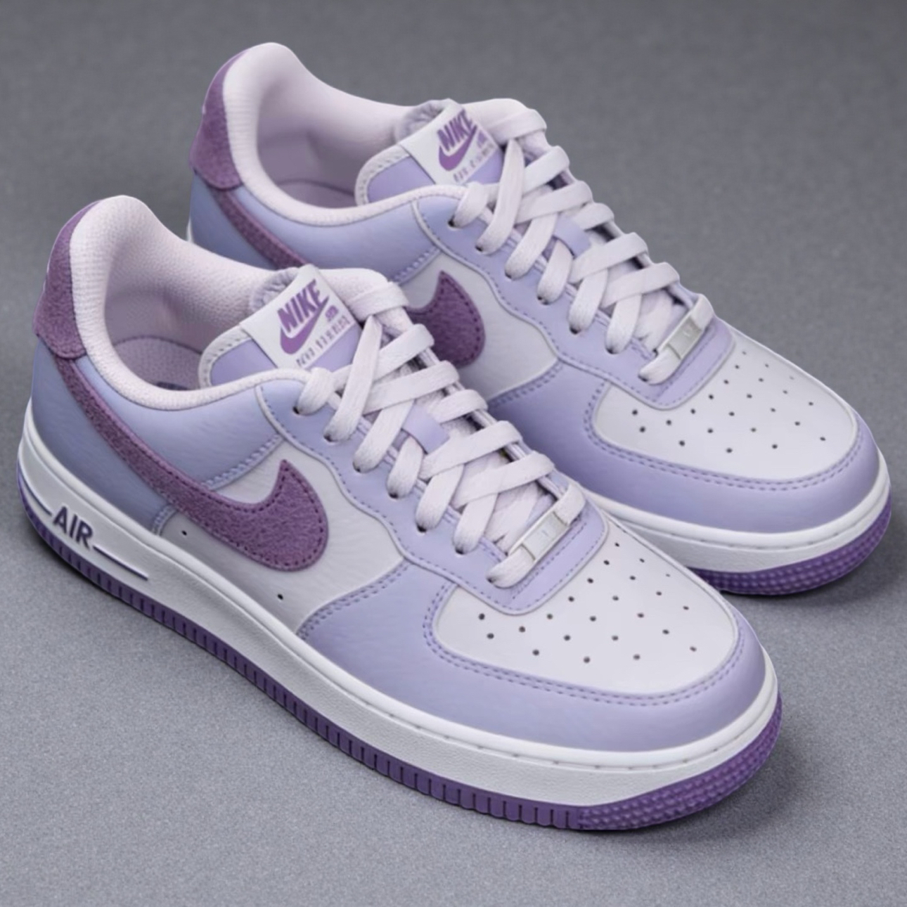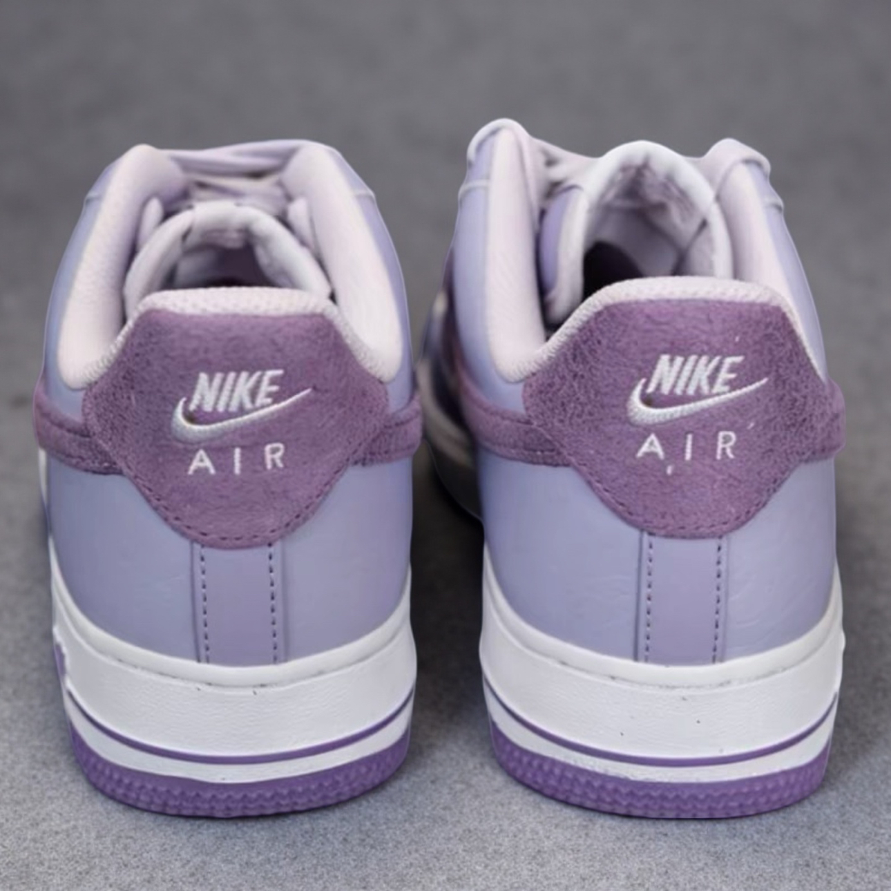 刚拆的这双浅紫AF1, 配色直接把我拿捏了💜 低饱和的浅紫+深紫麂皮拼接, 温柔又不会太艳,鞋面摸起来软乎乎的, 质感很舒服~ 后跟的“NIKE AIR”标和鞋侧的线条细节都很用心✨ 不会太花哨但越看越有味道。 鞋底的软度刚好,不会硌脚,通勤或者逛咖啡店都挺适配的
