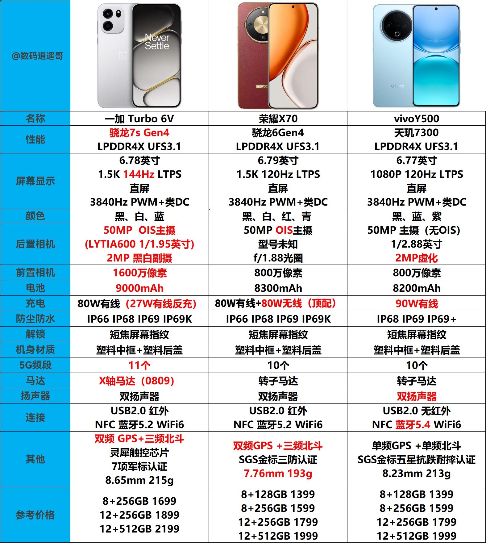 一加Turbo6V对比荣耀X70、vivoY500 ★一加Turbo6V 核心优势 1. 续航与充电:9000mAh超大电池,搭配80W有线快充+27W有线反充,续航能力突出,还能为其他设备应急补电。 2. 性能与体验:搭载骁龙7s Gen4处理器,配备X轴马达(0809)、灵犀触控芯片,游戏和日常操作的震感、触控体验更好。 4. 防护与功能:支持IP66/IP68/IP69K防尘防水,拥有11个...