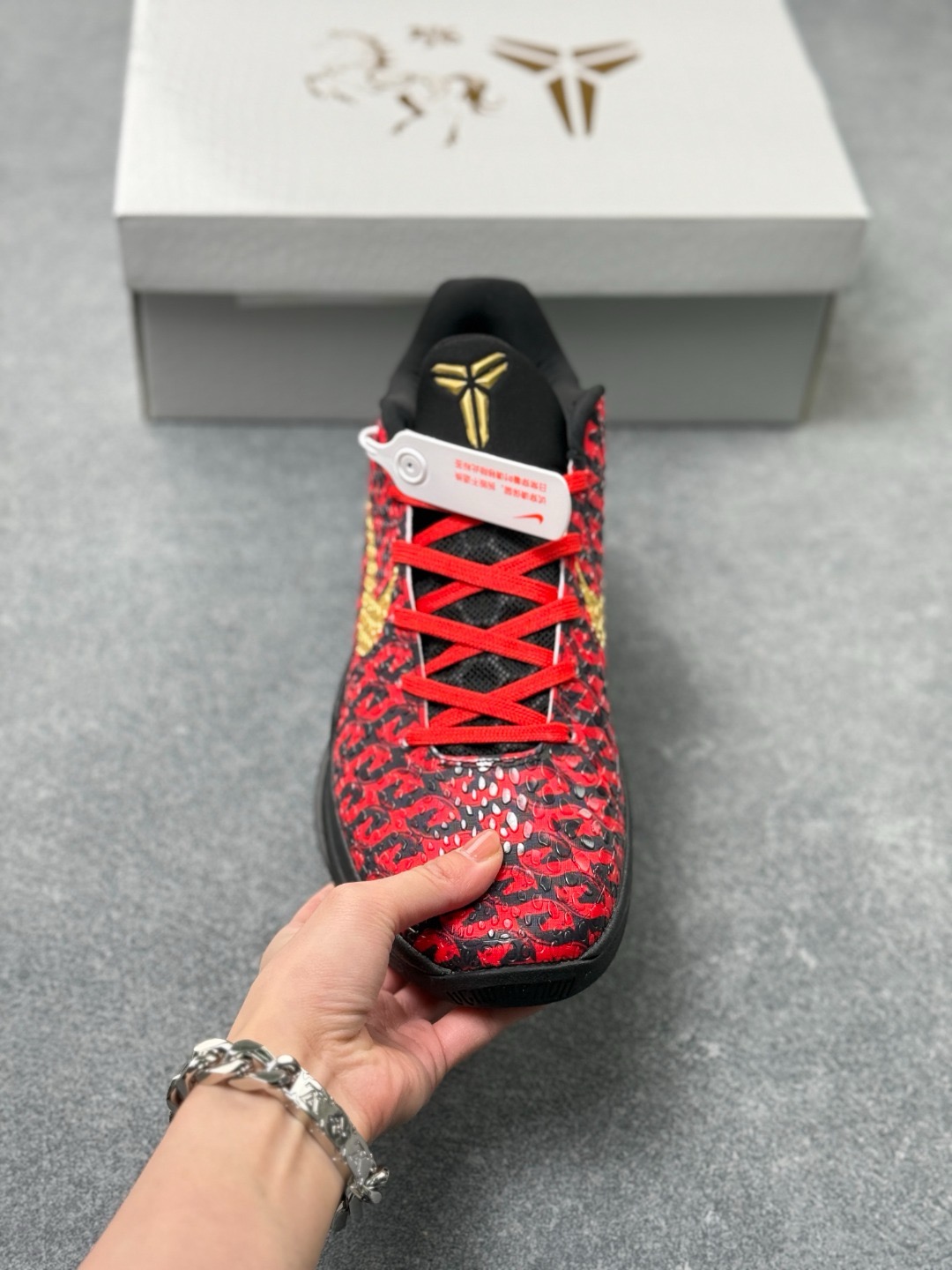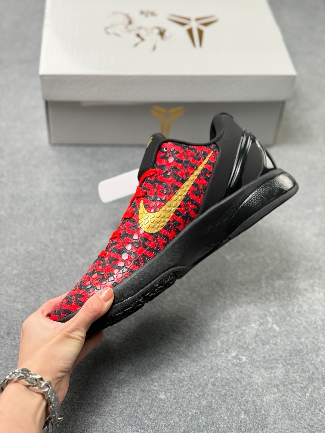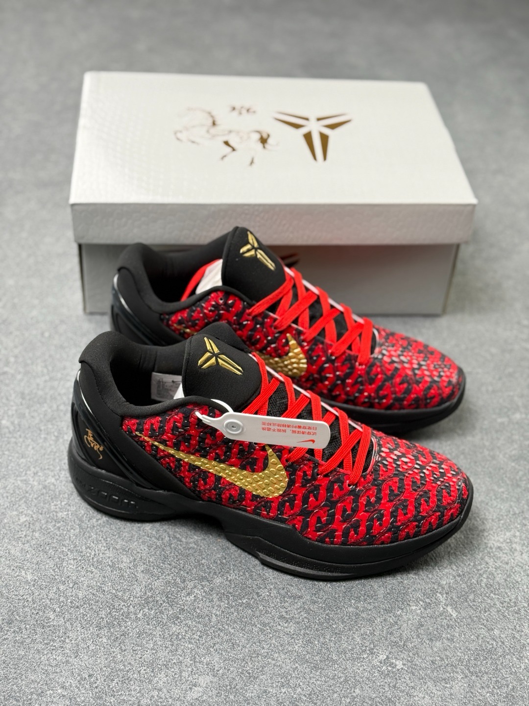 科比6代马年限定款篮球鞋 科比6代马年限量款鞋是为庆祝中国农历马年特别推出的纪念版本,以科比·布莱恩特第六代签名战靴为基础设计。鞋身采用中国传统红色与金色搭配,融入马年元素如生肖图腾、祥云纹样等细节,鞋舌或后跟常带有专属"马"字标识。该鞋款兼具高性能篮球科技与文化收藏价值,全球限量发售,深受球鞋爱好者与科比粉丝追捧,成为运动鞋文化与生肖主题跨界结合的经典之作。 配色:黑金红 货号:CW2190-0...