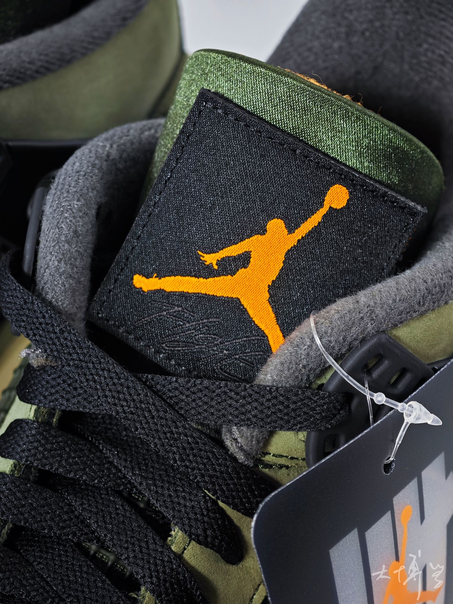 一双军绿色的AJ4 鞋身采用橄榄绿色磨砂牛巴革 相比普通皮革更显高级 鞋身网格、鞋带扣、中底包边等部位用亮面黑色 整体百搭且不挑穿搭风格 日常搭配工装裤、牛仔裤都没问题 虽然五条杠元素并不突出 但这就是五条杠联名