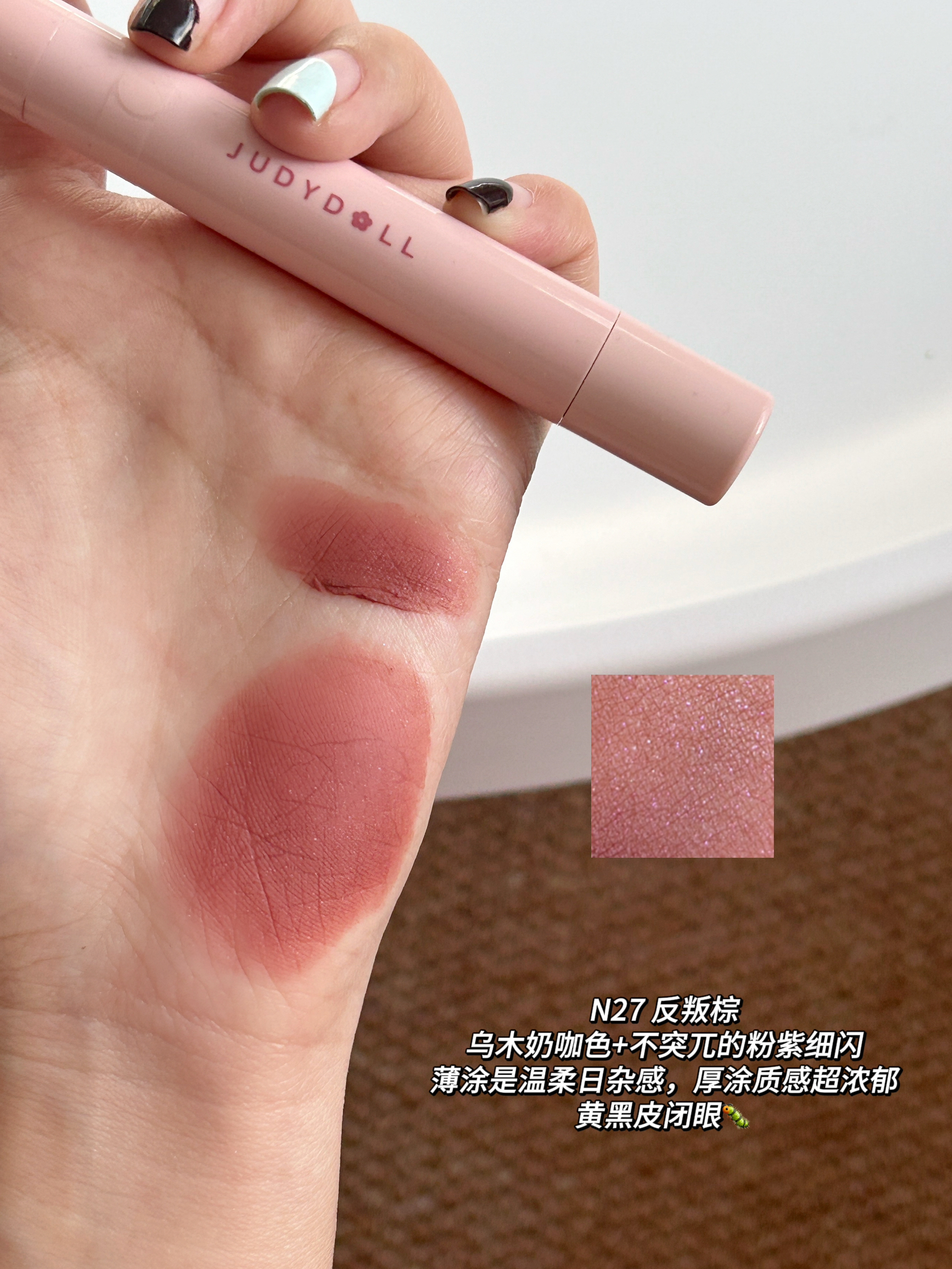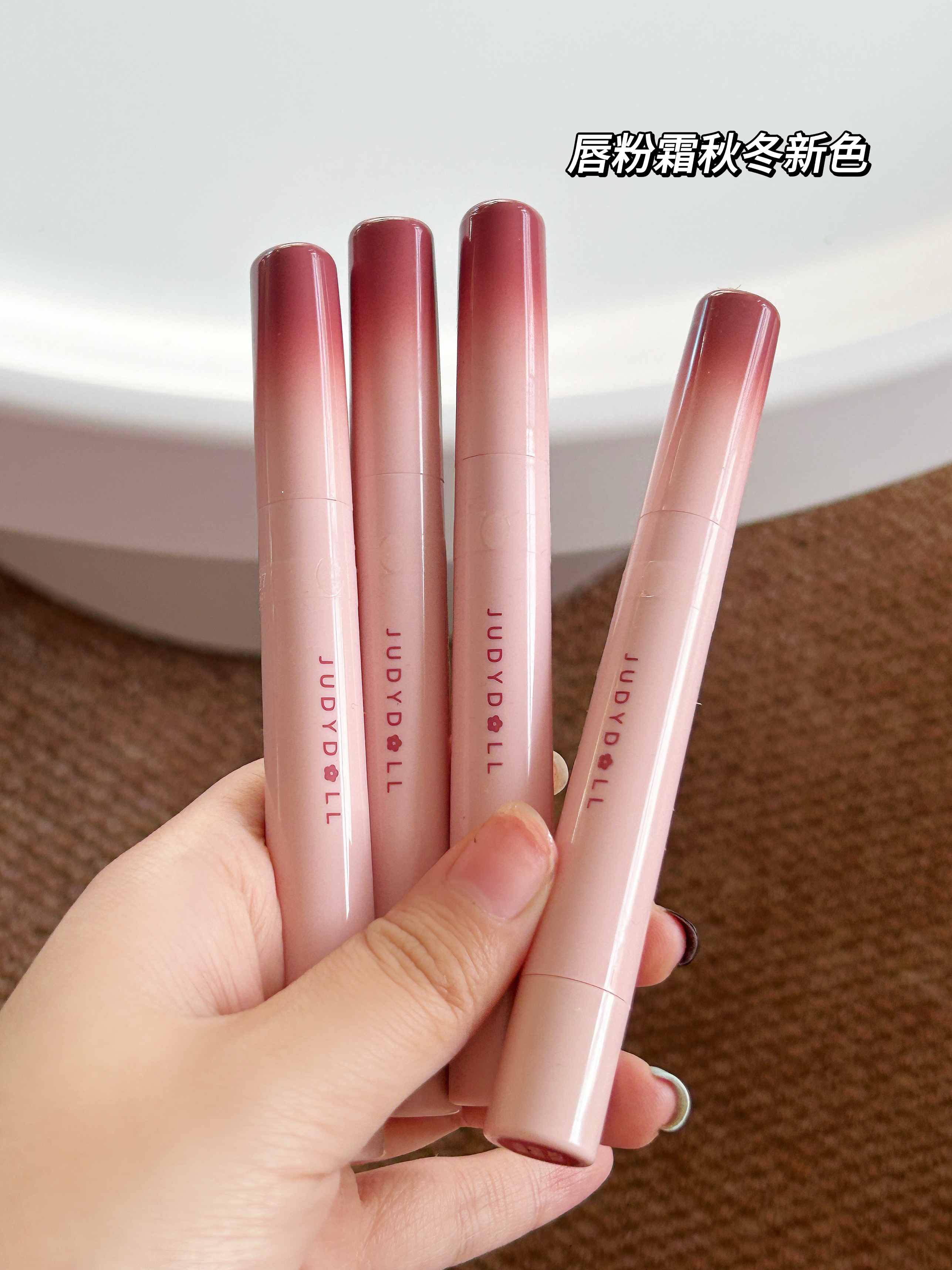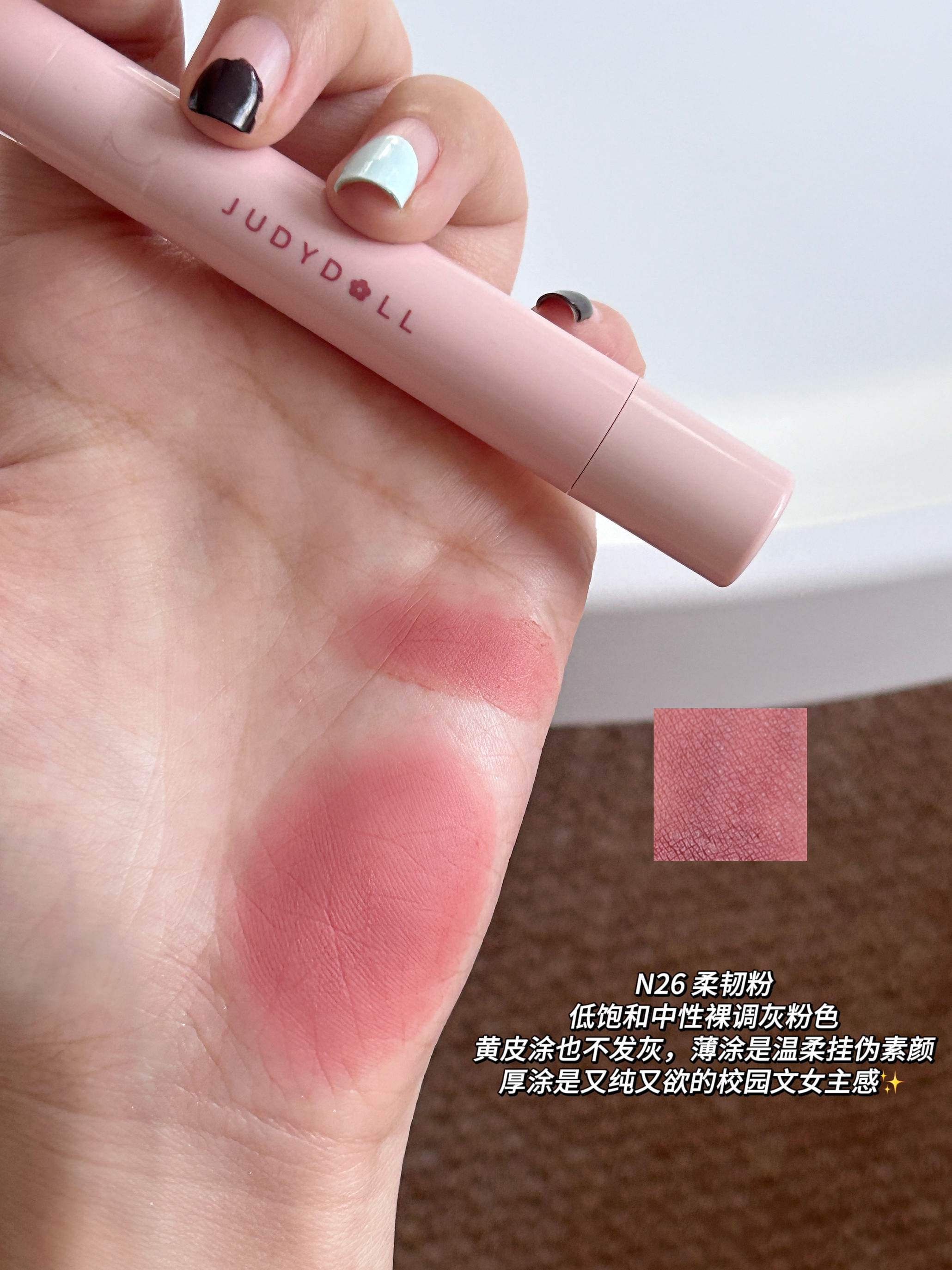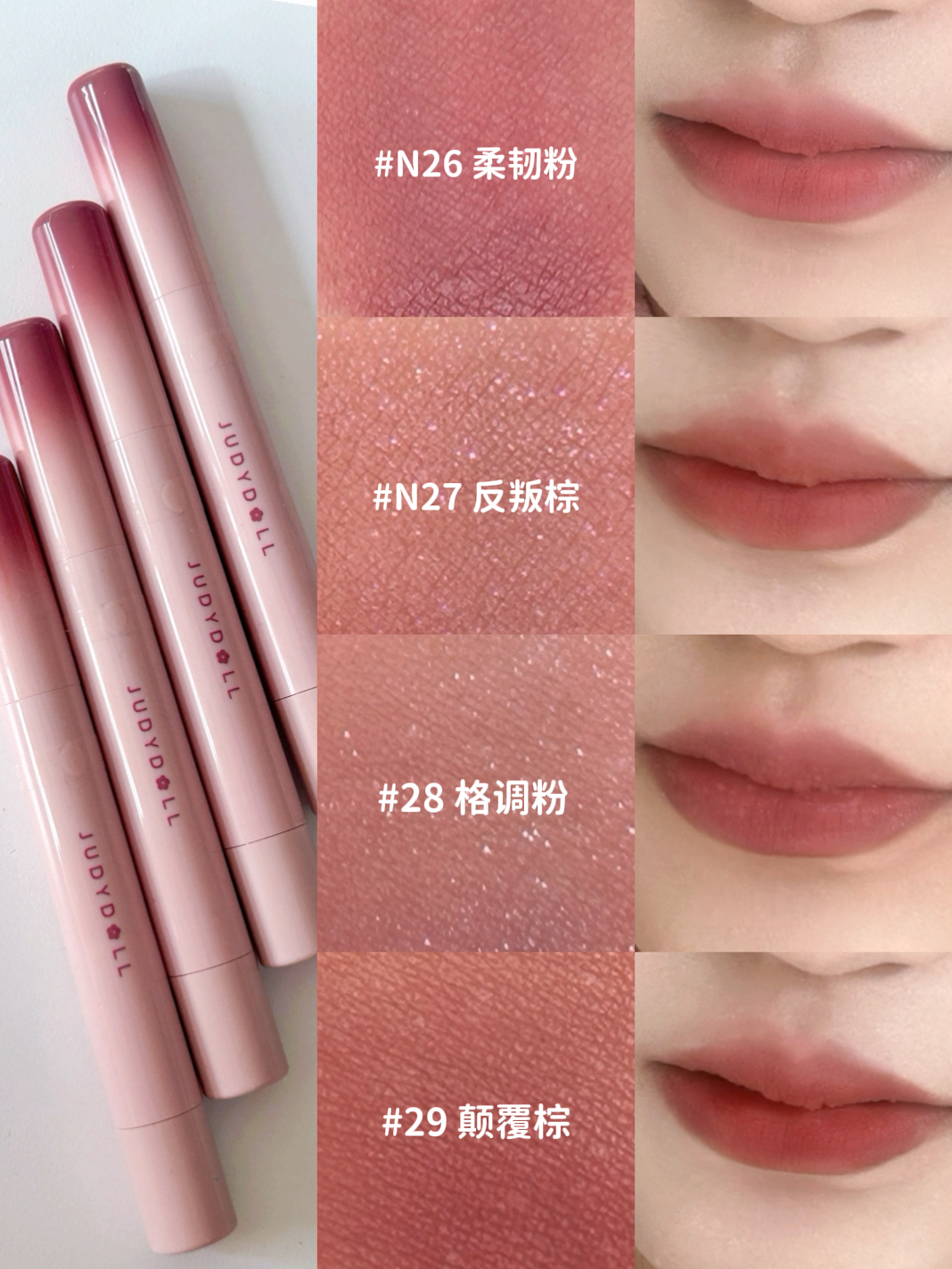 谁懂啊!橘朵这支粉棕系列唇粉霜直接把秋冬氛围感焊在嘴上了! 毛绒小毛球刷头软乎乎的~ 霜转粉质地,添加了植萃精油,滋润不拔干,久涂也不紧绷 💗#N26 柔韧粉 低饱和中性裸调灰粉太会了!薄涂是通勤必备的伪素颜好气色,厚涂温柔到骨子里。 🍫#N27 反叛棕 乌木奶咖棕里藏着细腻粉紫细闪,薄涂是温柔日杂感,厚涂棕调更浓郁,搭配毛衣简直绝配!黄皮涂也超显气质~ ✨#N28 格调粉 烟熏感粉棕+细碎银闪,...