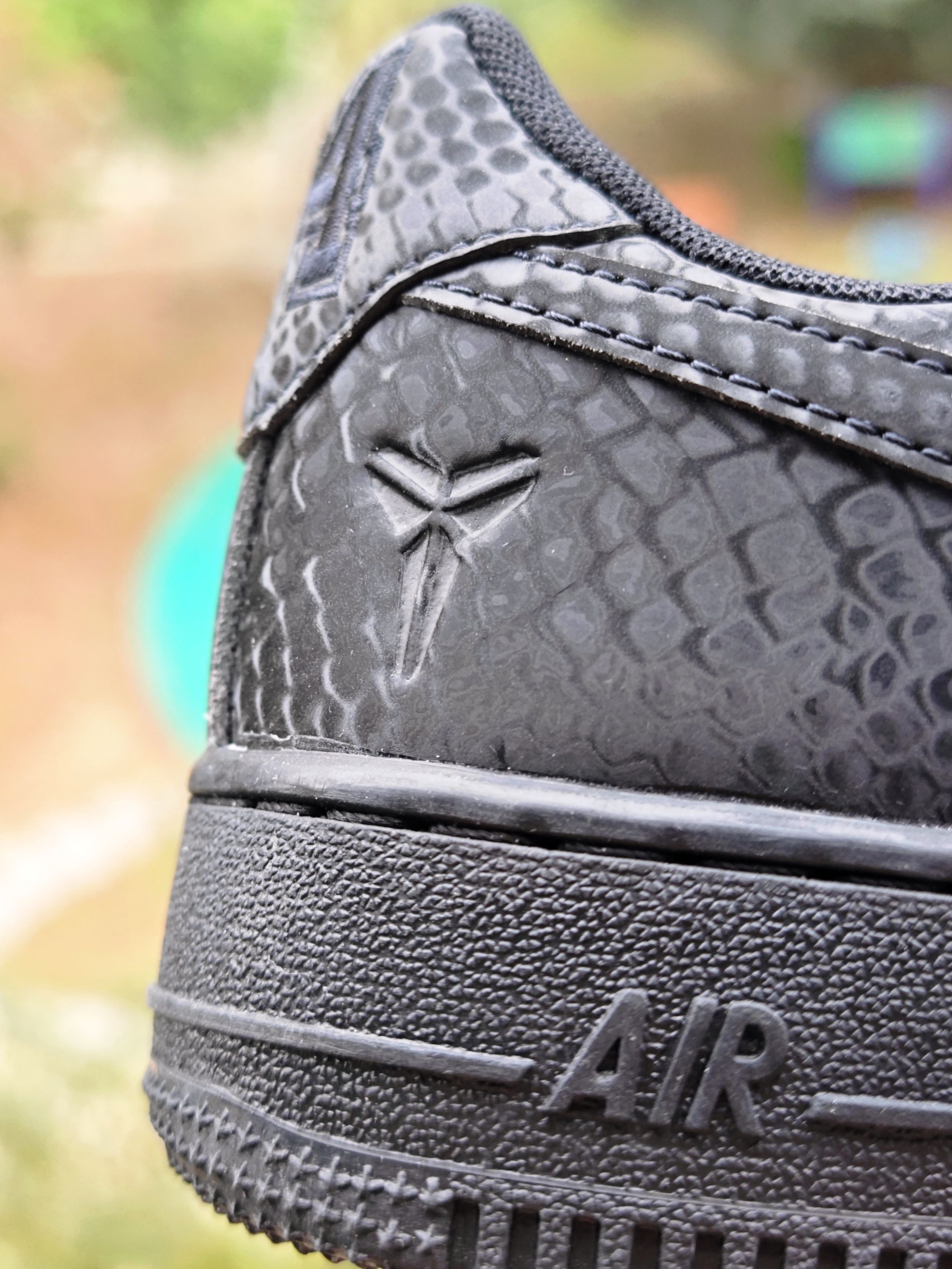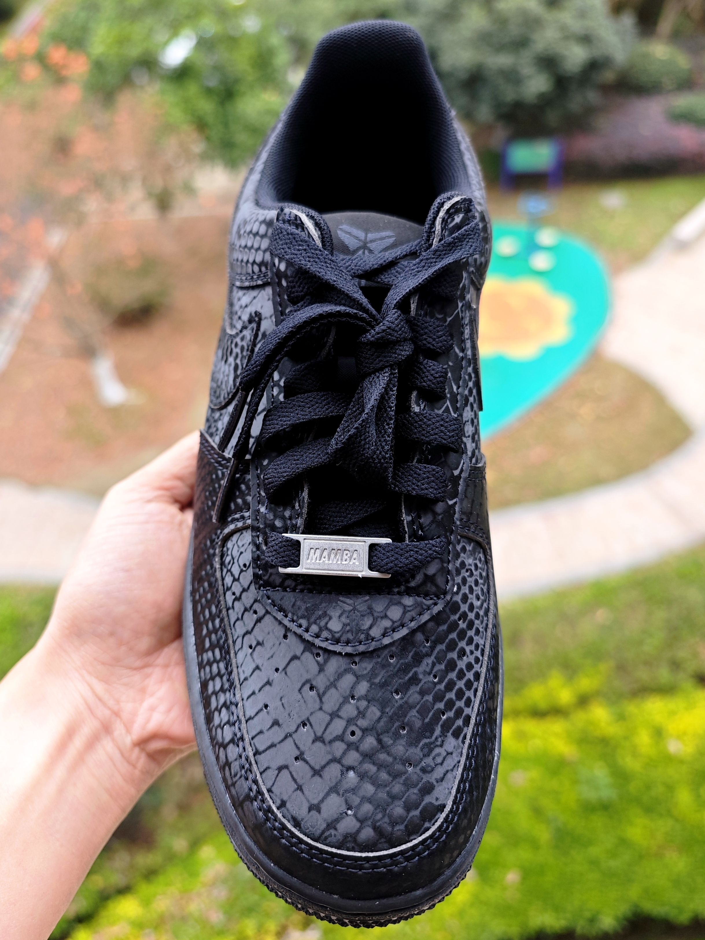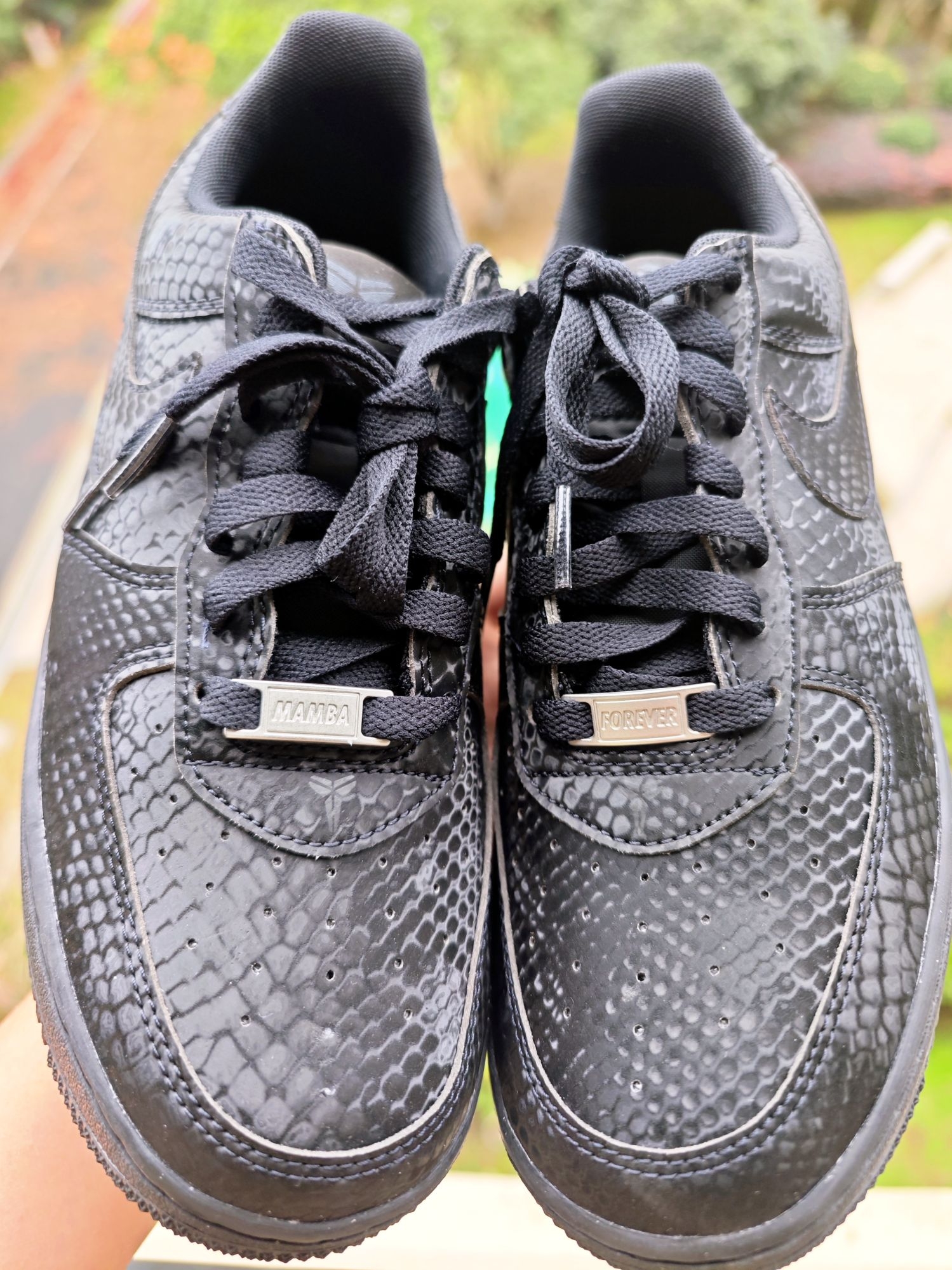 👀 其实科比空军一号已经出了很多款式了,一直观望没出手购买,就是在等黑色的🐍黑曼巴空军,这回是真如愿以偿了。 看图会觉得鞋身表面纹路是类似翻毛皮那样不光滑的,会很不好打理,但是,当你上手🤲模一下,你就会发现,其实是光滑的鞋身,很好打理,蛇鳞片是设计在光滑鞋面上的,真的是好看又好打理。 鞋后跟的8和24,前面的小鞋带扣 mamba和forever,满满的曼巴精神,真的太喜欢科比的...
