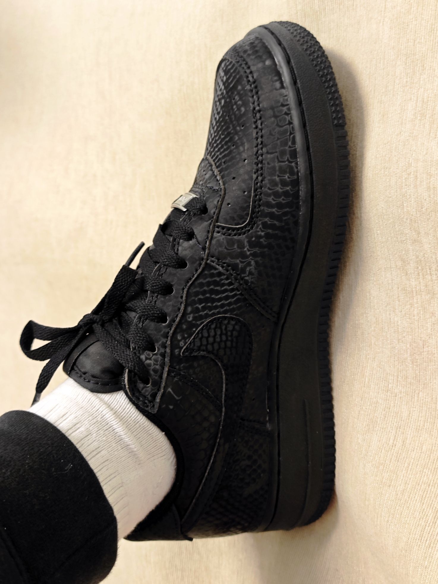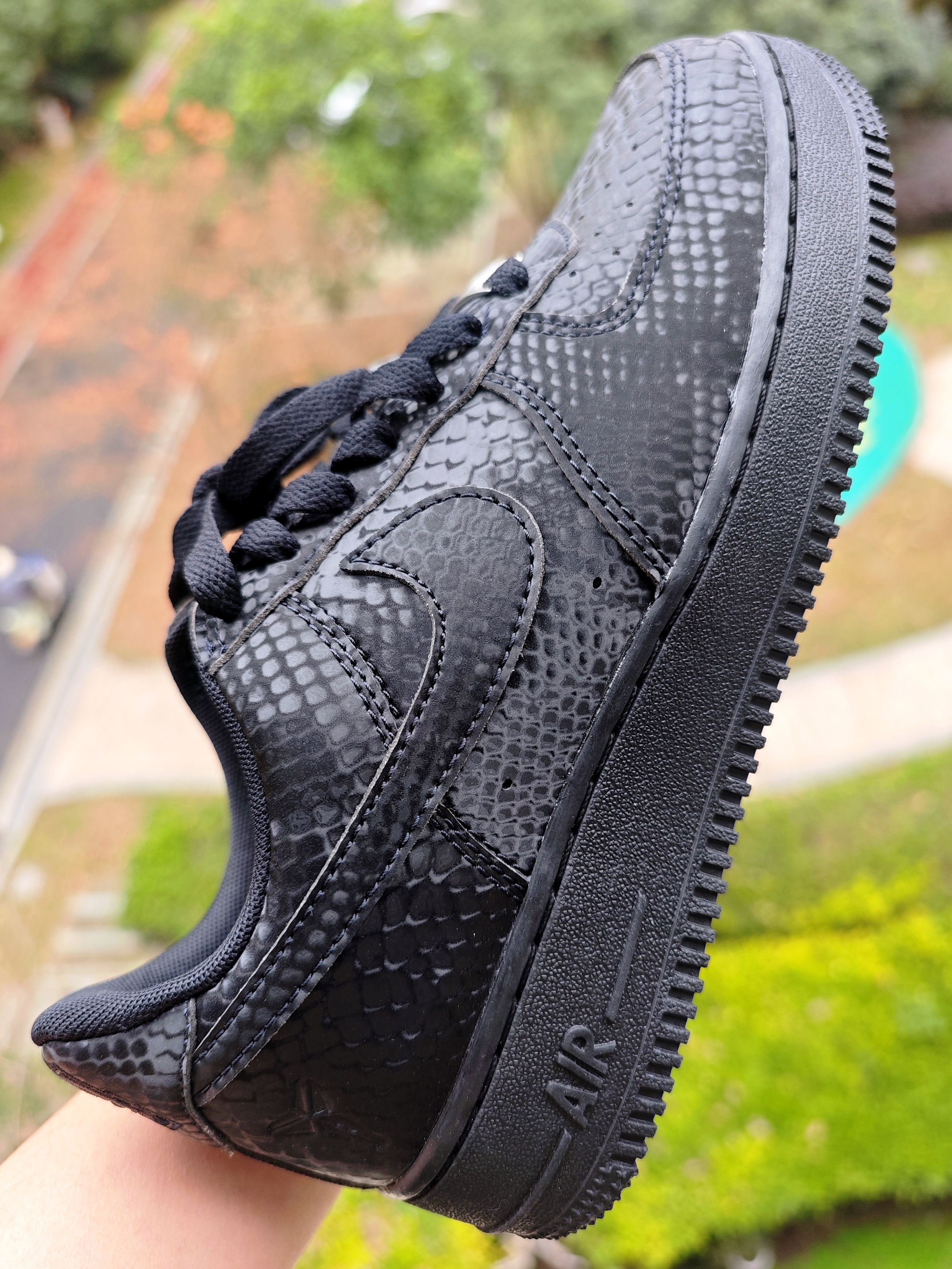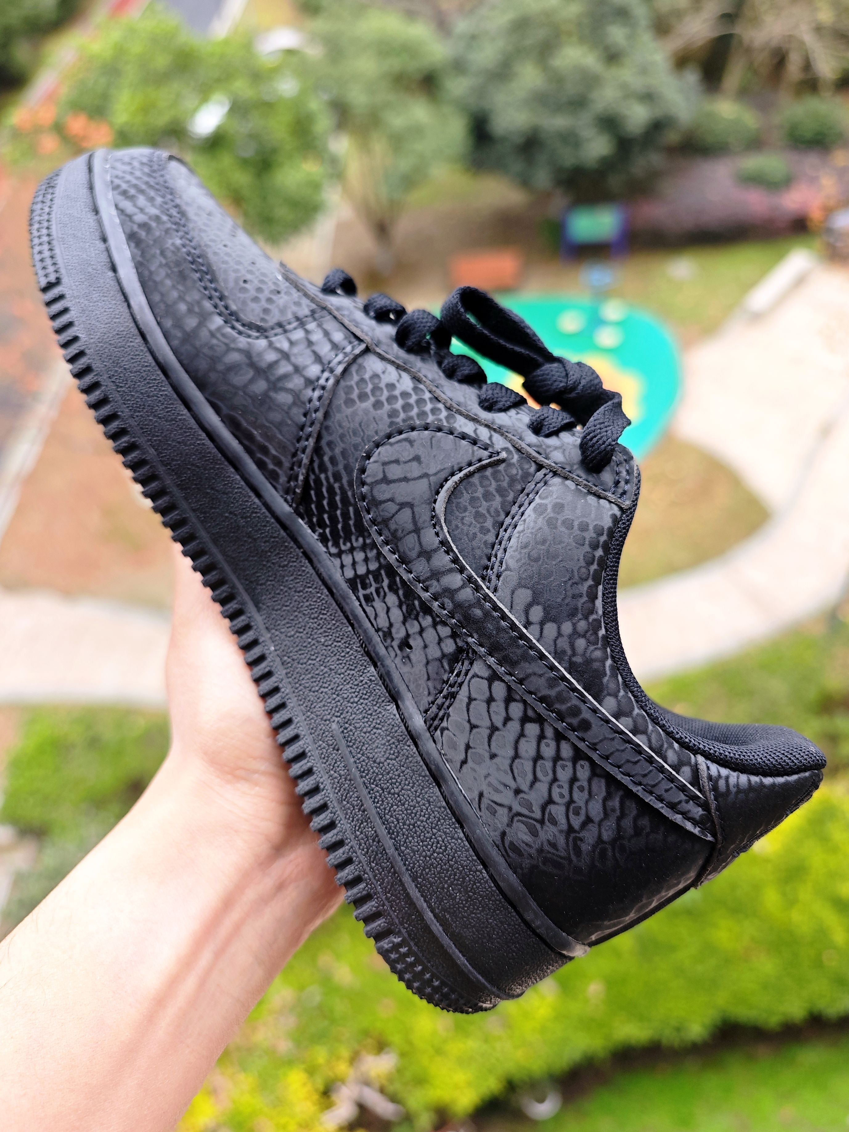 👀 其实科比空军一号已经出了很多款式了,一直观望没出手购买,就是在等黑色的🐍黑曼巴空军,这回是真如愿以偿了。 看图会觉得鞋身表面纹路是类似翻毛皮那样不光滑的,会很不好打理,但是,当你上手🤲模一下,你就会发现,其实是光滑的鞋身,很好打理,蛇鳞片是设计在光滑鞋面上的,真的是好看又好打理。 鞋后跟的8和24,前面的小鞋带扣 mamba和forever,满满的曼巴精神,真的太喜欢科比的...