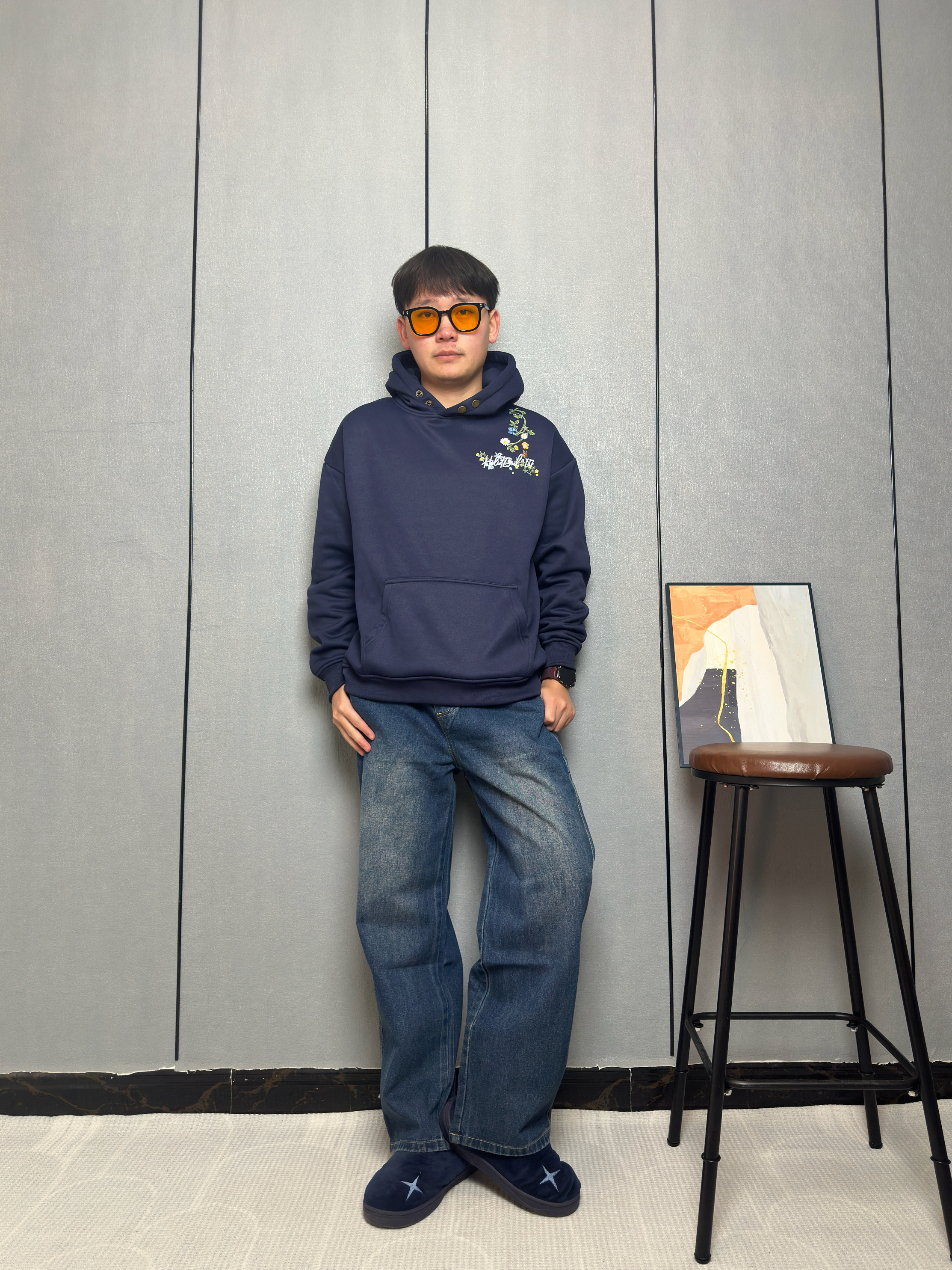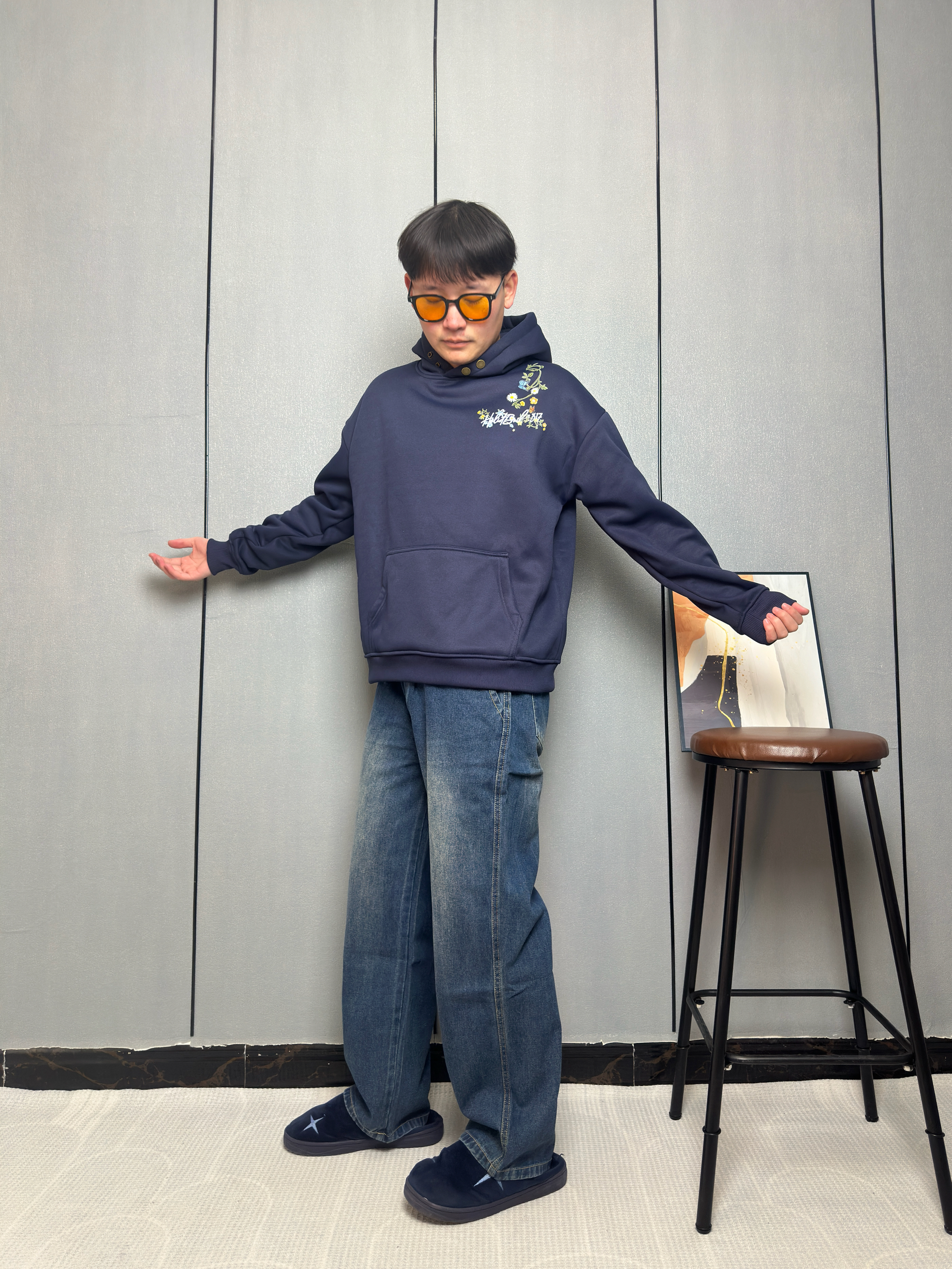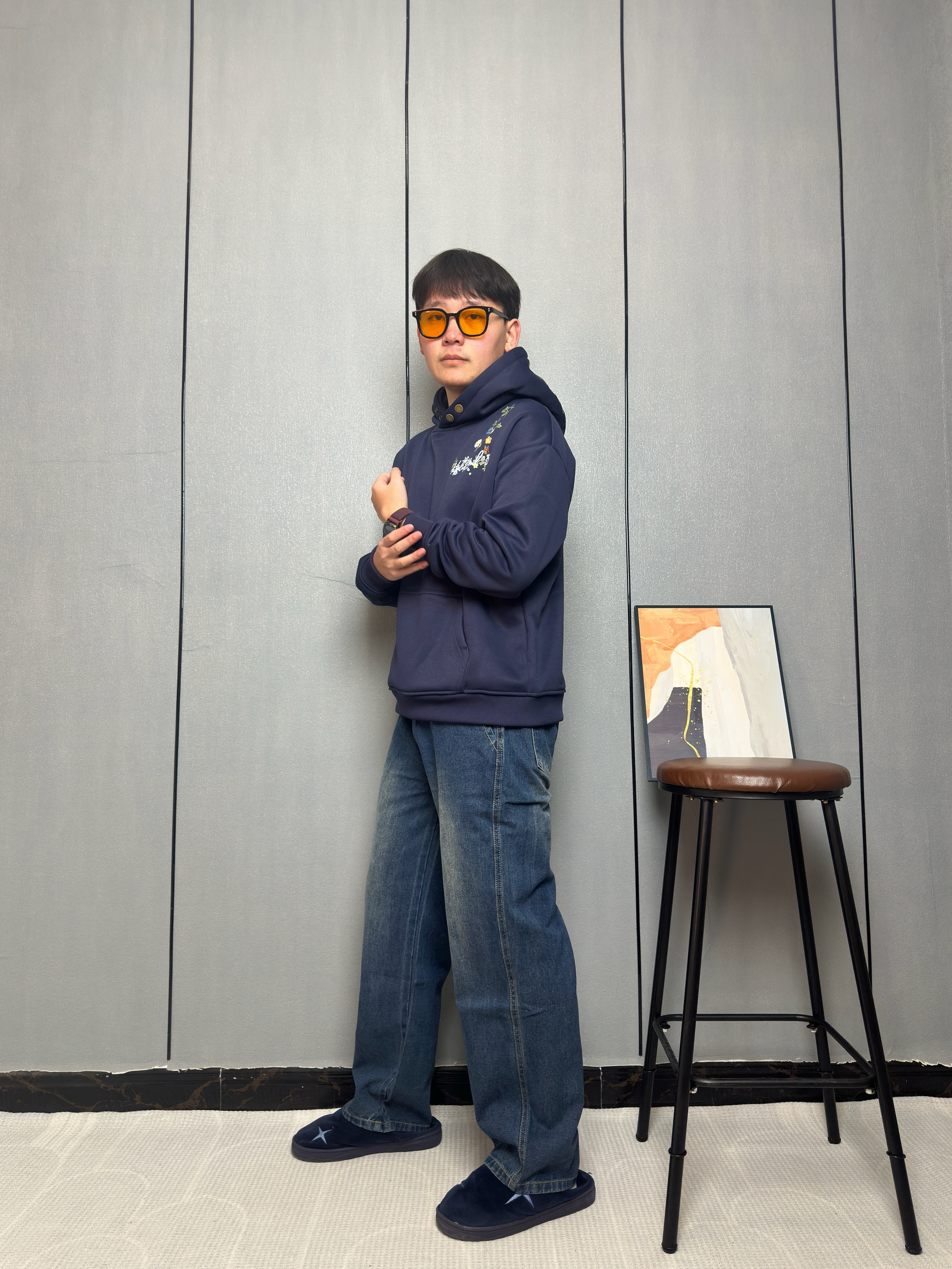 今天穿了一件藏青色连帽衫,胸前的小刺绣是亮点 简单又有细节,满满的刺绣漏出活力 搭配一条做旧阔腿牛仔裤,垂感很好 和宽松的卫衣很搭有种随性的少年氛围 给今天戴上一副橘色墨镜,增加了一点复古和个性 这种舒服又有自己风格的搭配 是我这几天喜欢的出行方式