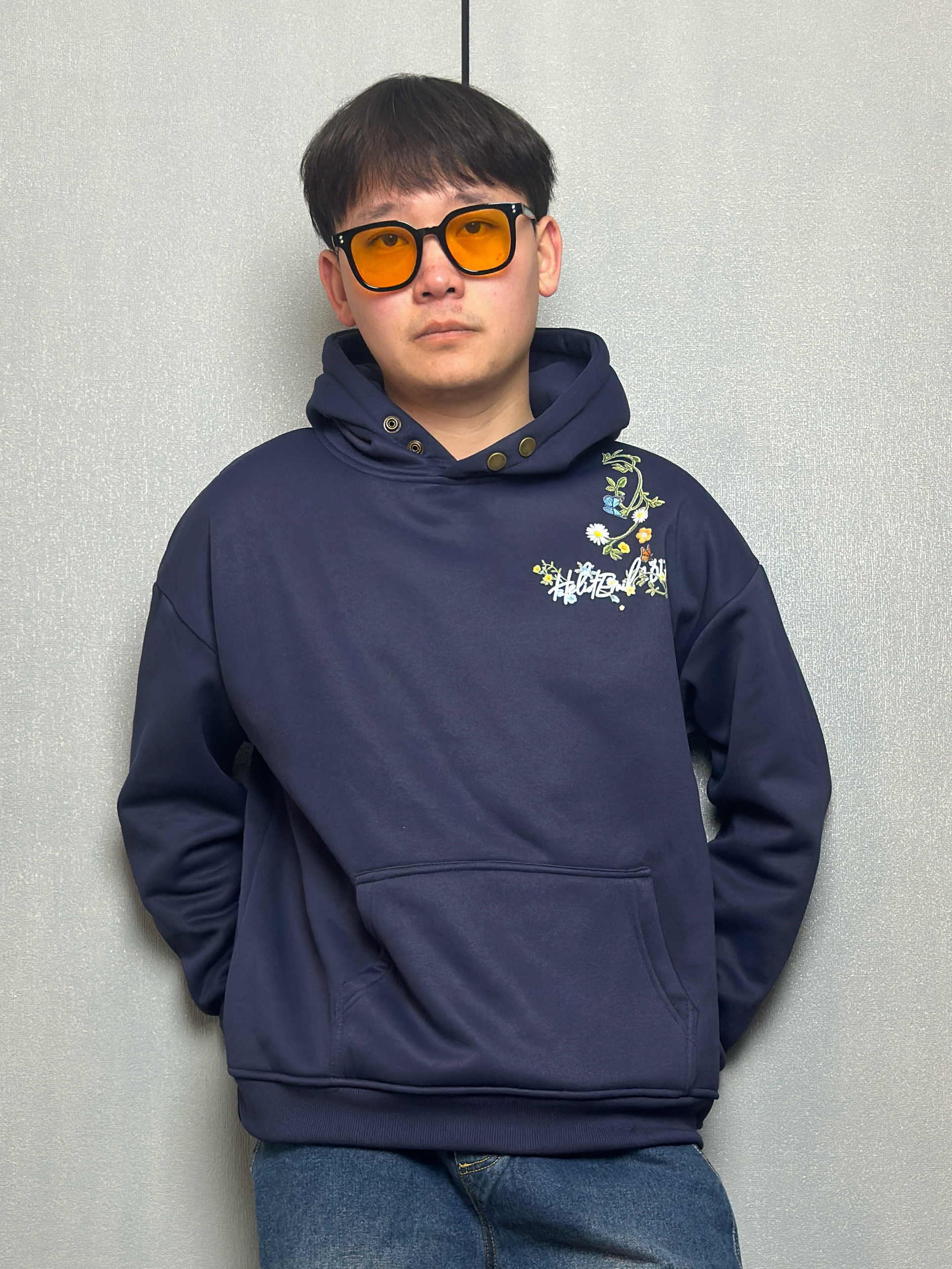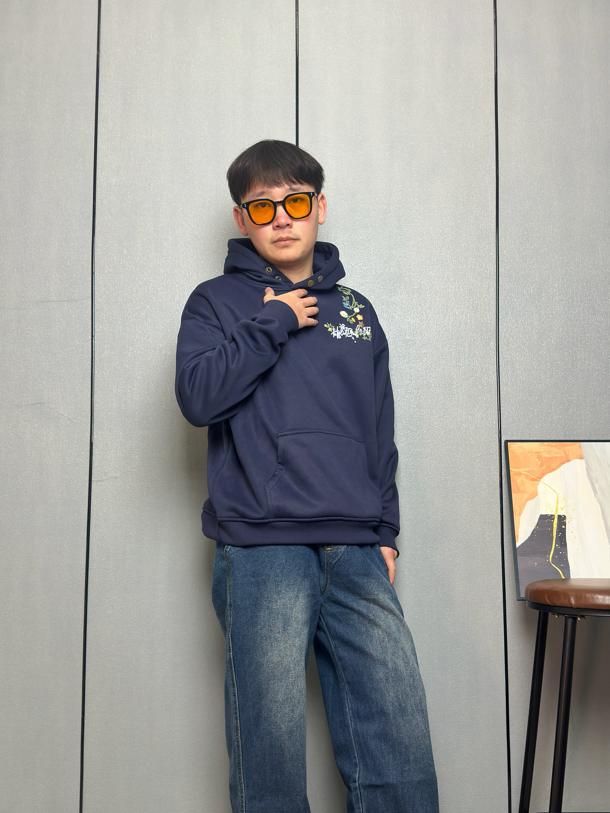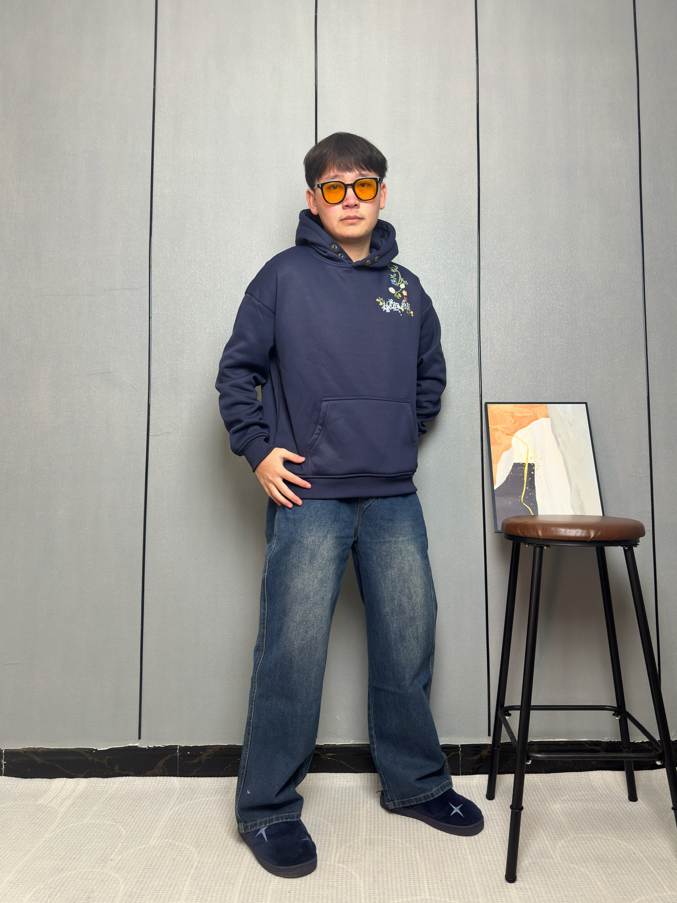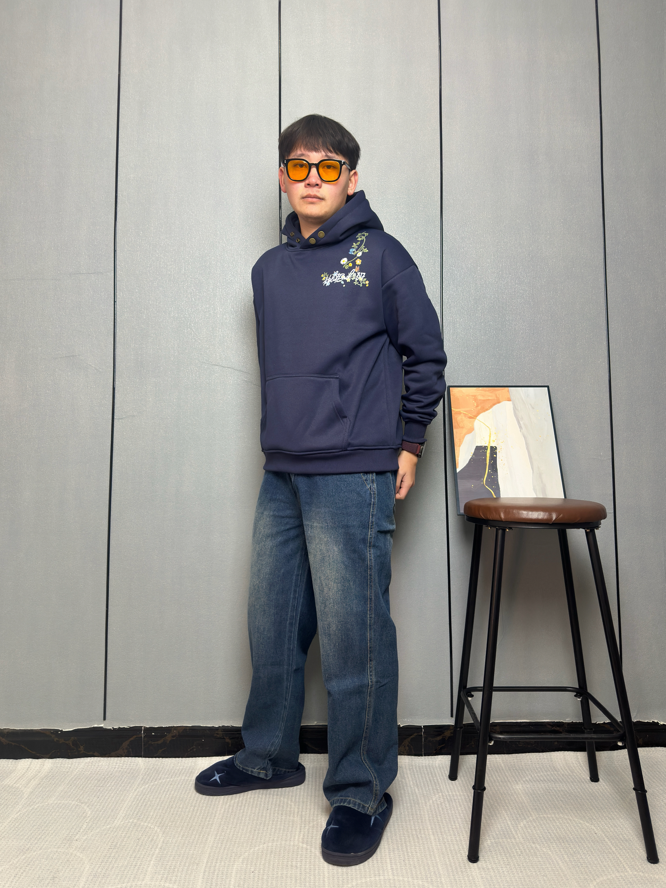 今天穿了一件藏青色连帽衫,胸前的小刺绣是亮点 简单又有细节,满满的刺绣漏出活力 搭配一条做旧阔腿牛仔裤,垂感很好 和宽松的卫衣很搭有种随性的少年氛围 给今天戴上一副橘色墨镜,增加了一点复古和个性 这种舒服又有自己风格的搭配 是我这几天喜欢的出行方式
