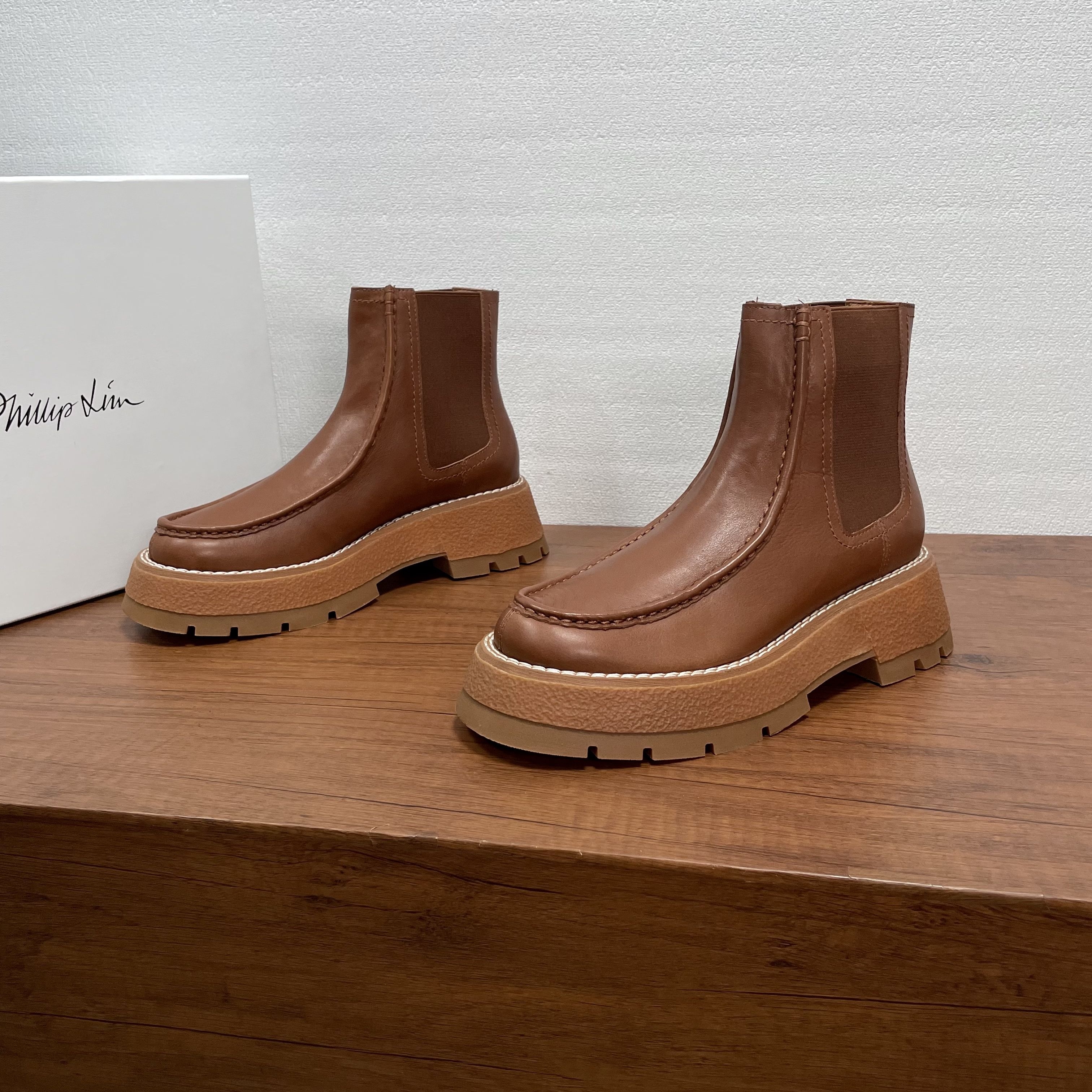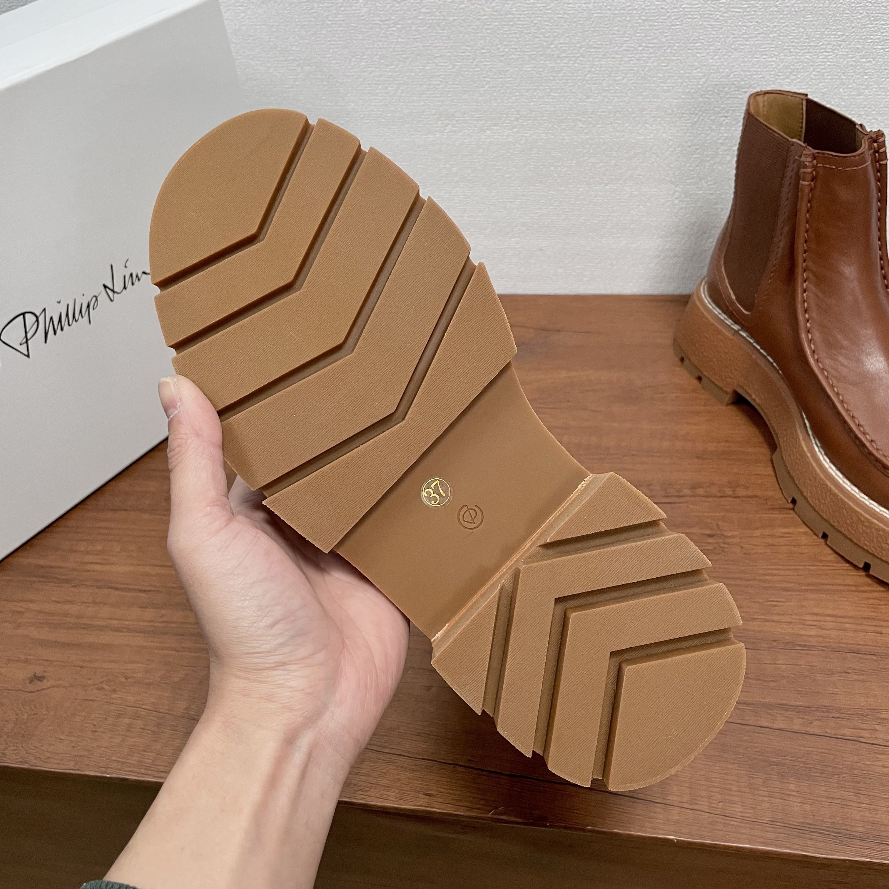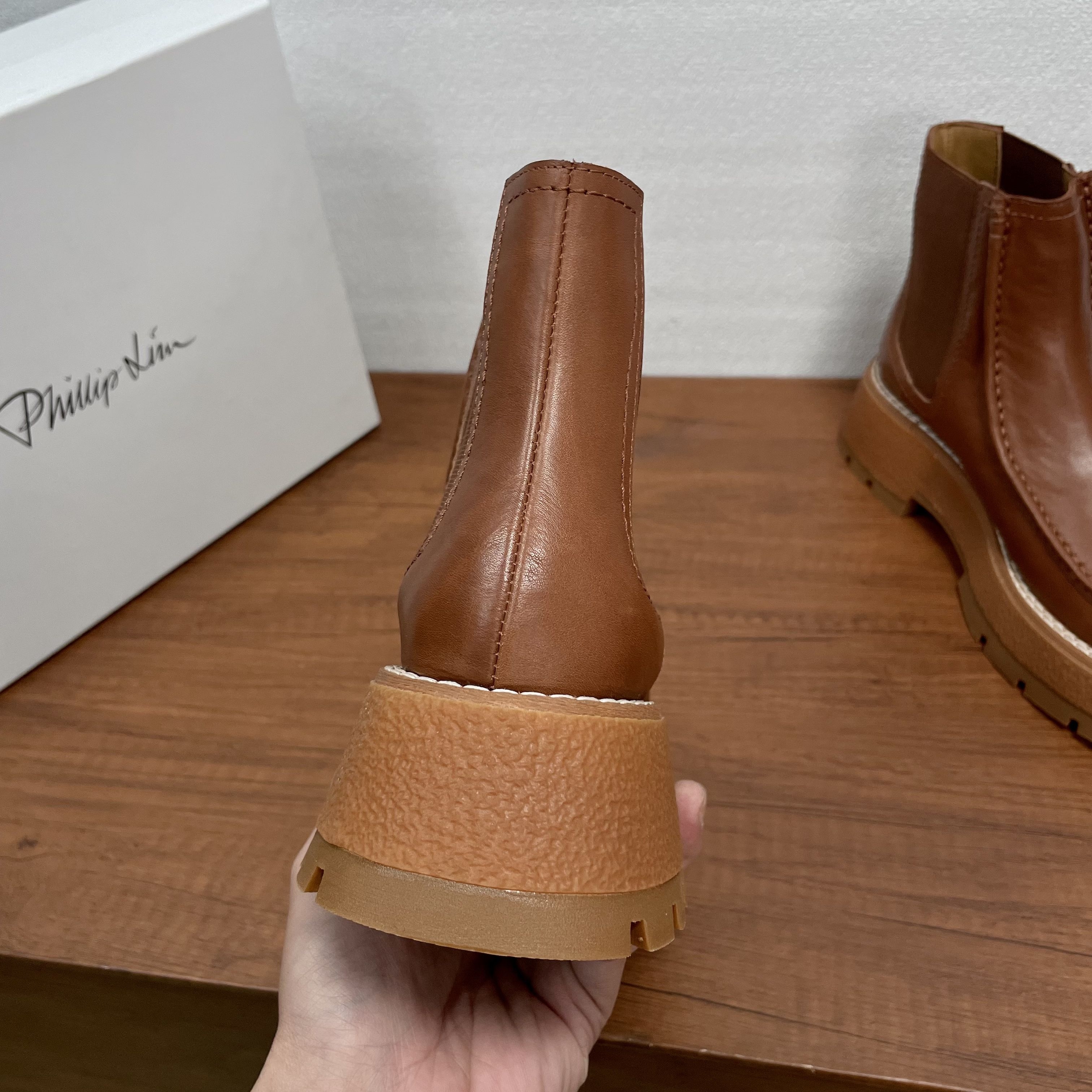 几天后,我在一位设计师朋友的展厅里,再次见到了它。它就随意地放在一张胡桃木长凳上,旁边是印着“3.1 Phillip Lim”的白色鞋盒。朋友说,这是美国设计师品牌,很多人的心头好。我拿起它,很轻,比我预想的轻很多。我摸了摸鞋面,是进口的头层牛皮,触感细腻温润,带着皮革自然的纹理,不是那种亮得发假的漆皮。靴筒侧面的弹力布质地紧密,我试着用手撑开,回弹力很好。我注意到它的厚底,是EVA橡胶材质,朋友说跟高大约5厘米,但前掌部分就有3厘米厚,这种设计让脚掌的倾斜度很小,走起路来会非常平稳。