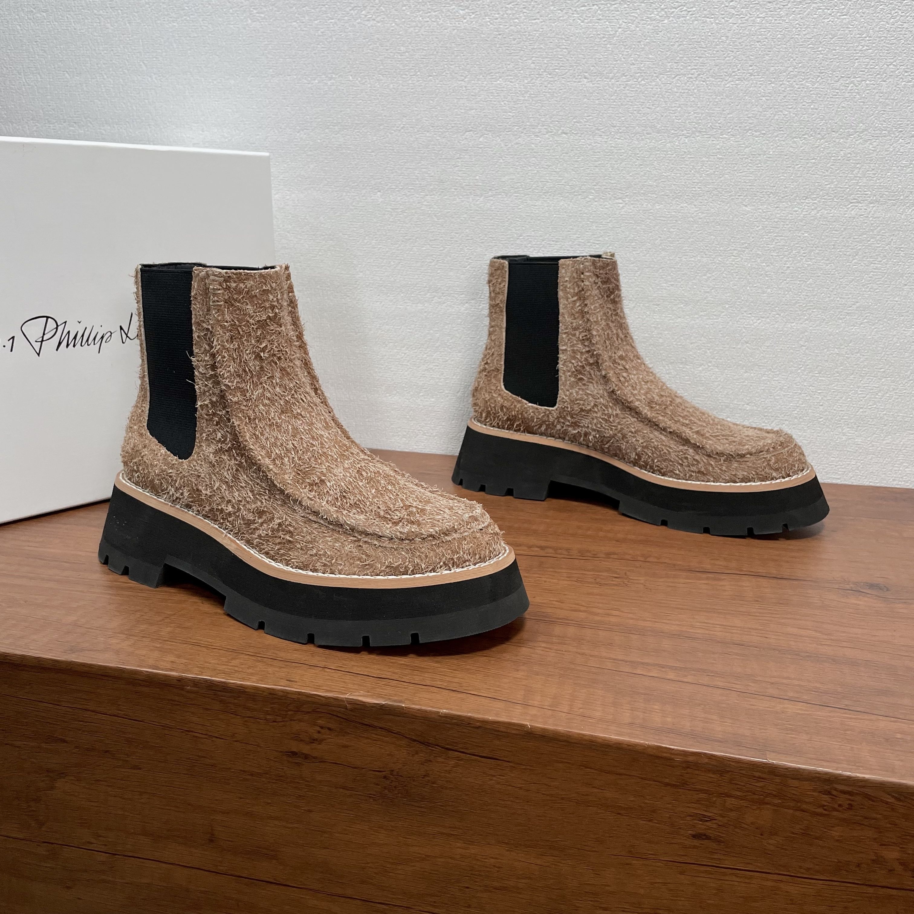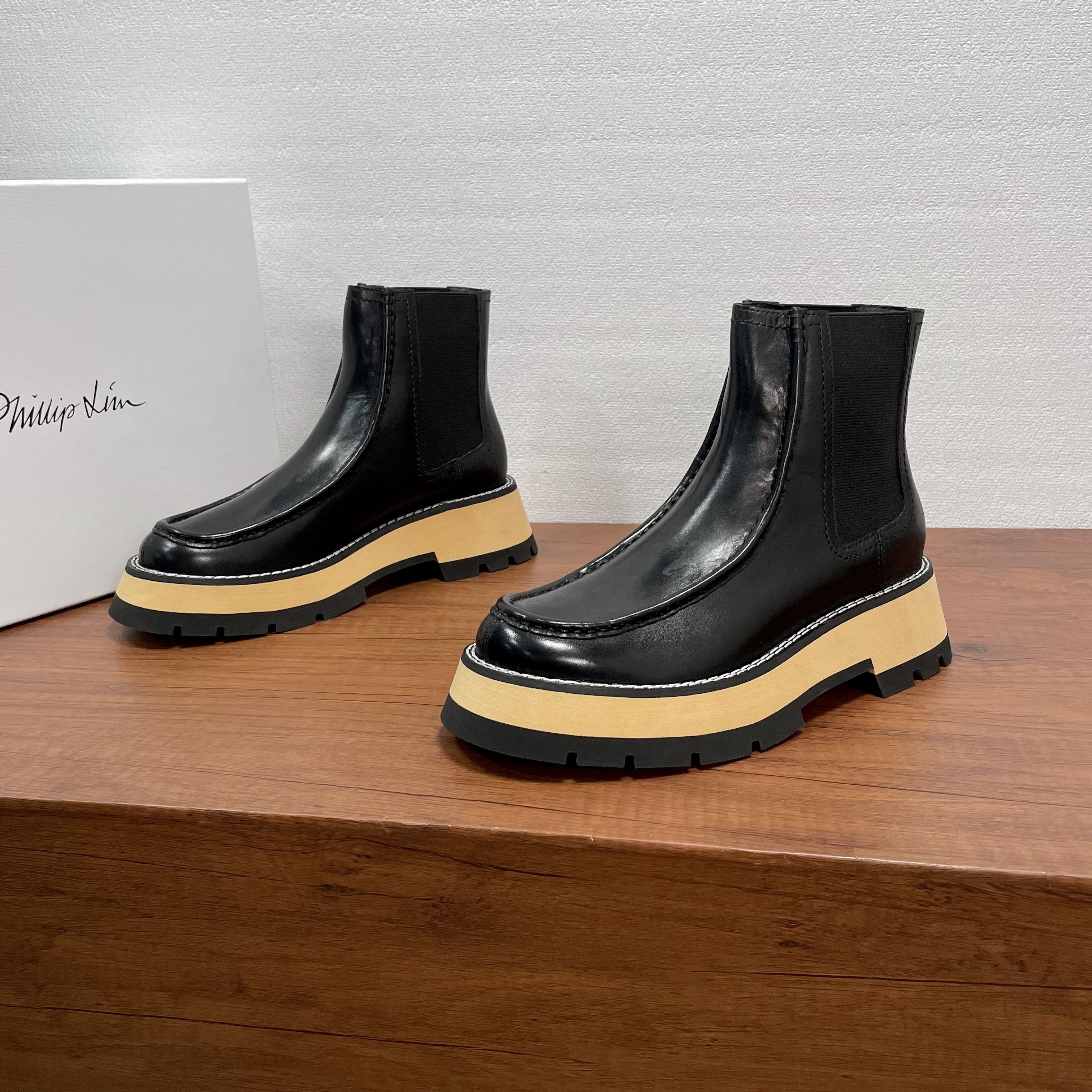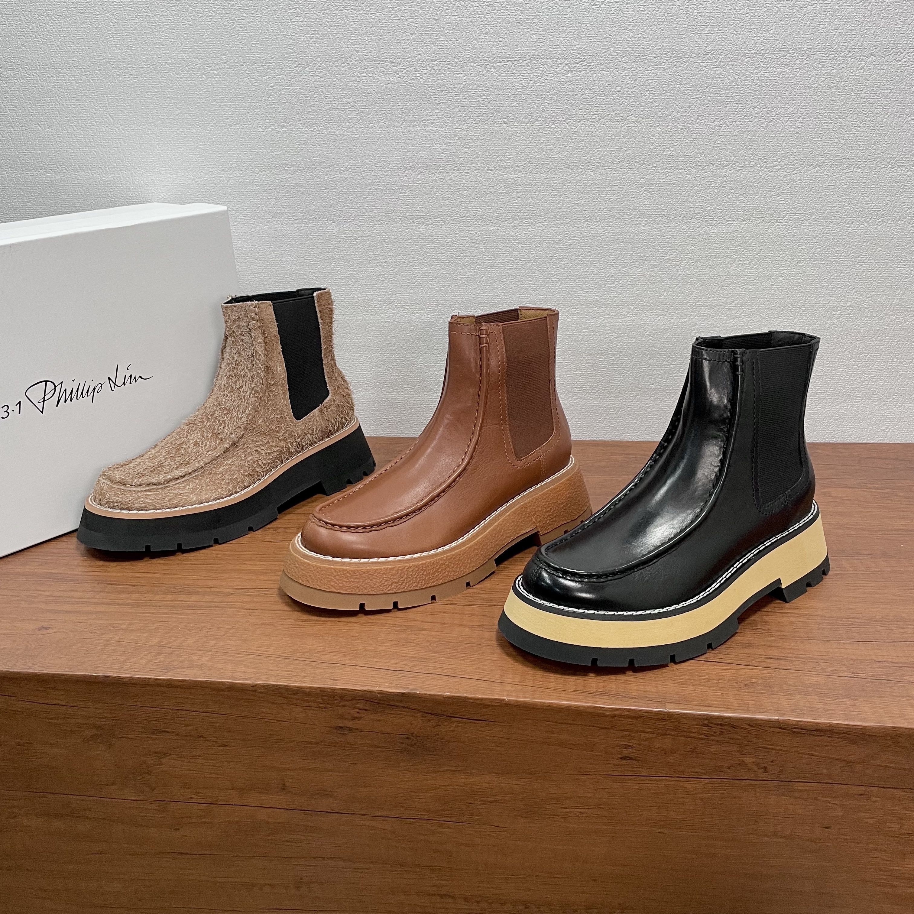 几天后,我在一位设计师朋友的展厅里,再次见到了它。它就随意地放在一张胡桃木长凳上,旁边是印着“3.1 Phillip Lim”的白色鞋盒。朋友说,这是美国设计师品牌,很多人的心头好。我拿起它,很轻,比我预想的轻很多。我摸了摸鞋面,是进口的头层牛皮,触感细腻温润,带着皮革自然的纹理,不是那种亮得发假的漆皮。靴筒侧面的弹力布质地紧密,我试着用手撑开,回弹力很好。我注意到它的厚底,是EVA橡胶材质,朋友说跟高大约5厘米,但前掌部分就有3厘米厚,这种设计让脚掌的倾斜度很小,走起路来会非常平稳。