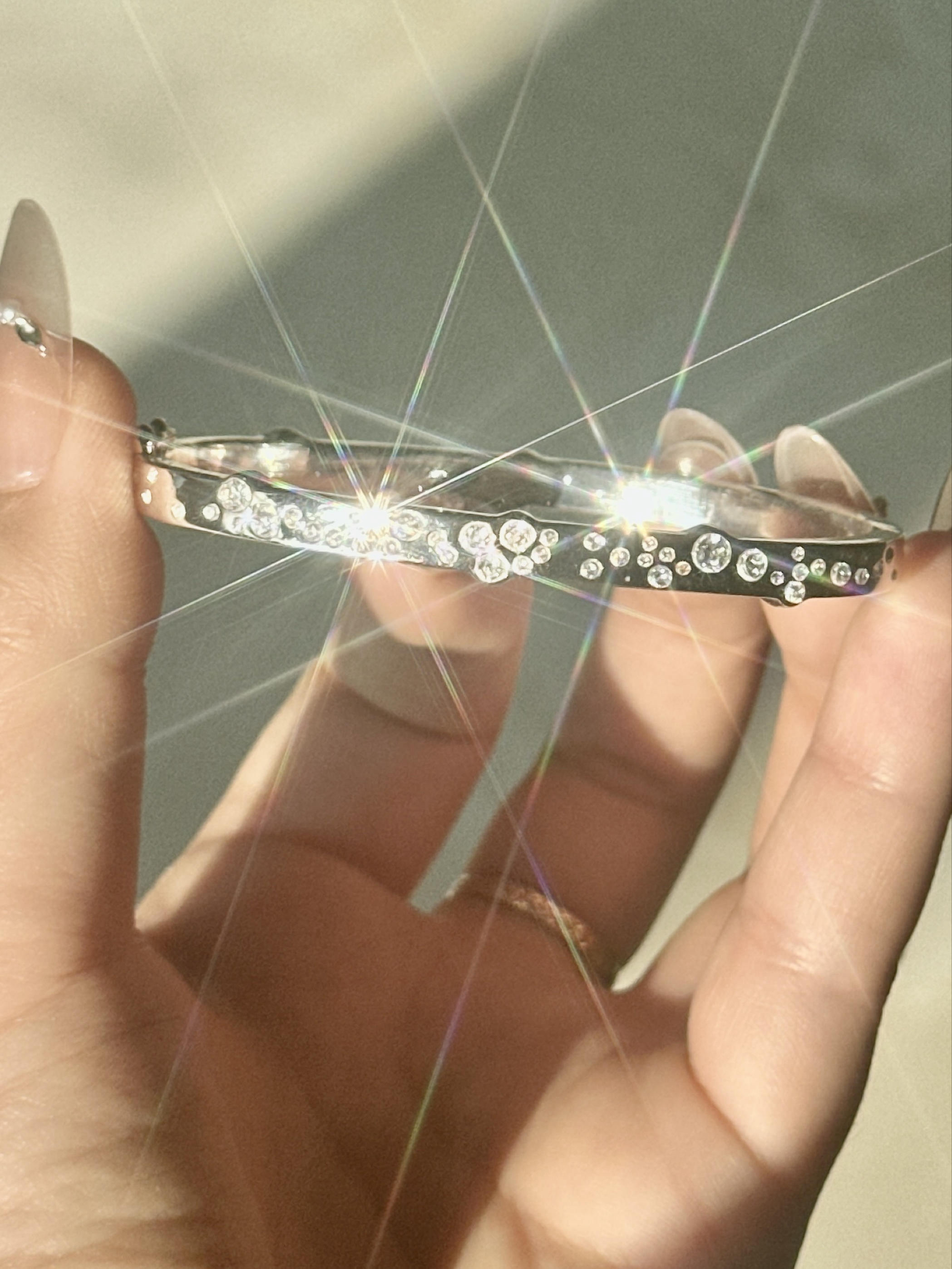 这小ck的泡泡手镯在阳光下简直光芒四射啦 一直很喜欢小ck的包包没想到手镯也这么美🥰 泡泡钻的设计很特别 阳光下一闪一闪的耀眼又夺目 不挑场合日常通勤还是约会都合适 不挑衣服随便搭都不违和 一遇到光手腕瞬间就多了一条星河✨
