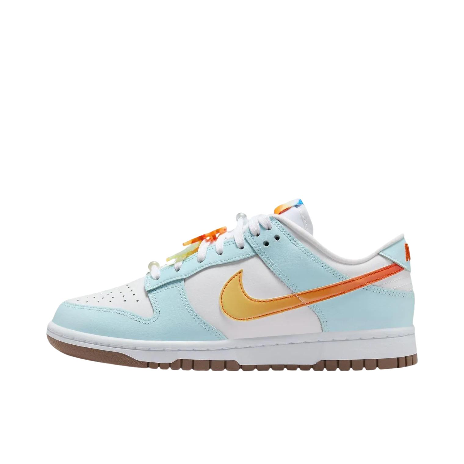 这双鞋的白浅蓝主调很清爽,搭配浅橙和黄色 Swoosh 细节,很有夏天的感觉。鞋带处的彩色装饰扣是个小亮点,增添了几分活力。 鞋型是经典的 Dunk 低帮,日常穿搭很百搭。鞋面采用皮革材质,触感柔软,鞋舌和后跟的填充也比较厚实,走路时对脚的包裹感不错。