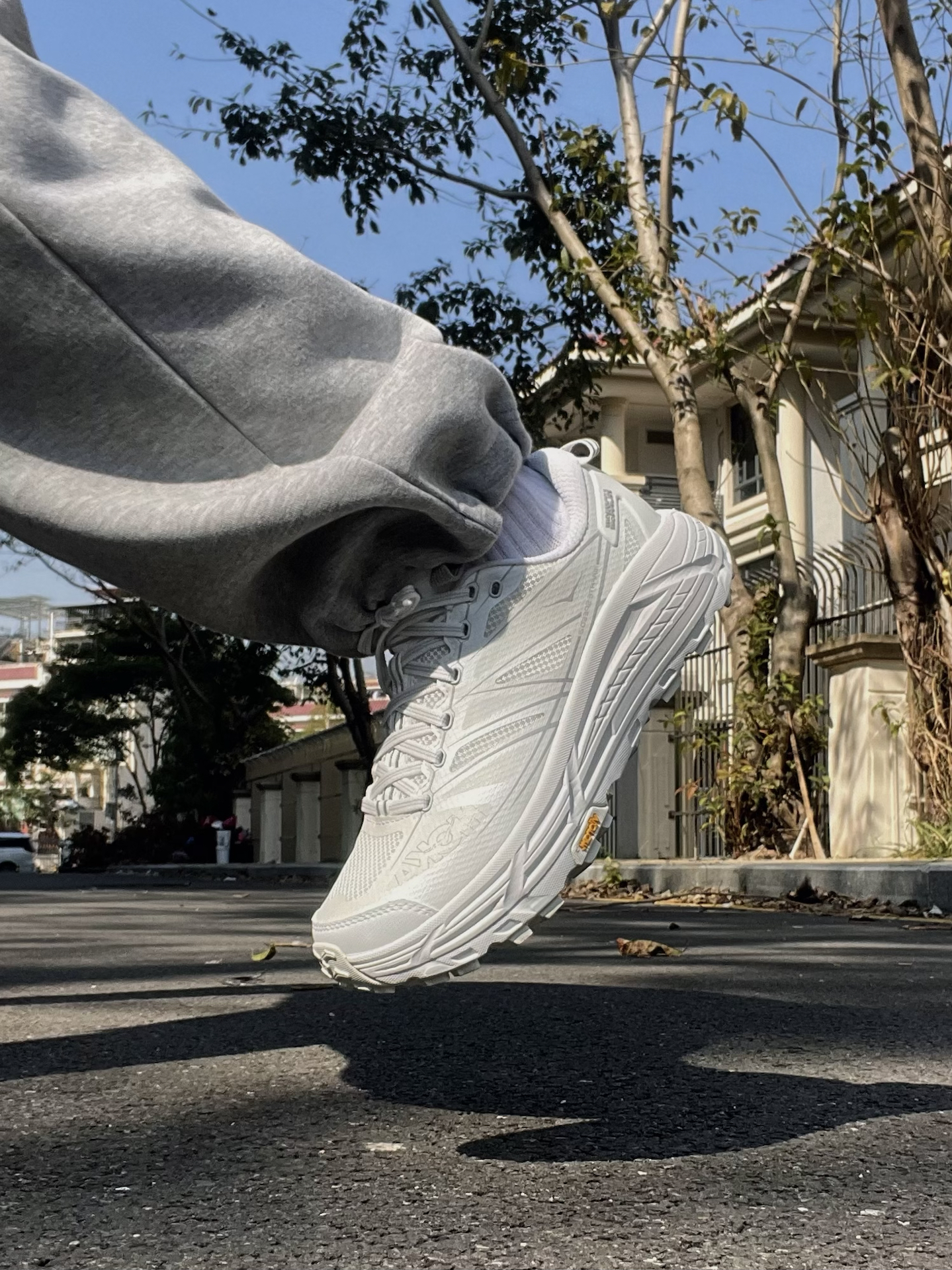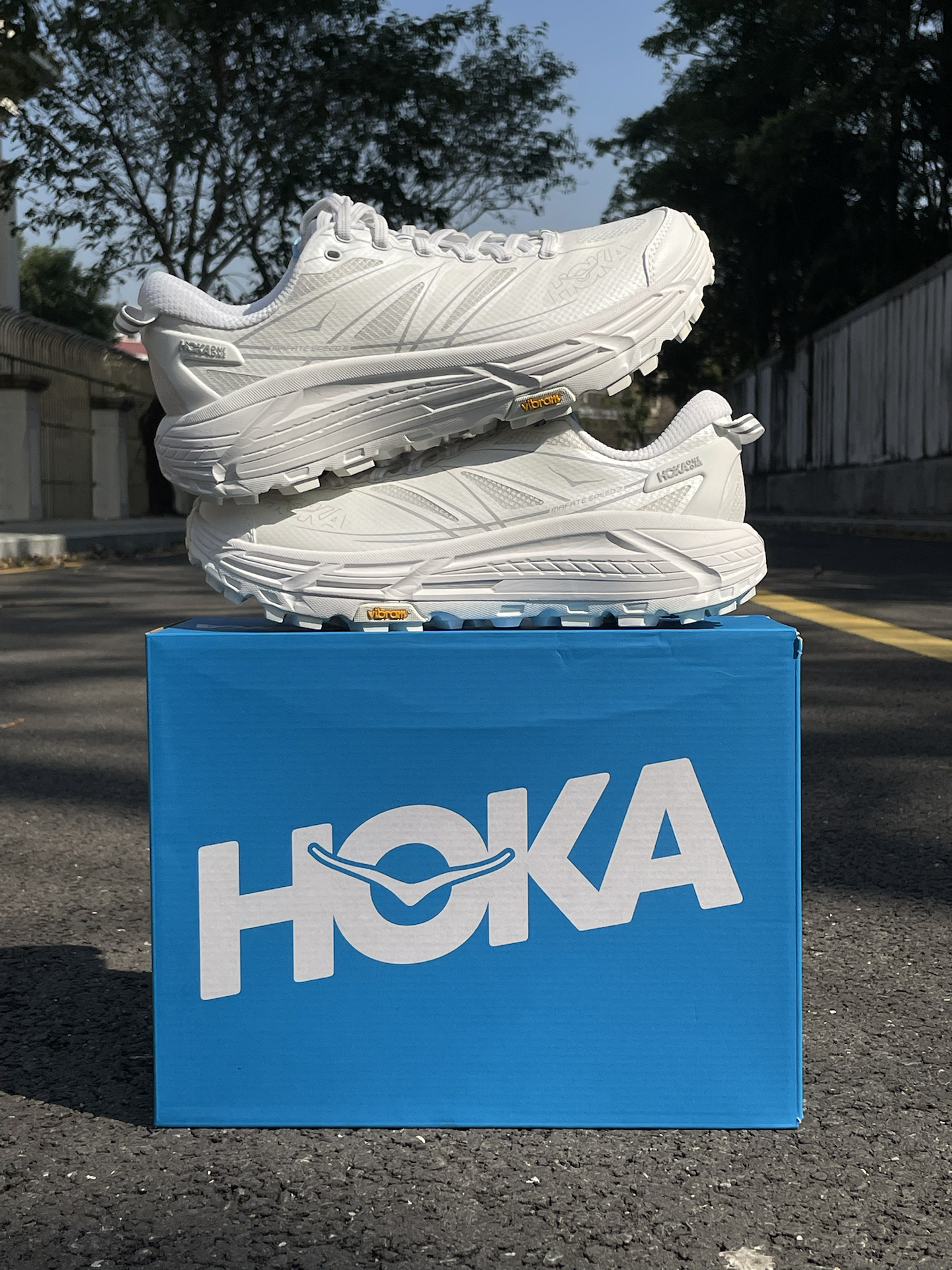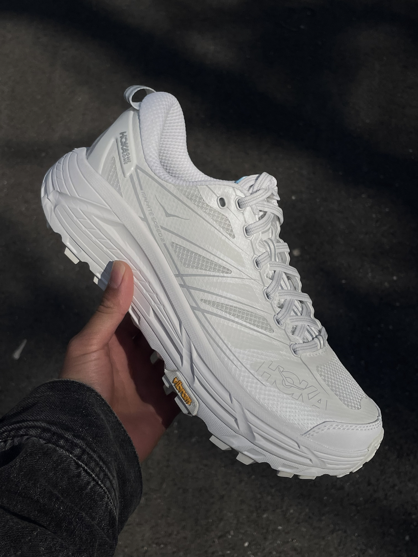 之前一直听说hoka的脚感很不错 一直很想试试,也终于买到了自己喜欢的配色了 这双mafate speed 2看着很大很厚 拿在手上却真的很轻太多了 选的白色清爽又干净 而且超厚的鞋底直接让你增高5cm 大底来自Vibram,防滑耐磨不用说啦! 今天拿到阳光下拍几组照片! #2025年度鞋王