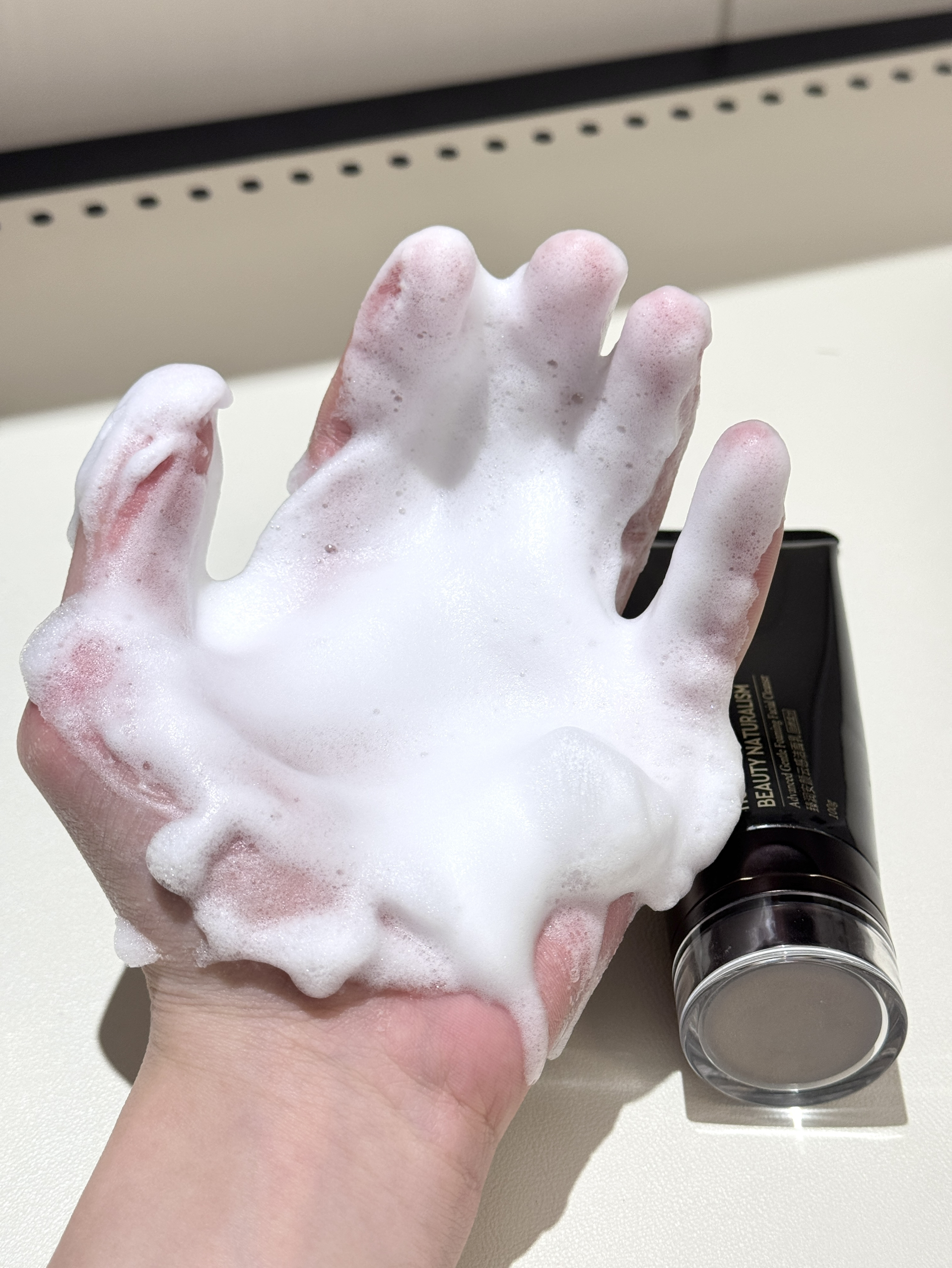一到冬天我mm皮简直陷入地狱了 不过当我拿出HBN氨基酸洗面奶 去皮泛红你还能拿我怎的! 挤出来的质地很像酸奶一样 很丝滑 加点水揉搓一下就可以产生绵密的泡沫 上脸洗完真的很舒服 洗完不会紧绷拔干 这个冬天有救啦