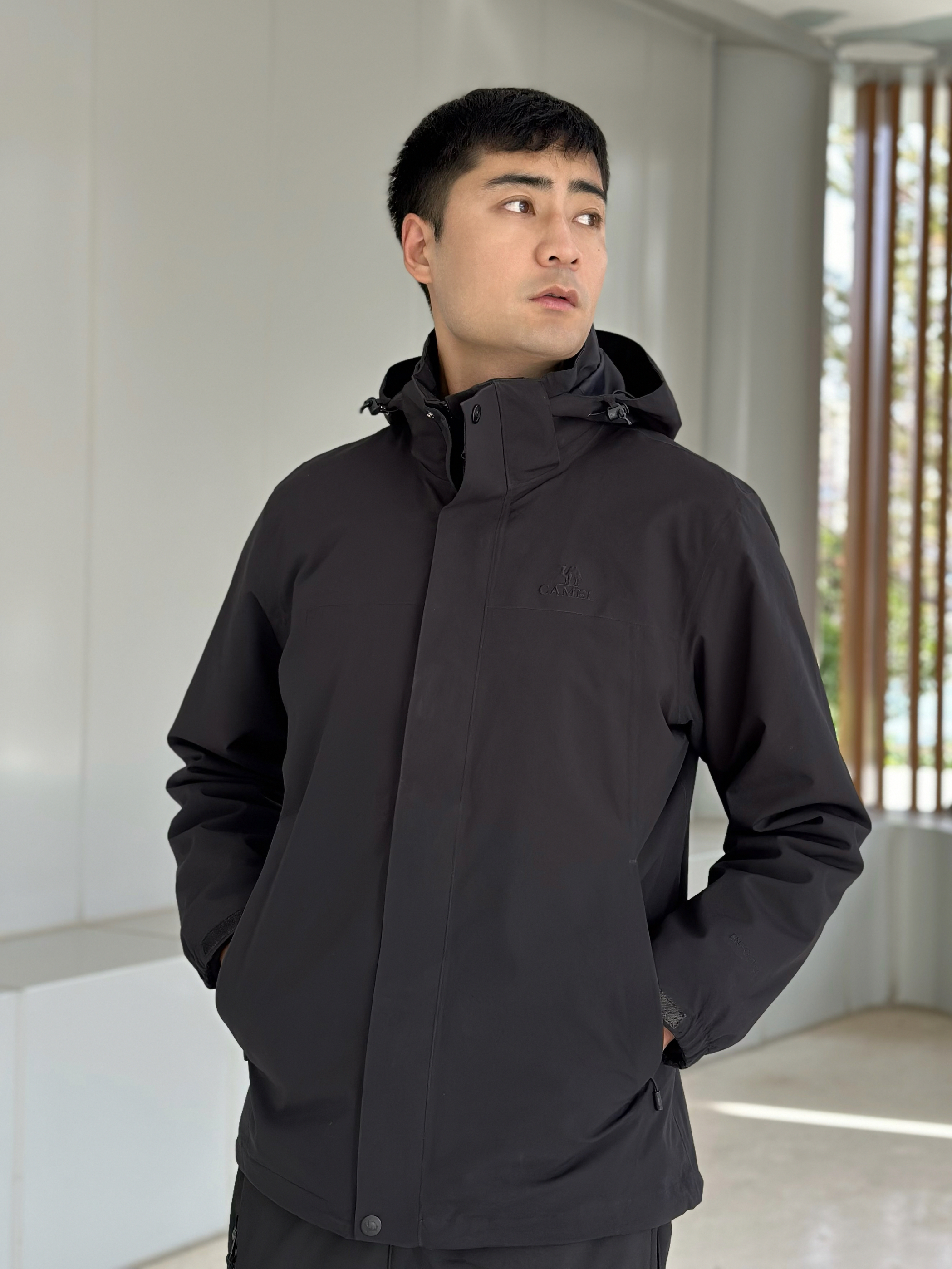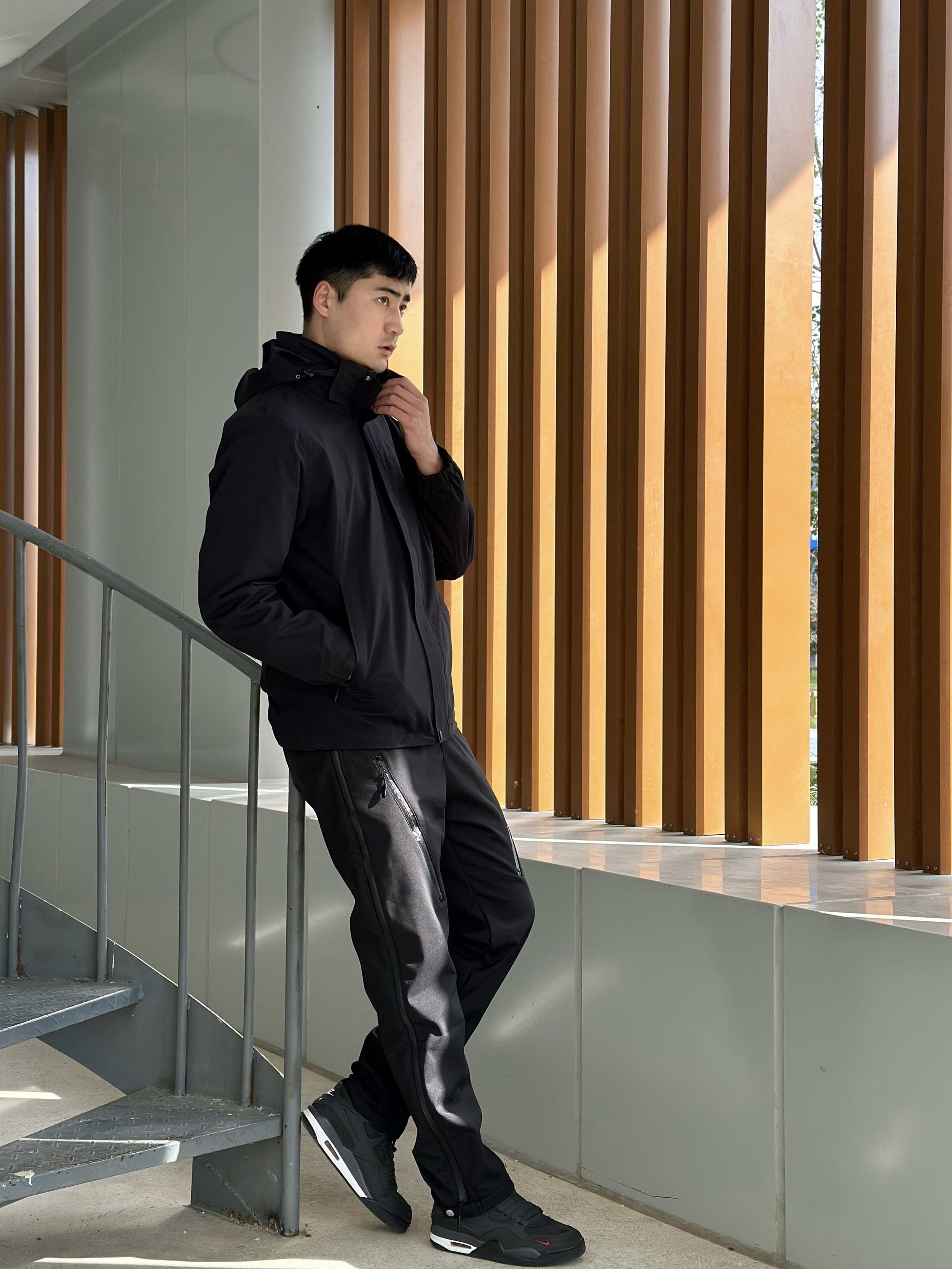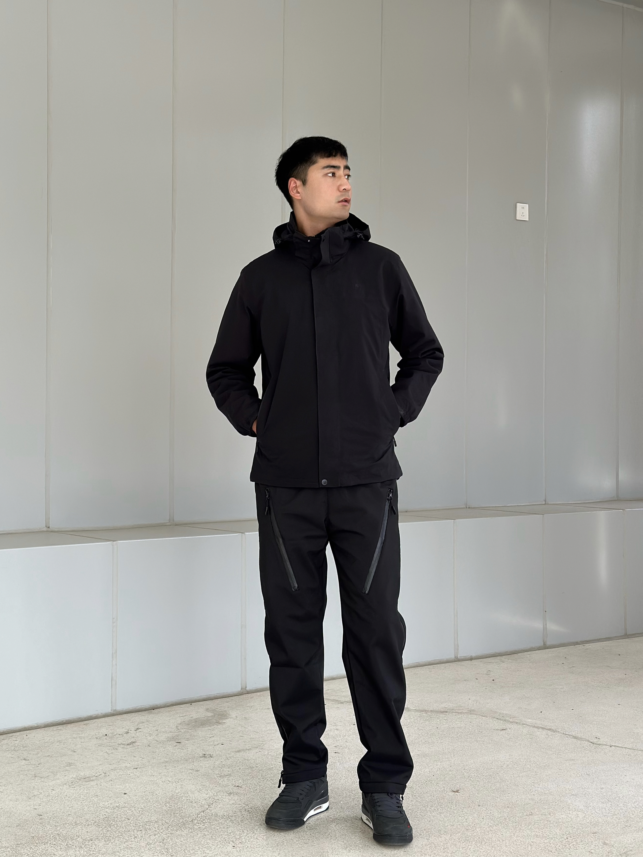 All Black与机能风碰撞出2025硬核的潮流语言! 上身一件三合一硬壳冲锋衣,外壳是硬壳的,防水和防风都不差,抓绒内胆轻松锁住温度。 下身搭配同色系机能加绒裤,版型偏修身硬朗一些,面料同样可以应对小雨,再踩一双厚底黑武士板鞋,一身All black拔高气场! 不过上衣有点沾灰,需要注意哈,但这一身的功能性与简约酷感,但是深色系的搭配与机能风的实用性,依然让我爱不释手~