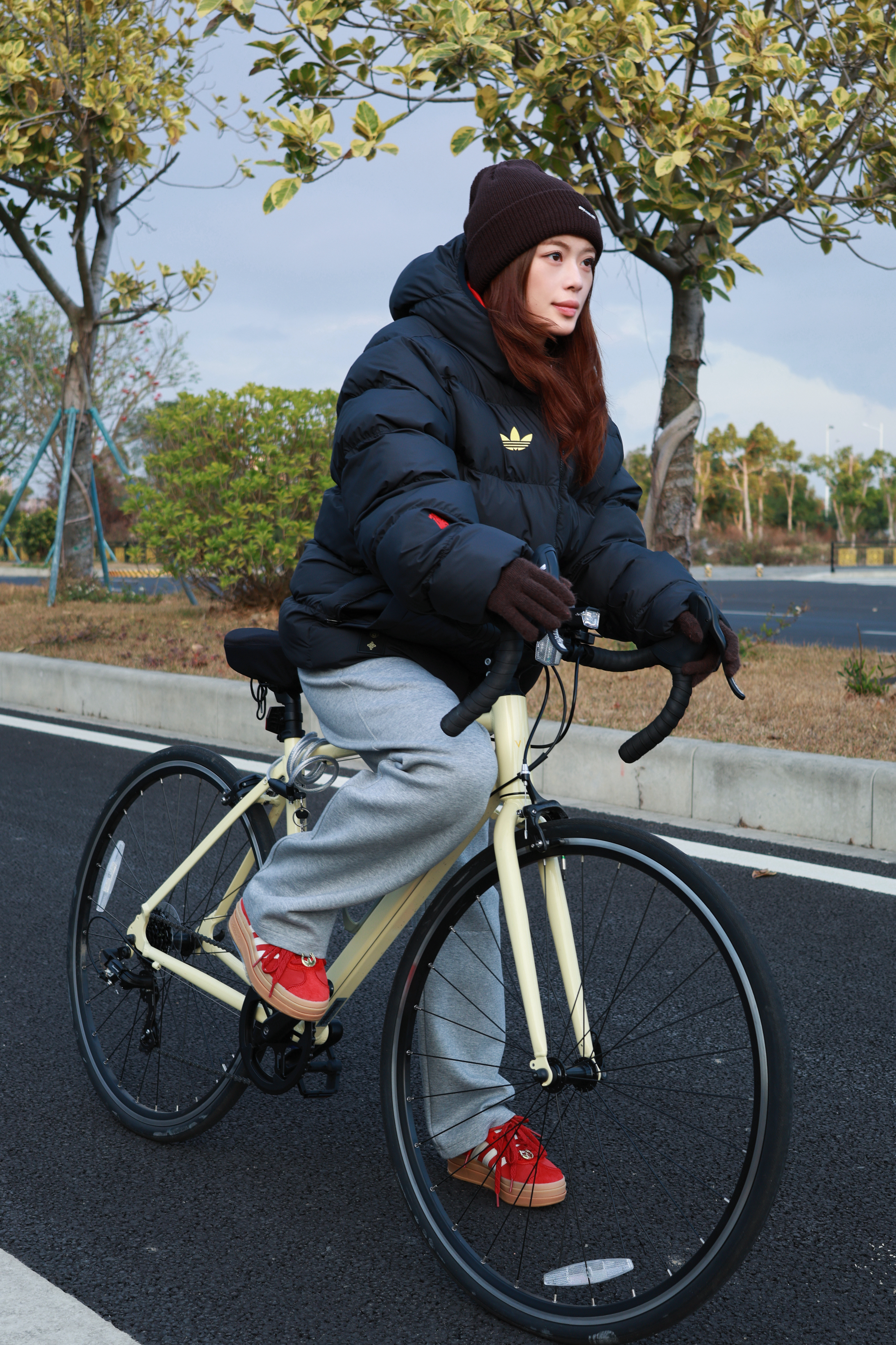 新年的劲还没有过完 休闲骑行当然也要有新年仪式感啦 今天的骑行look分享🚴 外套🧥选择一件黑色面包羽绒服 该说不说骑行保暖还得是面包服 穿上一点风也透不进来🌬️ 裤子👖选择一条灰色系的直筒休闲 百搭方便💼 日常通勤、骑行两不误 鞋子👟穿一双马年限定厚底板鞋 大红色🎈真的好有新年氛围呀 配饰选择一顶棕色针织帽➕纯棕手套 偷偷说 ✨手套是做了小心机设计 可以直接触控手机 不用冻手啦🧊 这...