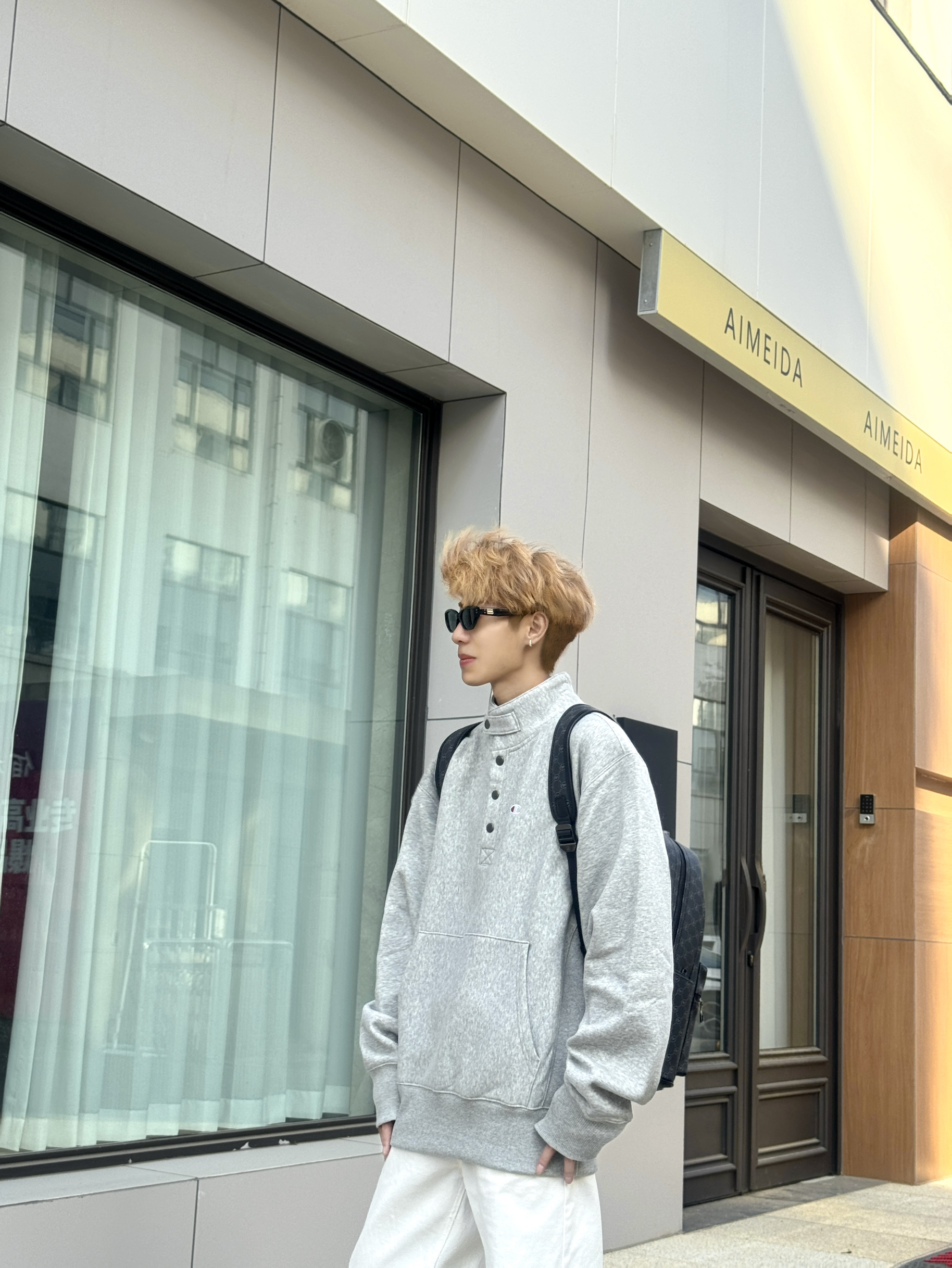 韩系出门我只穿帅的 出门简约一套立领灰色卫衣穿搭 轻松拥有秋日松弛感 再搭配条白色牛仔裤 清爽又时髦