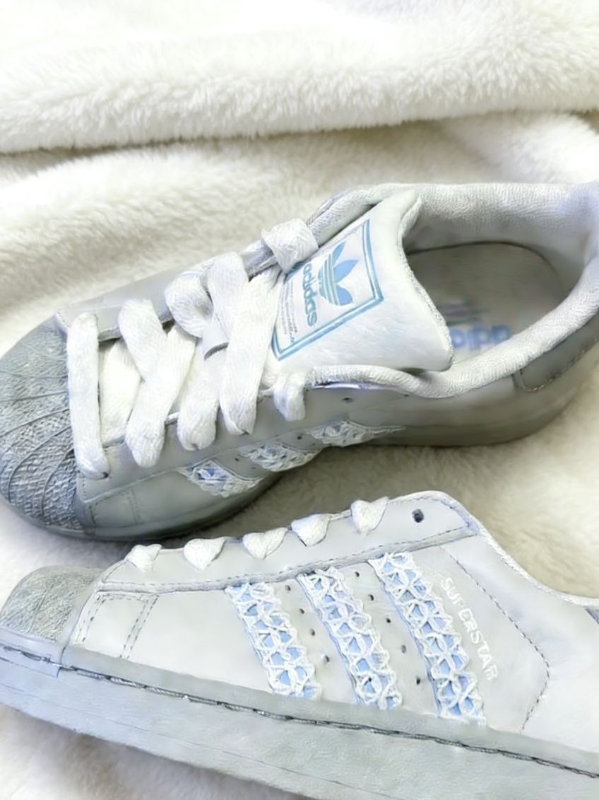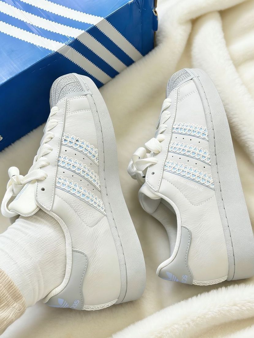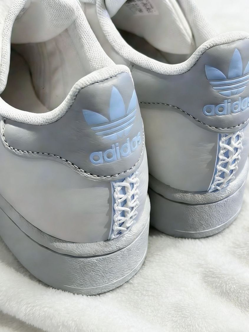 这双雾霾蓝阿迪贝壳头直接戳中我的少女心!米白拼浅灰的鞋身搭配冰蓝编织三道杠,摆在白色毛毯上看质感超温柔,经典贝壳头造型还带着小设计感,搭白色连衣裙、浅灰色卫裤都能完美适配。 上脚的体验比普通贝壳头好太多,本以为贝壳头鞋头会硬邦邦,结果鞋垫软弹有支撑,周末穿它出门逛甜品店走了一下午,脚底板一点都不酸,鞋帮的填充也很饱满,第一次穿也没磨脚后跟。头层皮的鞋面透气性意外不错,春天穿薄袜也不会闷脚,就是...