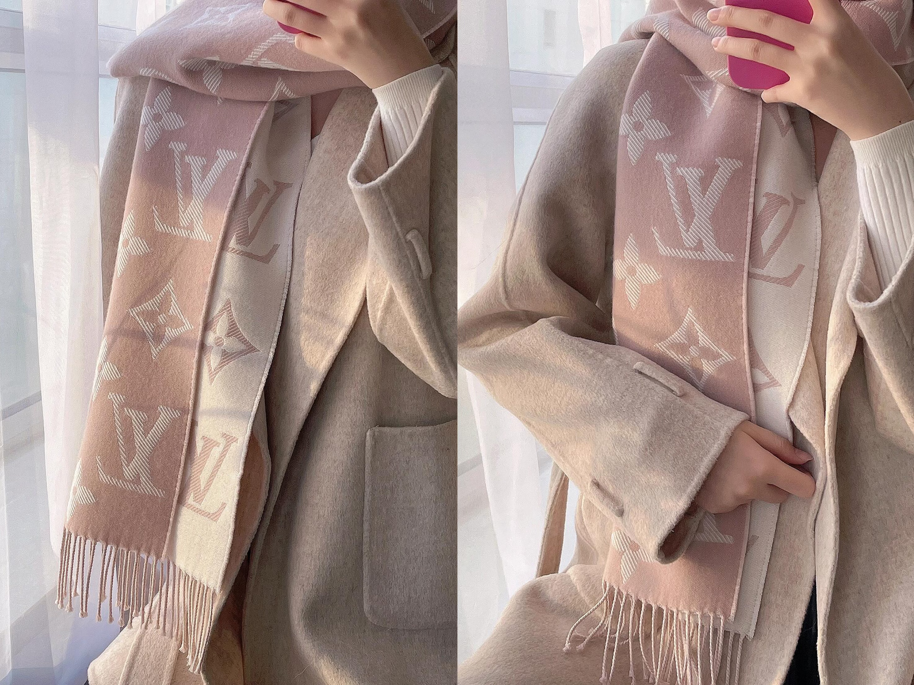 浅粉色系的LV围巾真的太绝了💕 软软糯糯的质感,搭配浅燕麦色大衣,一整个温柔住! 围巾上的渐变老花图案超有层次感。它既保暖又能提亮整体造型,是秋冬氛围感的神来之笔。 不管是日常通勤还是周末约会,这种配色都不会出错。 💡 小Tips: • 燕麦色大衣 + 白色内搭是万能公式 • 同色系的配饰能让整体穿搭更高级 • 这种浅粉色围巾对黄皮也很友好哦