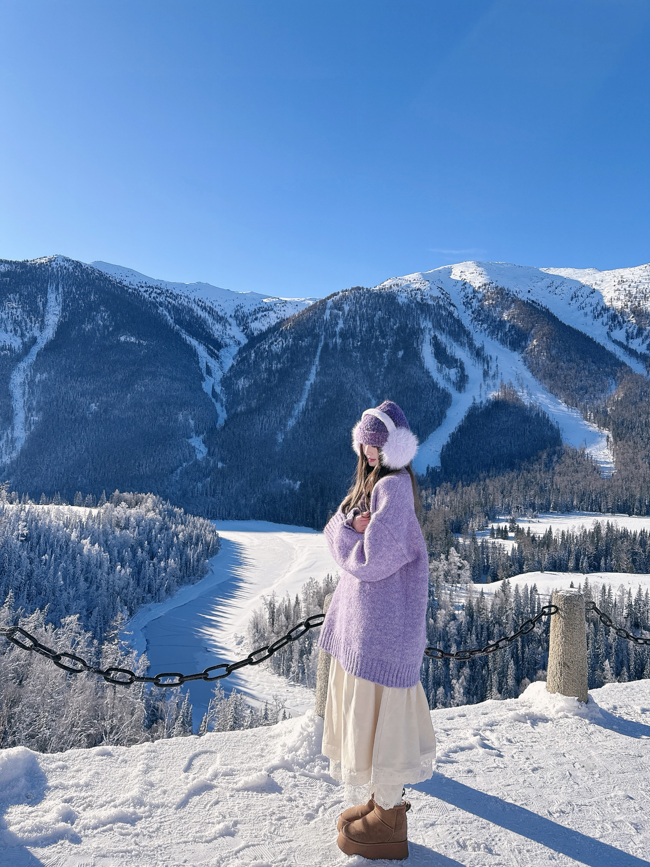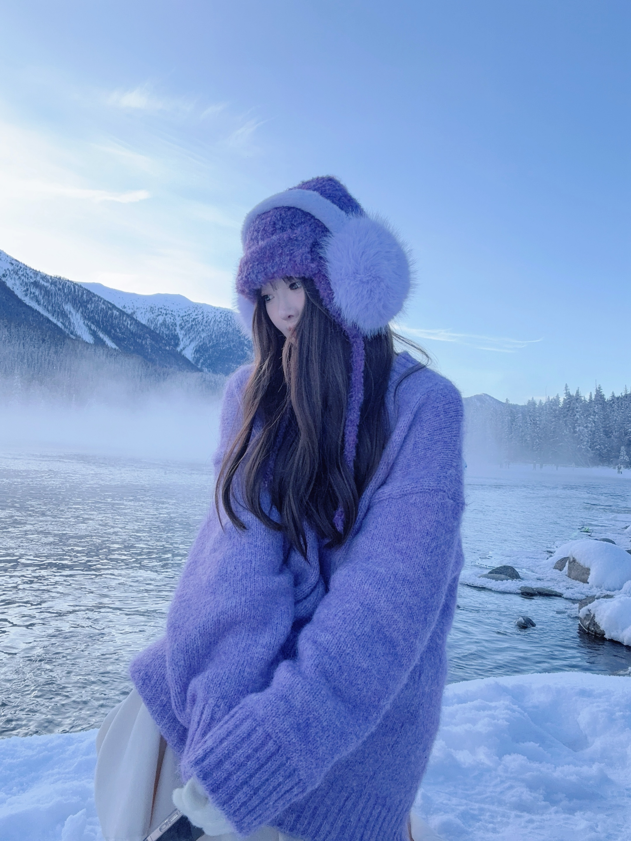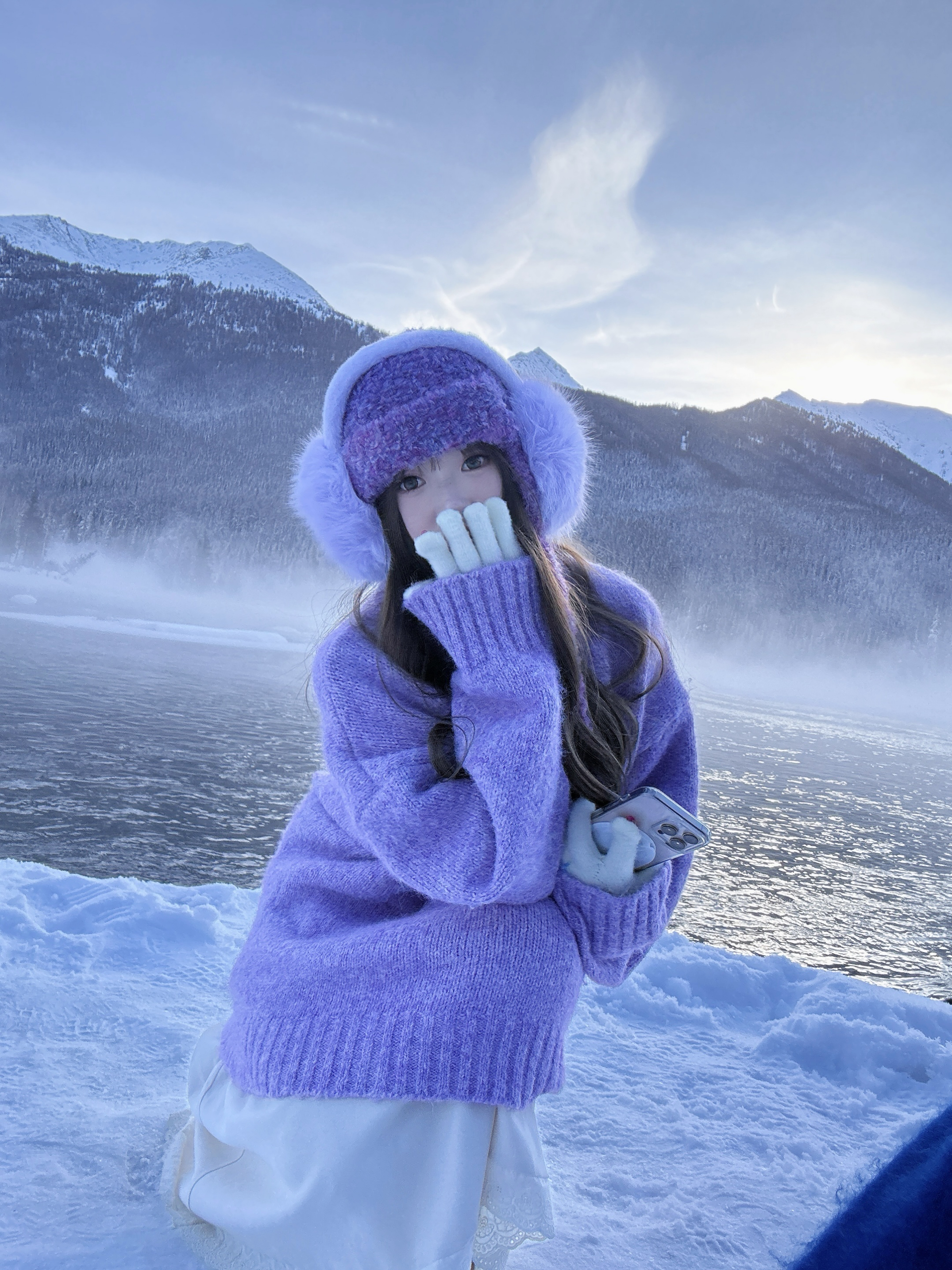 ❄️雪天OOTD: 香芋紫毛衣+同色系毛绒耳罩 配奶白半裙 冷调里的温柔暴击! 口罩和毛衣的颜色刚好戳中心巴! 连呼出的白气都带着甜香~ (就是手机冻到自动关机的程度🥶