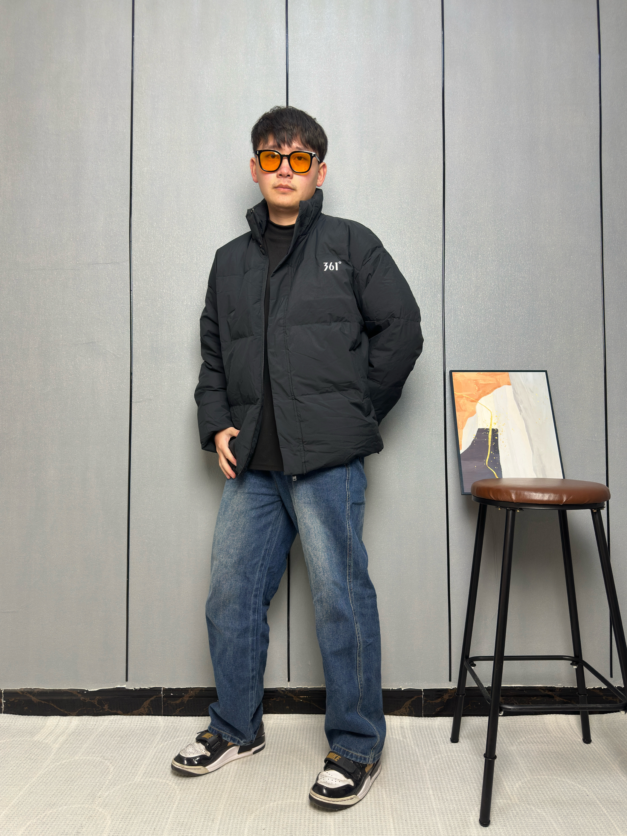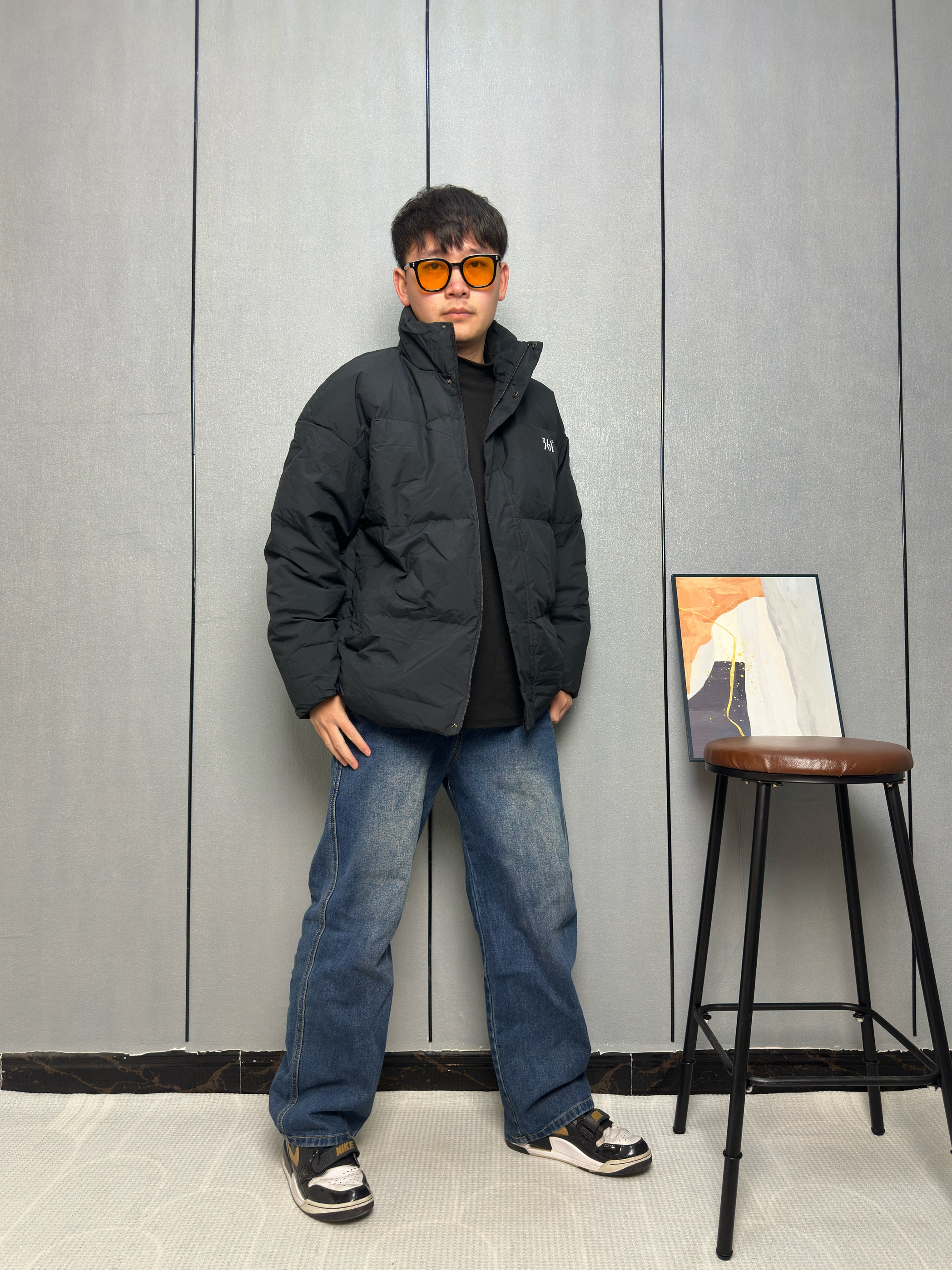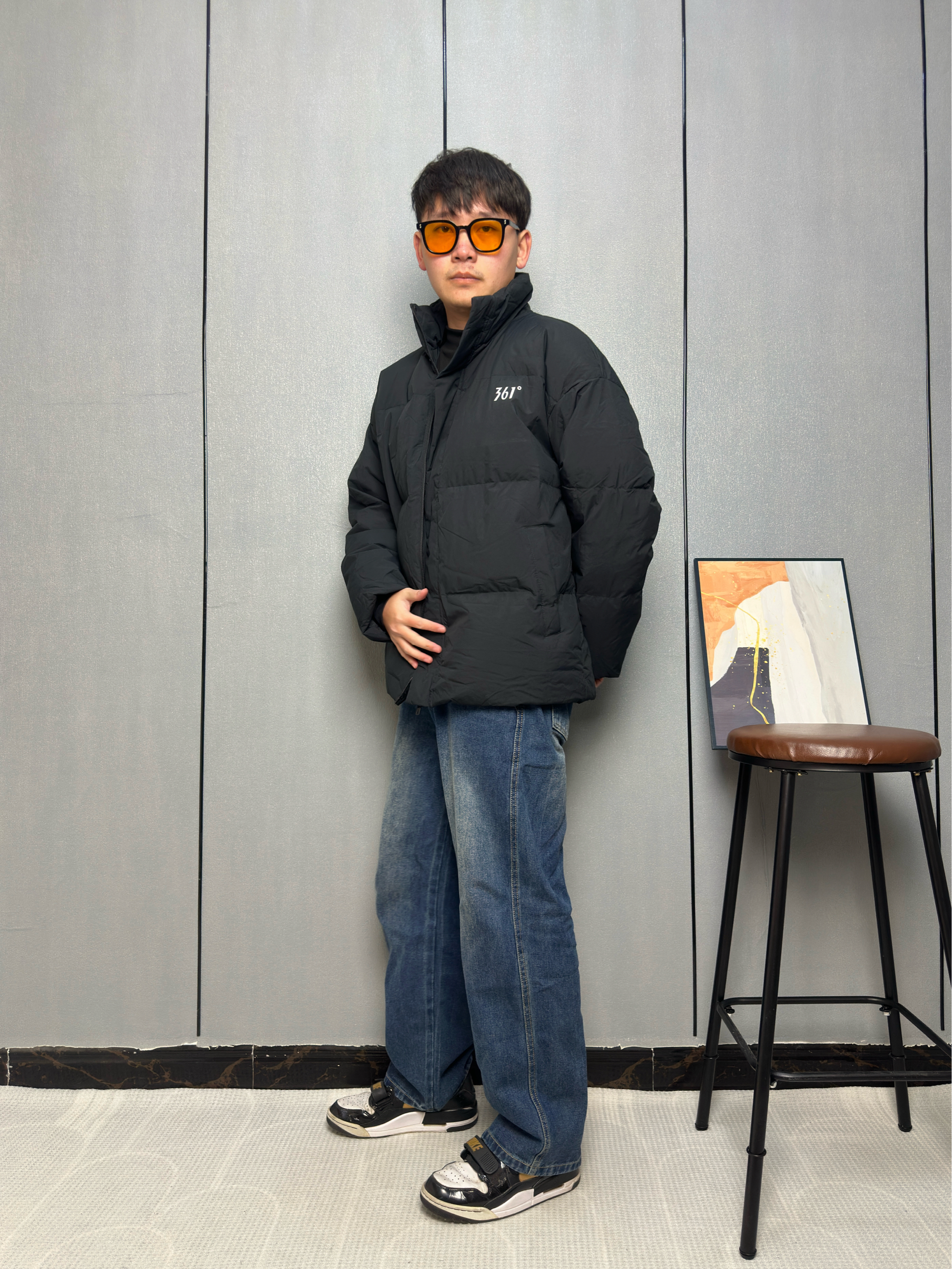冬天到了黑羽绒服成了保暖主力 里面我只穿了一件黑色的内搭 这样叠穿既保暖又能保持整体的利落感 这件羽绒服是轻薄款所以看上去不臃肿 适合在零下两三度以上穿 下装选了一条做旧的阔腿牛仔裤 能增加点穿搭的休闲感 让羽绒服也能穿出少年气