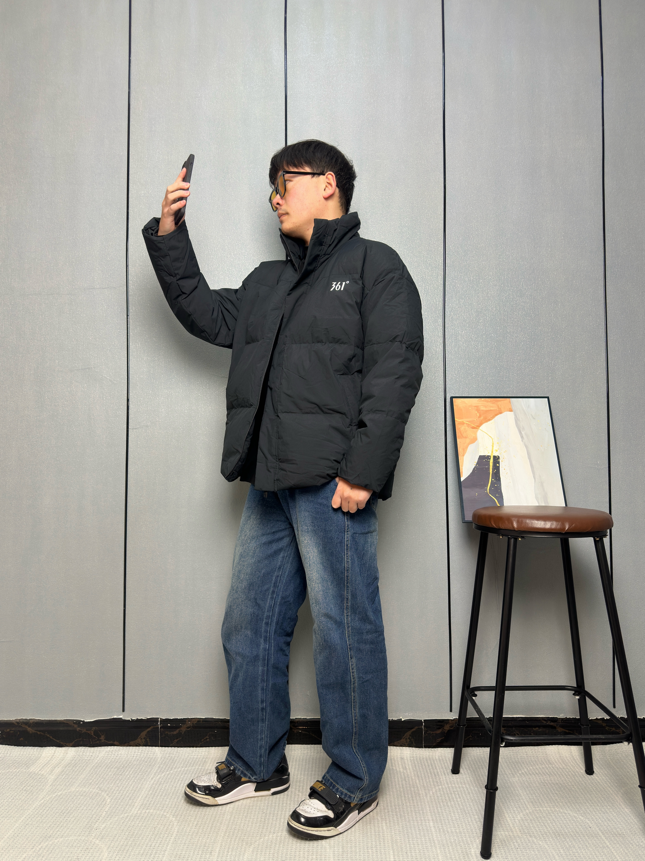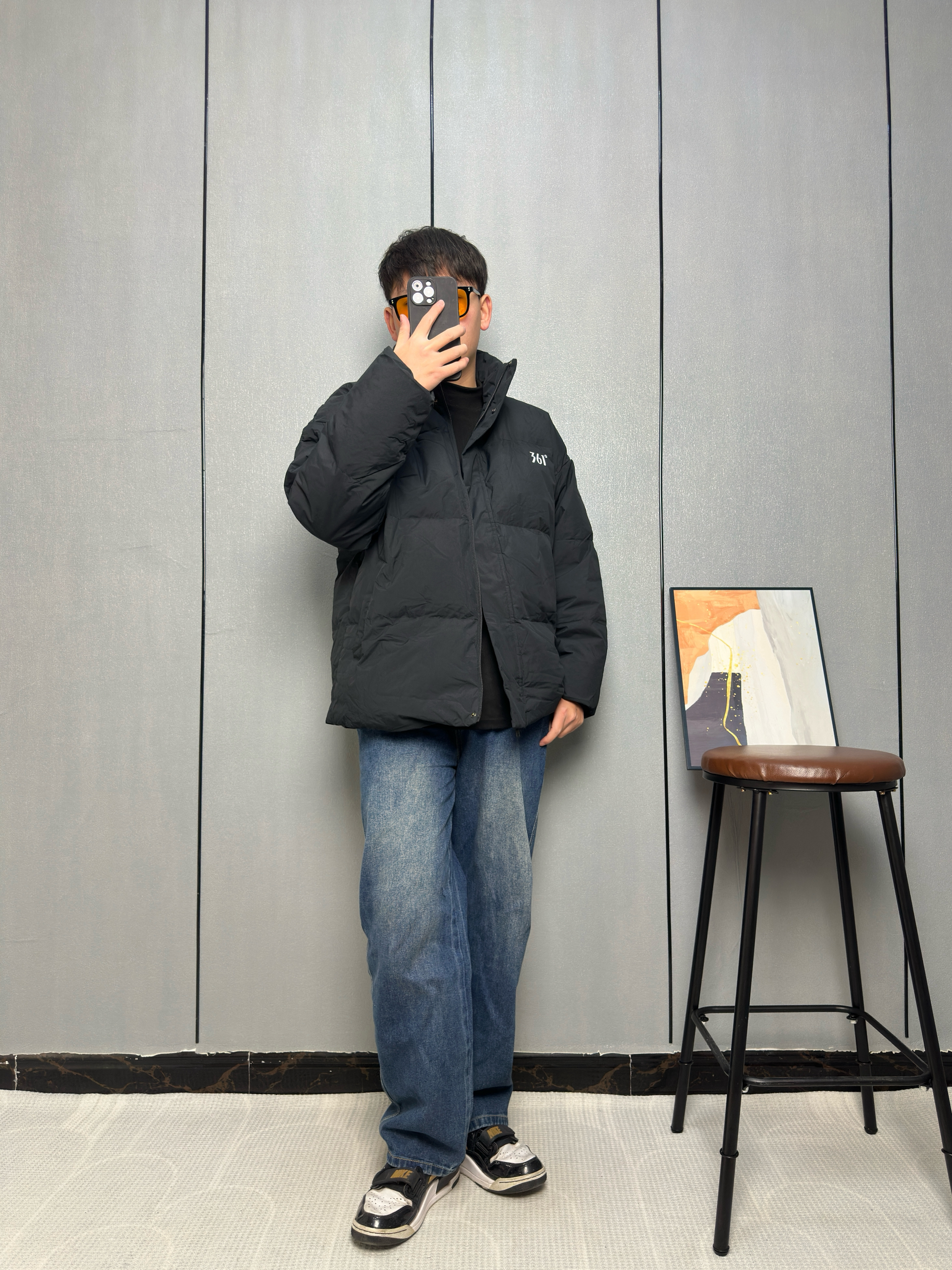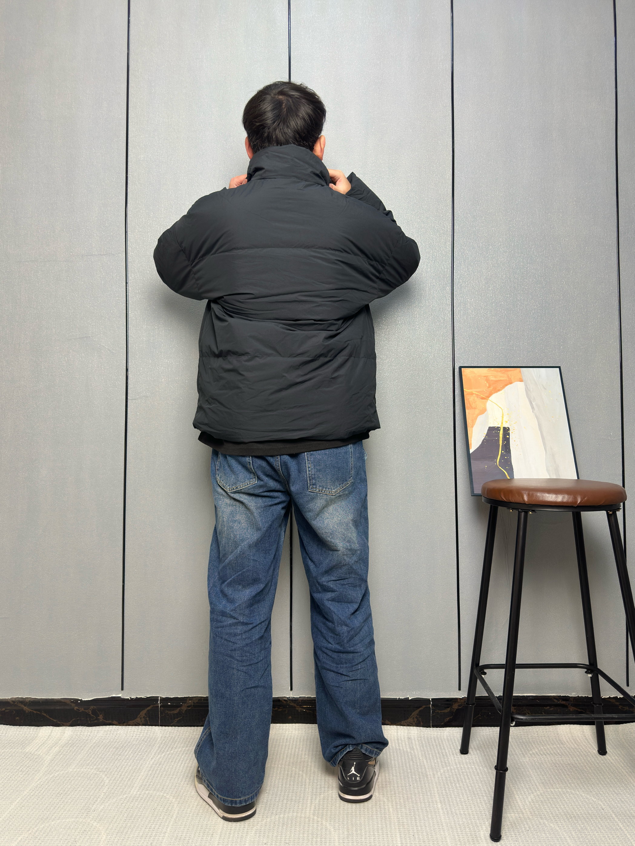 冬天到了黑羽绒服成了保暖主力 里面我只穿了一件黑色的内搭 这样叠穿既保暖又能保持整体的利落感 这件羽绒服是轻薄款所以看上去不臃肿 适合在零下两三度以上穿 下装选了一条做旧的阔腿牛仔裤 能增加点穿搭的休闲感 让羽绒服也能穿出少年气