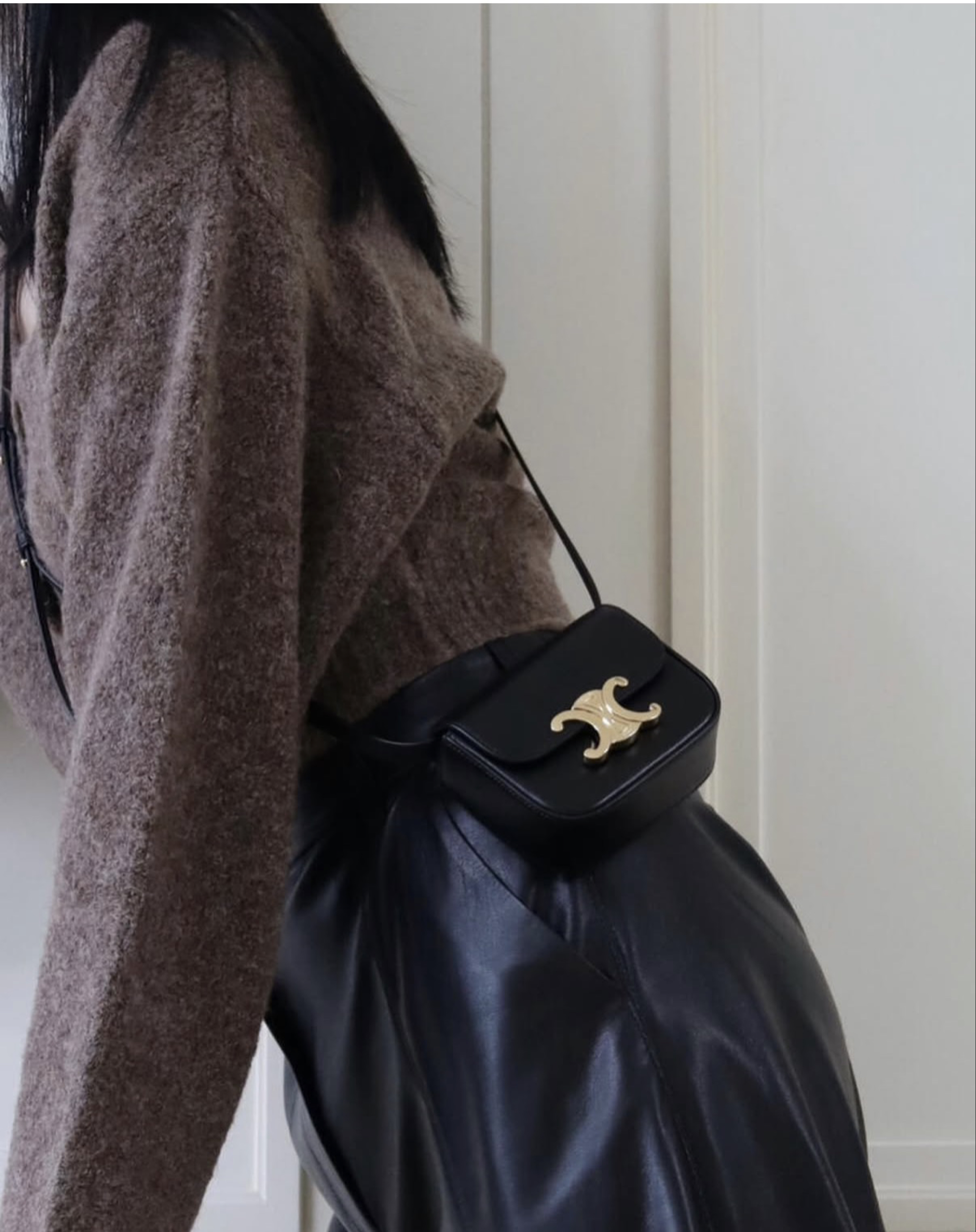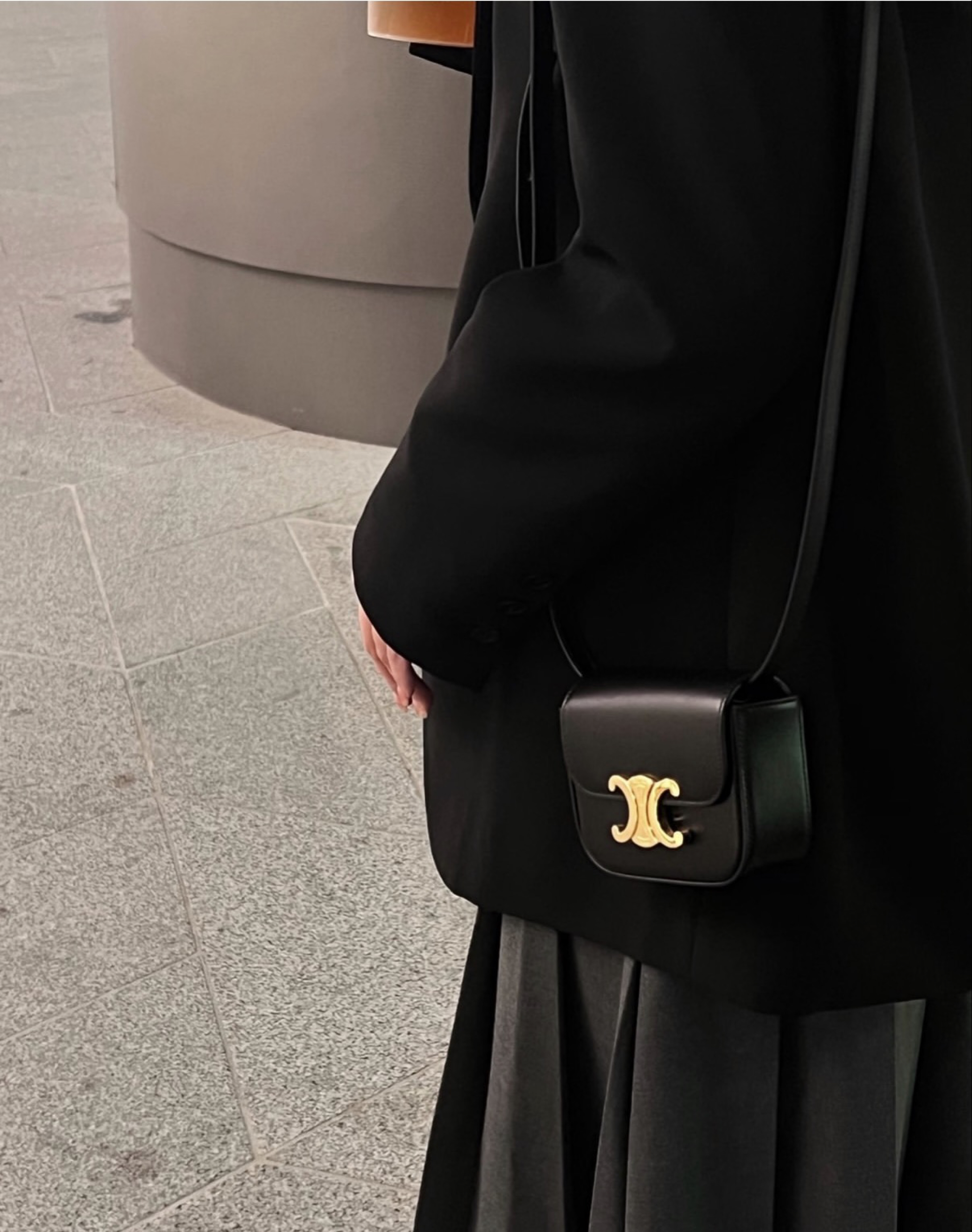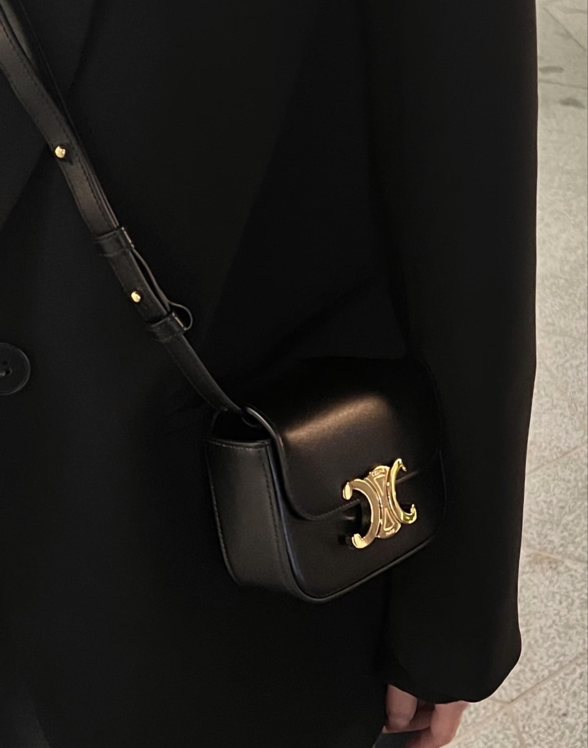 入手这款CELINE迷你包有段时间了,越用越觉得值。 黑色皮质摸起来很细腻,金扣的质感也很在线,不是那种廉价的亮面,低调又精致。包身小巧但超能装,手机、口红、卡包塞进去都没问题,日常出门单肩斜挎都合适。搭西装、卫衣或者连衣裙都不违和,属于闭眼入不踩雷的款,真心推荐给喜欢简约风的姐妹。