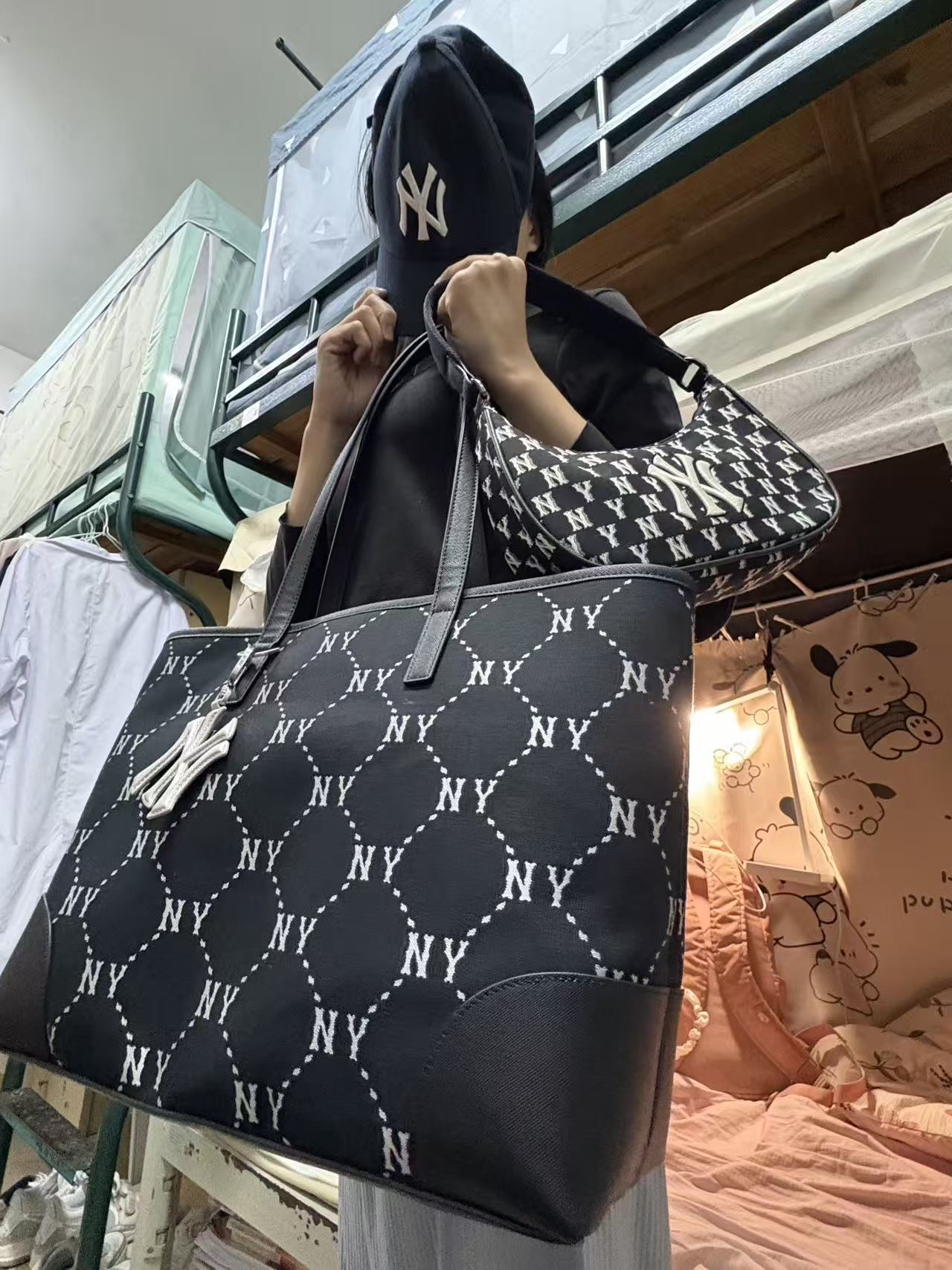 终于等到我的MLB老花托特包啦✨ 经典的满印老花图案,黑底白标低调又耐看,通勤、逛街、约会背都超合适! 容量真的巨能装,课本、笔记本、水杯、化妆品塞进去毫无压力,对学生党和打工人来说太友好了。 包身自重很轻,背一天也不会累,肩带的宽度刚好,不会勒肩膀。
