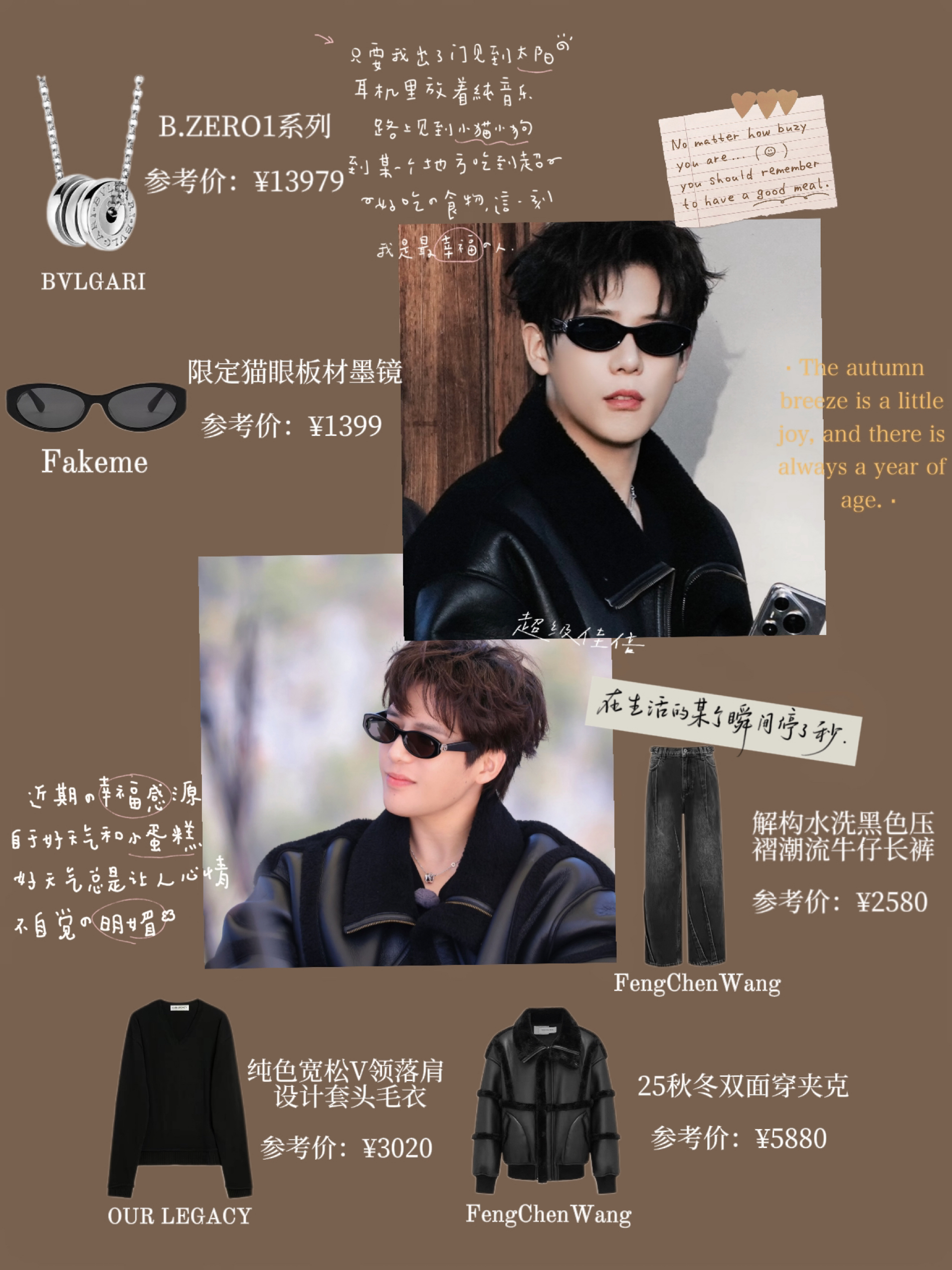 谁懂啊!王安宇在《现在就出发3》的造型直接鲨疯了🤯 Feng Chen Wang的机能风皮毛一体外套也太有质感了 黑色皮毛拼接设计,拽酷气场直接拉满💥 内搭Our Legacy黑色针织衫,简约又高级 下装搭配同品牌黑灰牛仔裤,顺色穿搭超显腿长 配饰更是点睛之笔✨ 宝格丽项链精致感拉满,Fakeme墨镜一戴,拽酷男友风焊在身上 行走的衣架子说的就是王安宇吧!