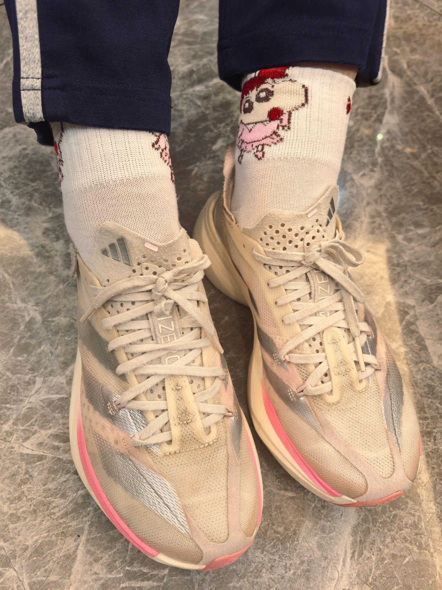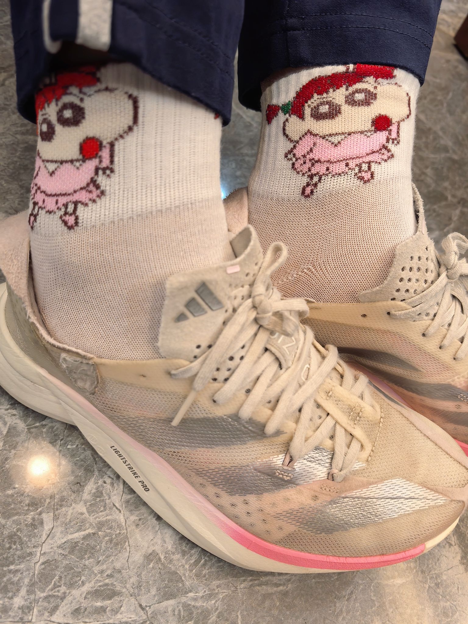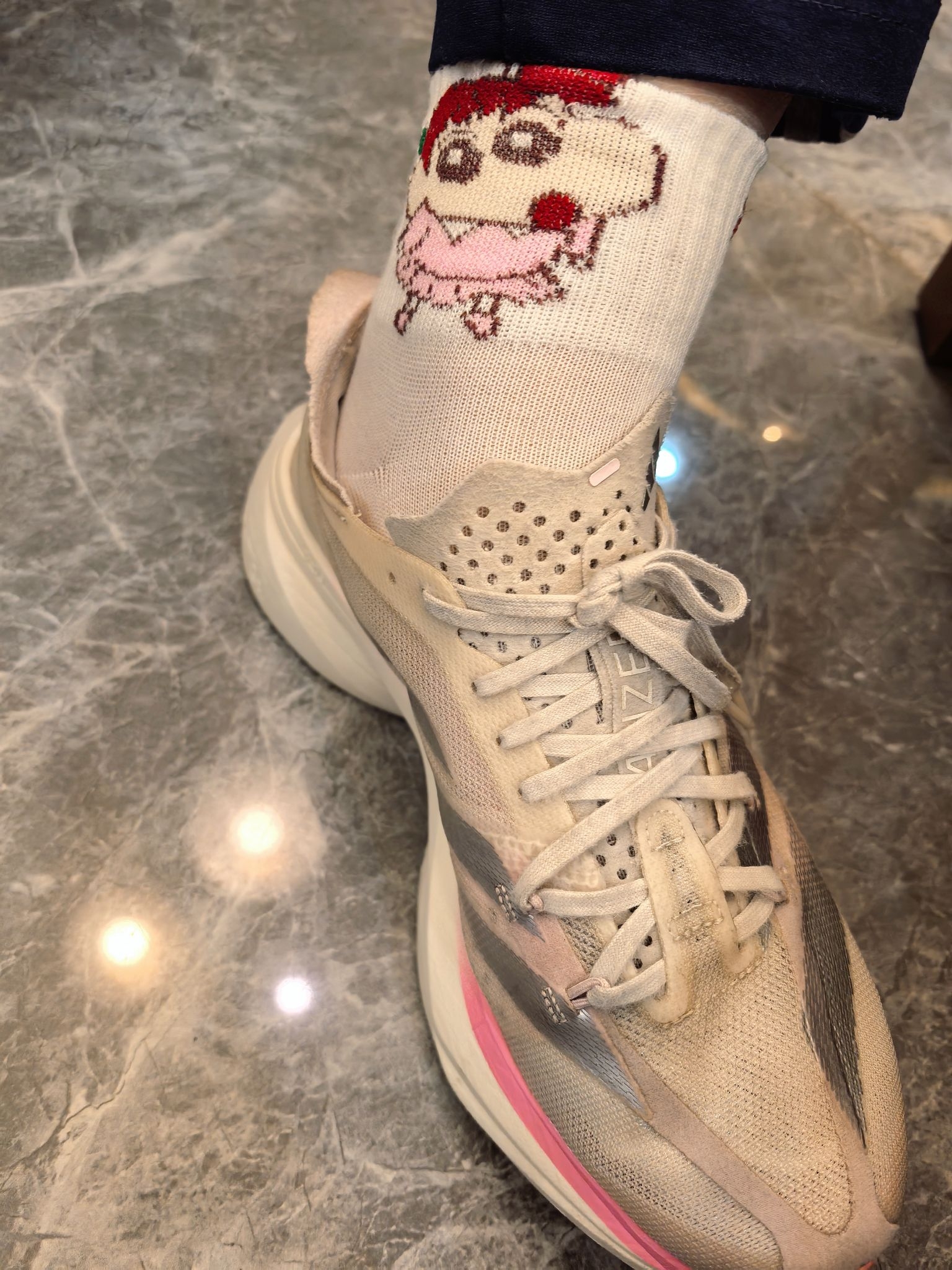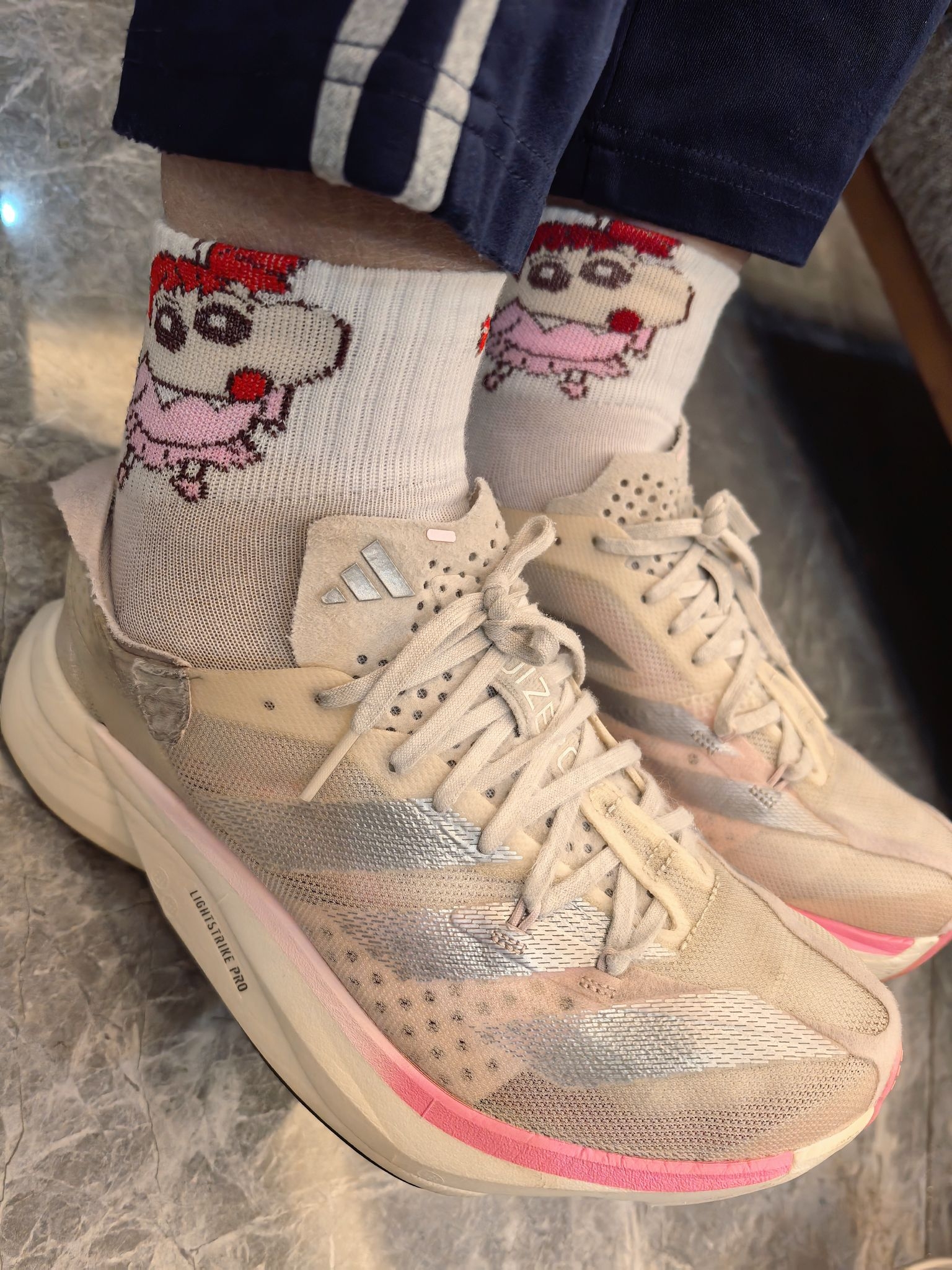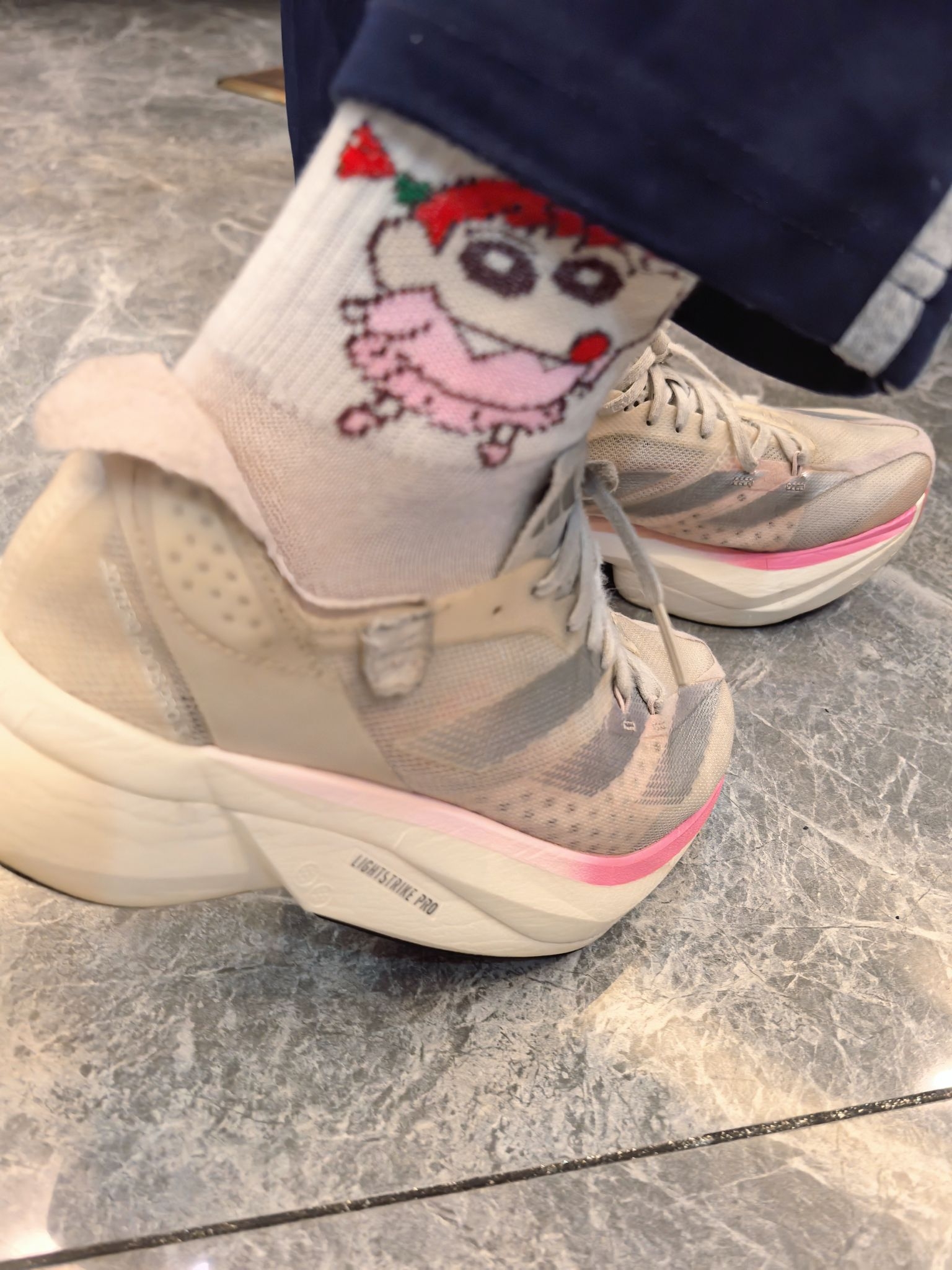 顶级碳板鞋本应该搭配运动袜,然而却搭配卡通袜,是不是很丑萌! 阿迪pro3,鞋子比较宽,对于胖脚的人来说很友好! 它的刚性也不强,长跑不会伤害脚!