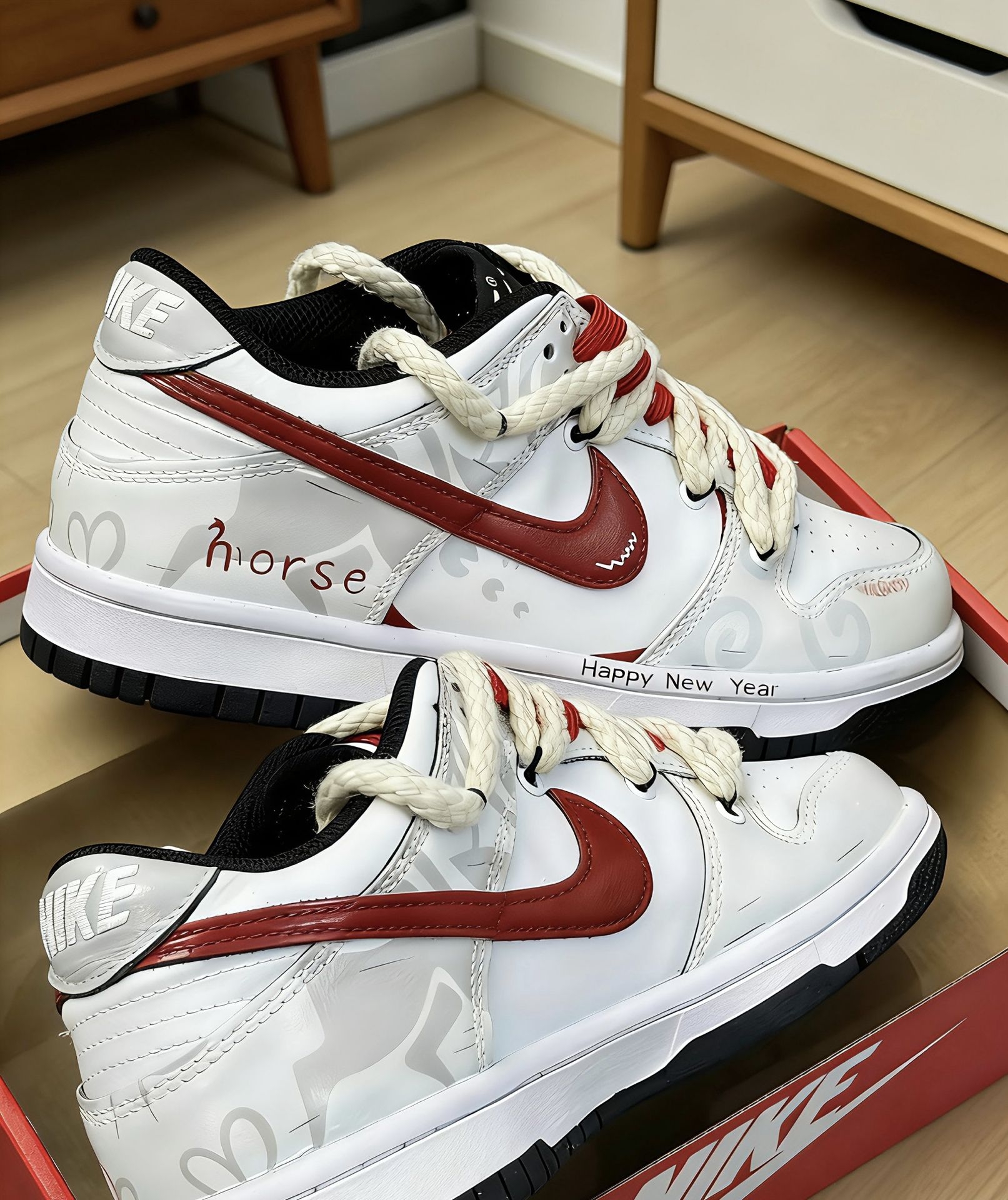 Nike马年红色国潮duck!好好看!|||过节氛围感拉满啦!颜值不输联名! 811 | 2026马年限定「马啸春生」 马啸春生•岁启新章 宣纸质感米白鞋身晕染国风纹理,酒红勾边如朱砂勾勒马鬃,让Nike 经典鞋型化身新中式春日诗意的承载者。 鞋身暗纹摹春山连绵之姿,鞋侧描金绘骏马越春之形,藏住“马啸春山阔,景明万事兴”的马年祝福。 22026马年限定「马啸春生」,格调与祥瑞相融,马年上脚,步步踏...