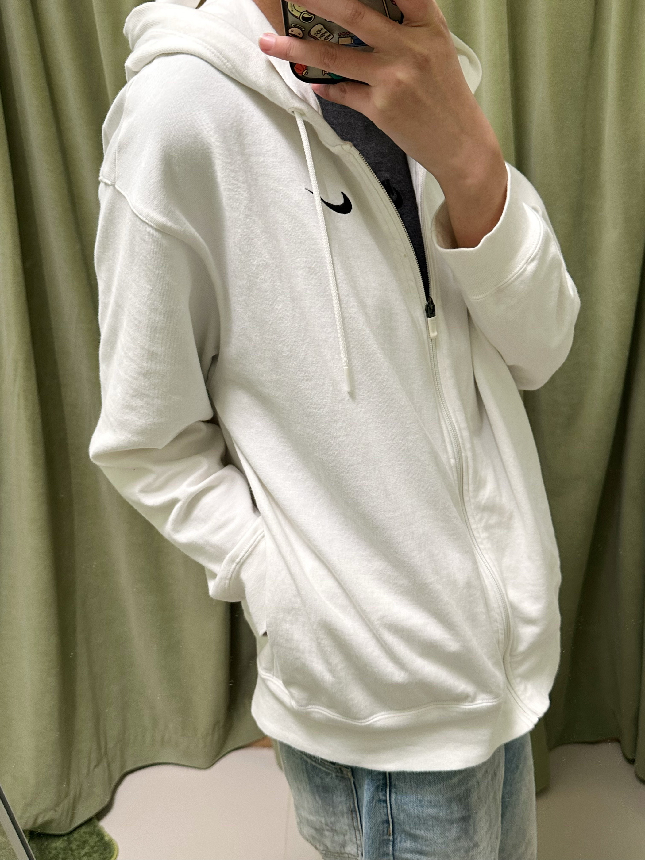 这是一件nike的休闲薄外套,很适合春天外穿,配牛仔裤会很有青春校园的感觉~因为款式和颜色都比较简约,随穿随走,完全是百搭单品!100%棉也不起球😭 我身高178,买的XL码,感觉袖子还可以再长一点,大家可以参考一下!