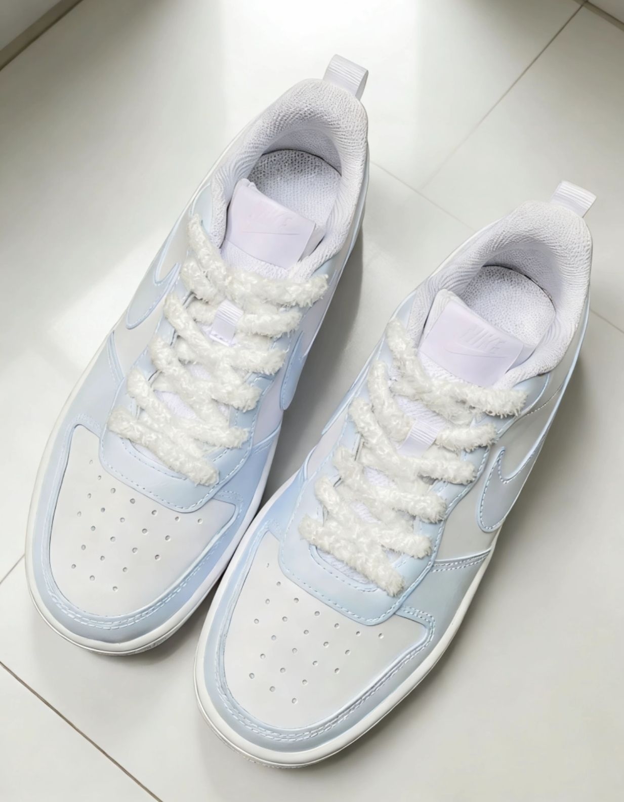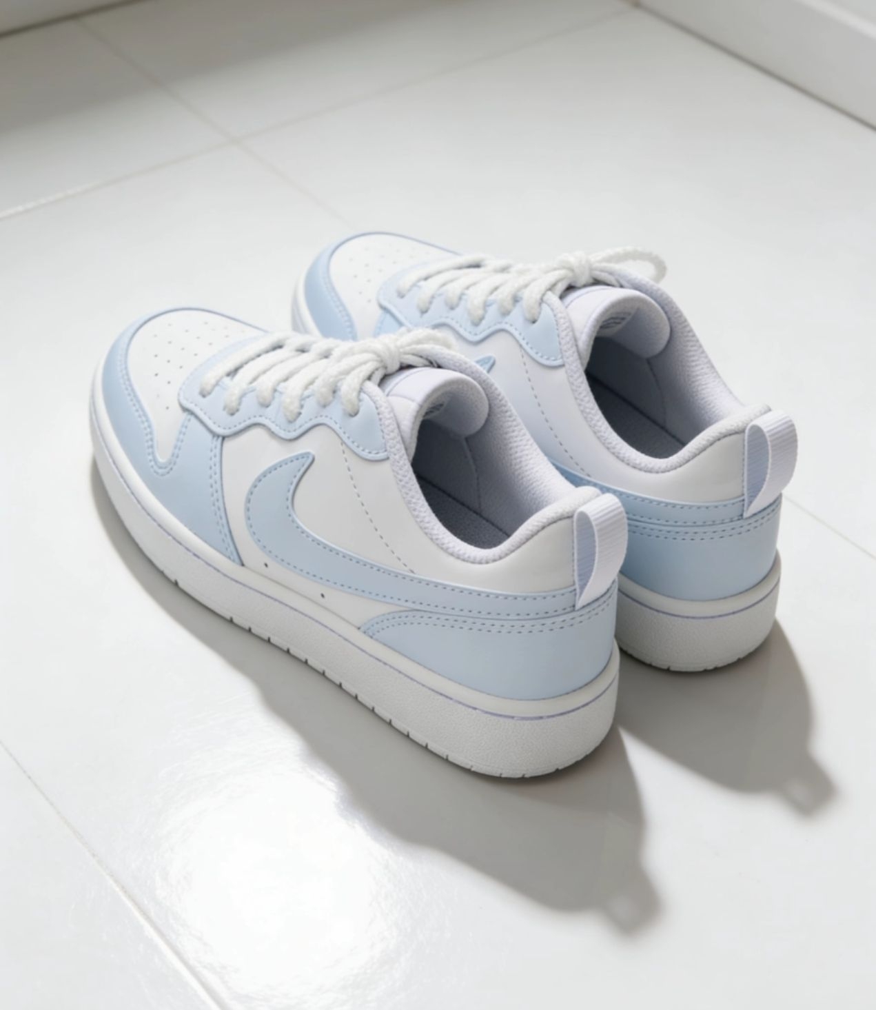 谁能拒绝这双奶fufu的Nike白蓝马卡龙啊!柔和的白蓝撞色像咬了一口海盐冰淇淋,马卡龙调调直接戳中少女心~皮质鞋面质感拉满,经典板鞋鞋型搭牛仔裤、百褶裙都超适配,日常出街踩上它,回头率直接拉满!