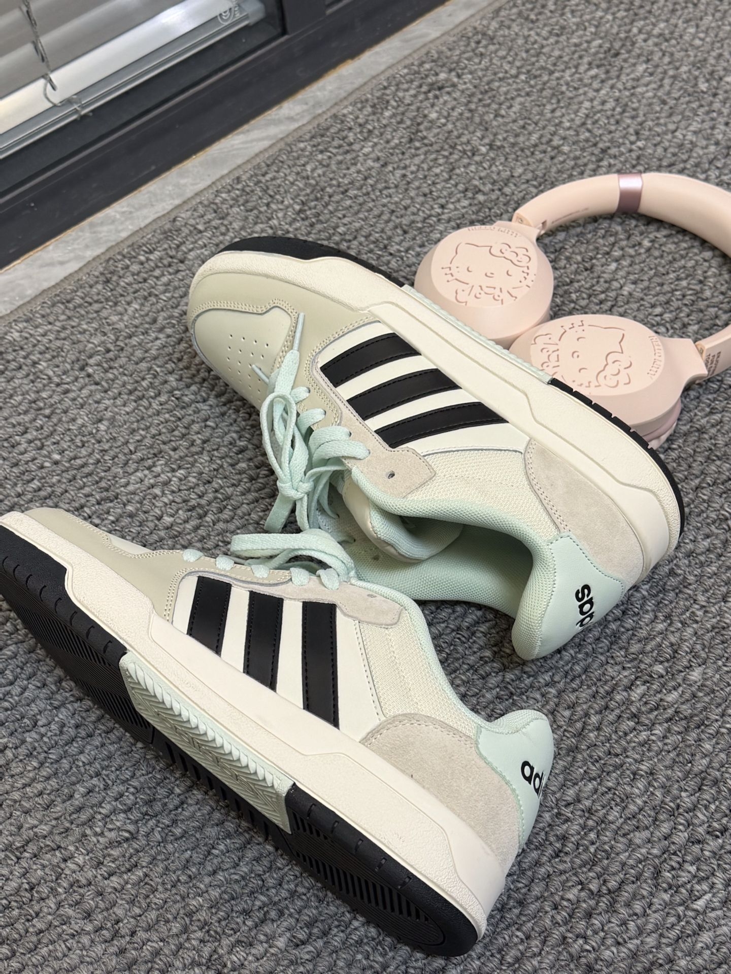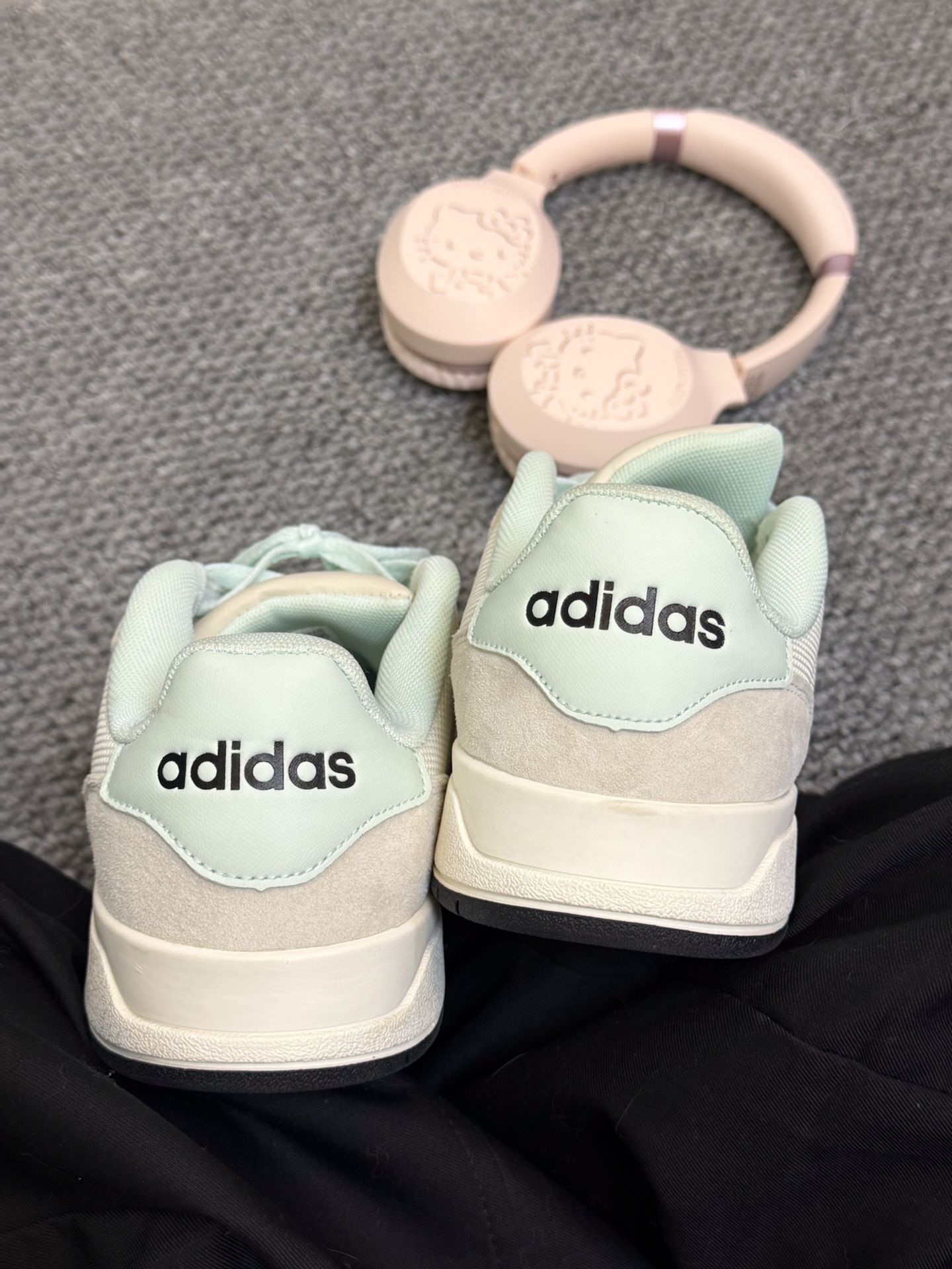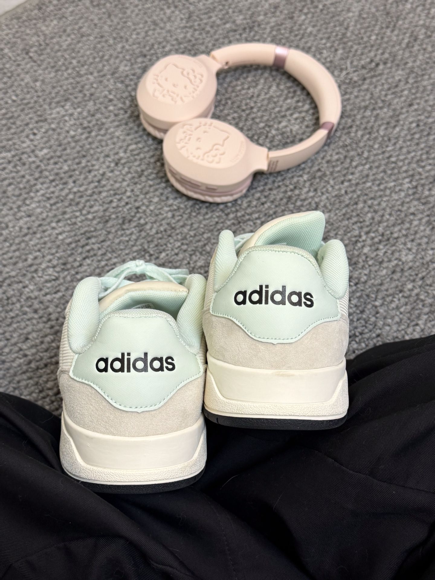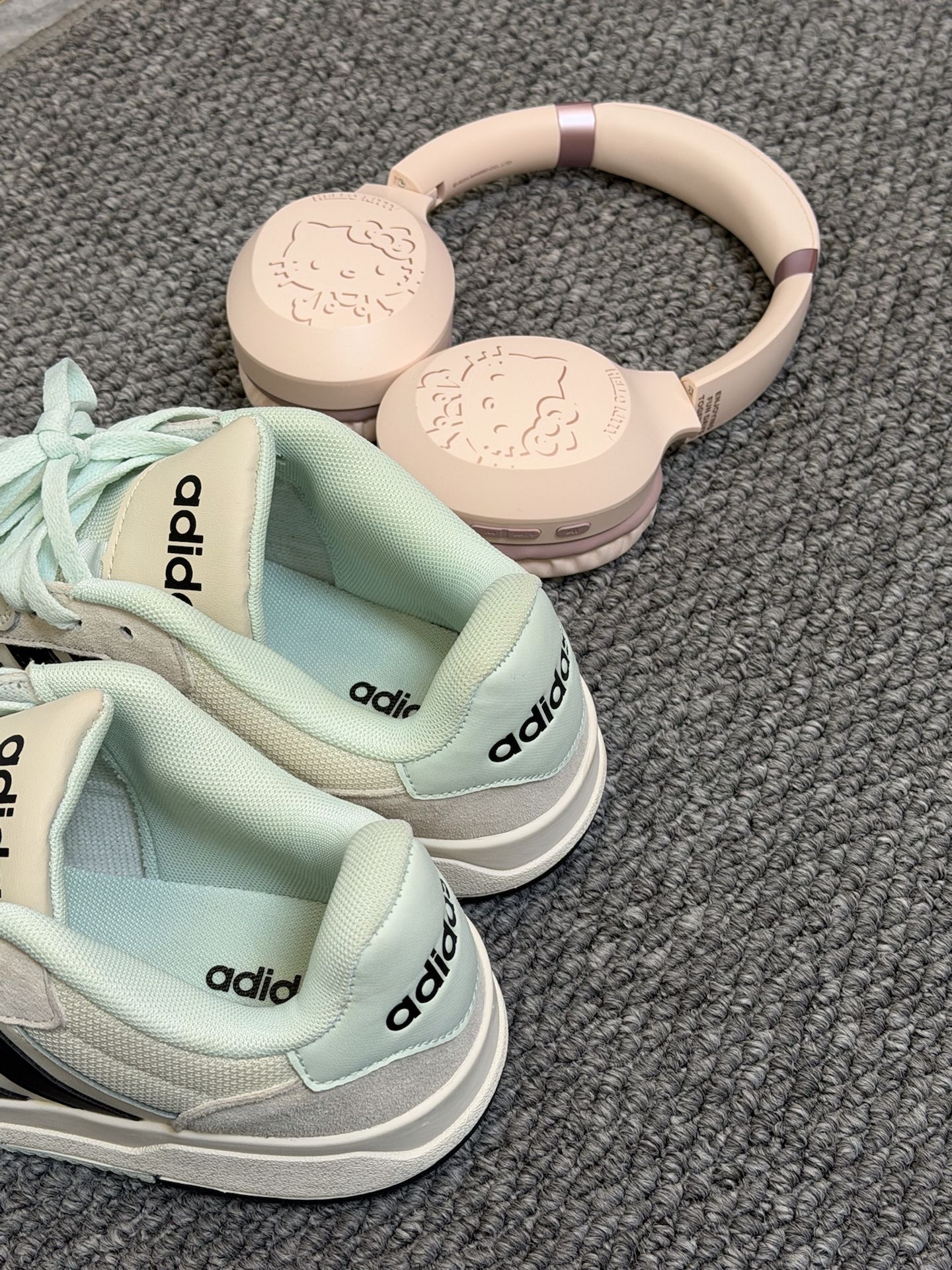 阿迪青草绿➕三丽欧Kitty耳机🎧🟰窝要趣约会咯|||这双鞋子和我的耳机好搭配 颜色都是很清新的 粉色和绿色的 上脚之后感觉软软的 出门逛街也可以穿的 #阿迪达斯adidas #竟然被鞋抢了c位 #冬天不止黑白灰 #板鞋拿捏秋冬氛围感 #adidas绿色爱了
