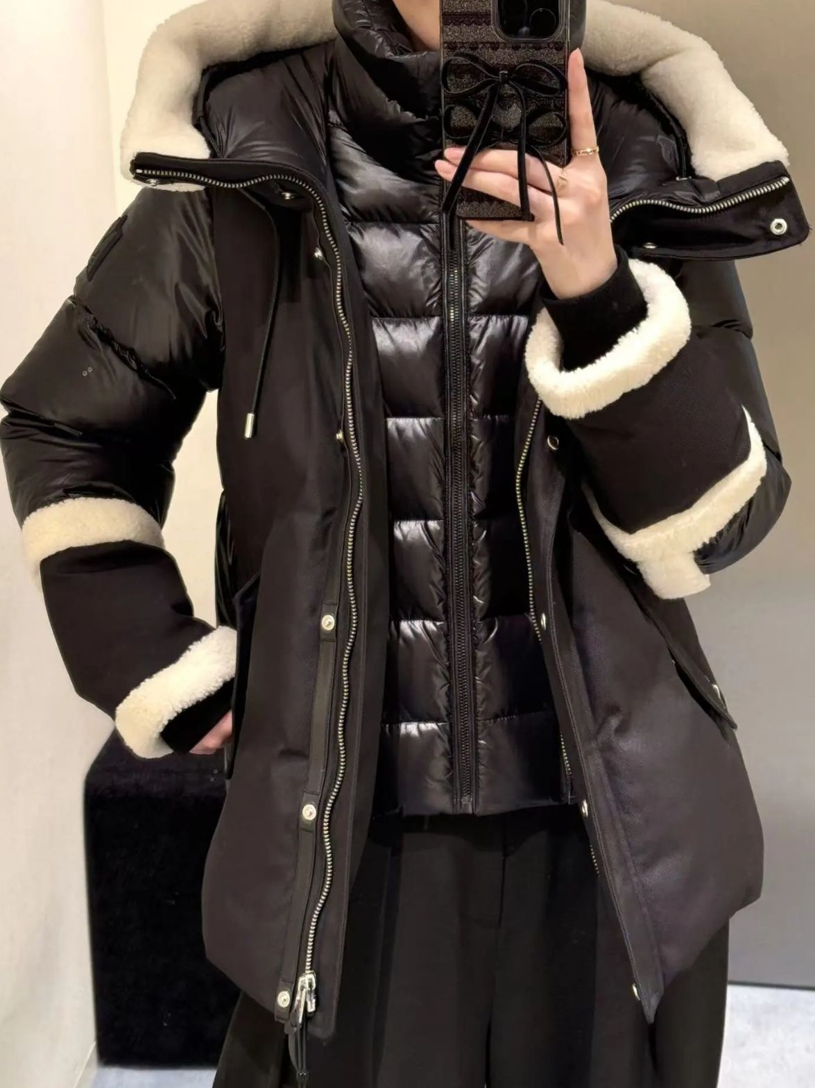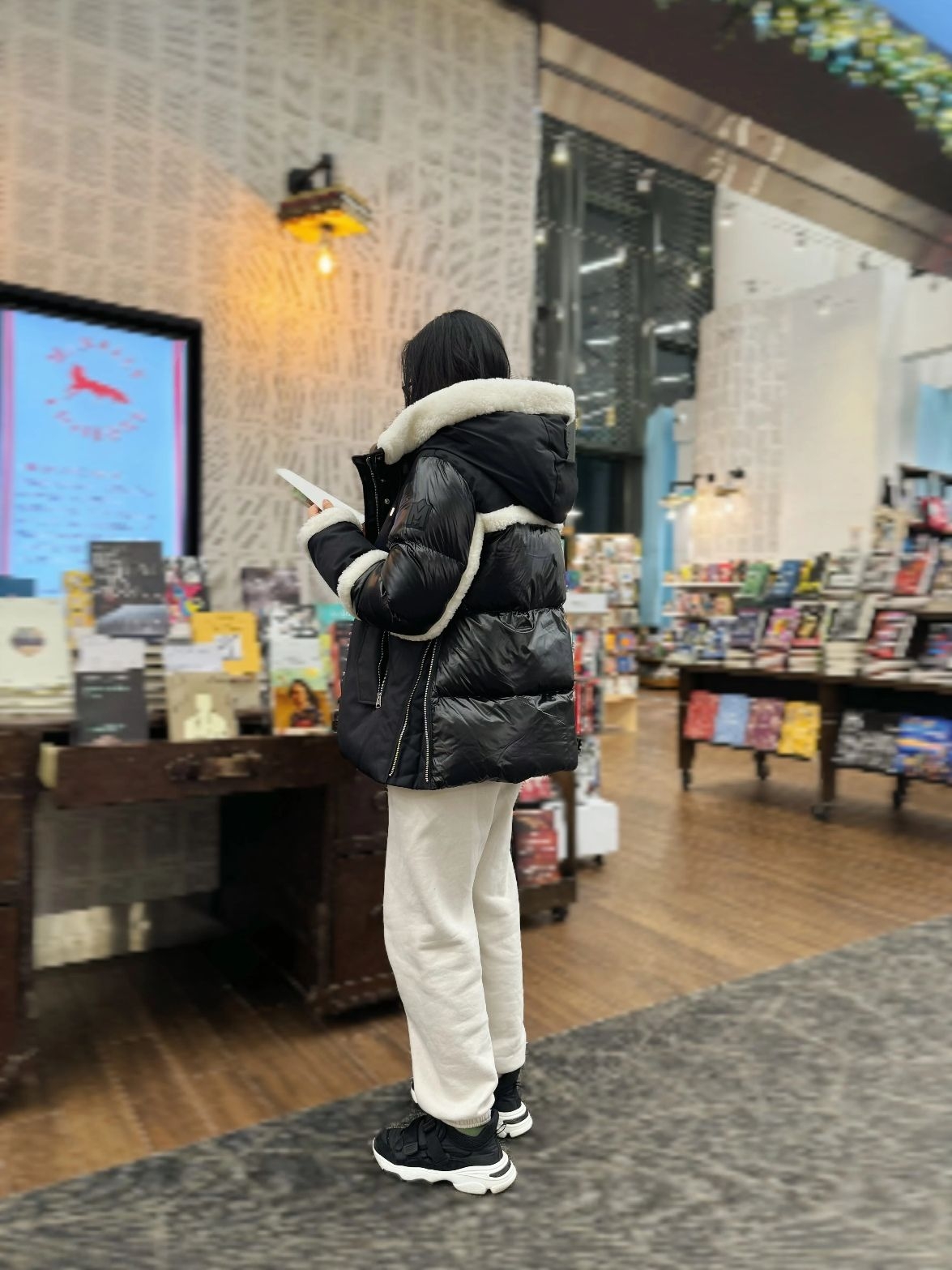 没过两天,衣服就到了。我试了米白色。穿上身的那一刻,我找到了那个精准的平衡点。重量是踏实的,饱满的羽绒立刻锁住了体温。帽子很大,戴上后,脸被一圈丰盈的羊羔毛温柔包裹,风声瞬间隔绝。袖口的毛绒收边,让手腕也暖洋洋的。我注意到正面几个带拉链的口袋,不是装饰,很深。斜纹面料在光线下有微妙光泽。我站到镜前,它没有让我变成“面包”,剪裁维持了身体轮廓,那圈毛绒镶边让脸庞显得更小巧。