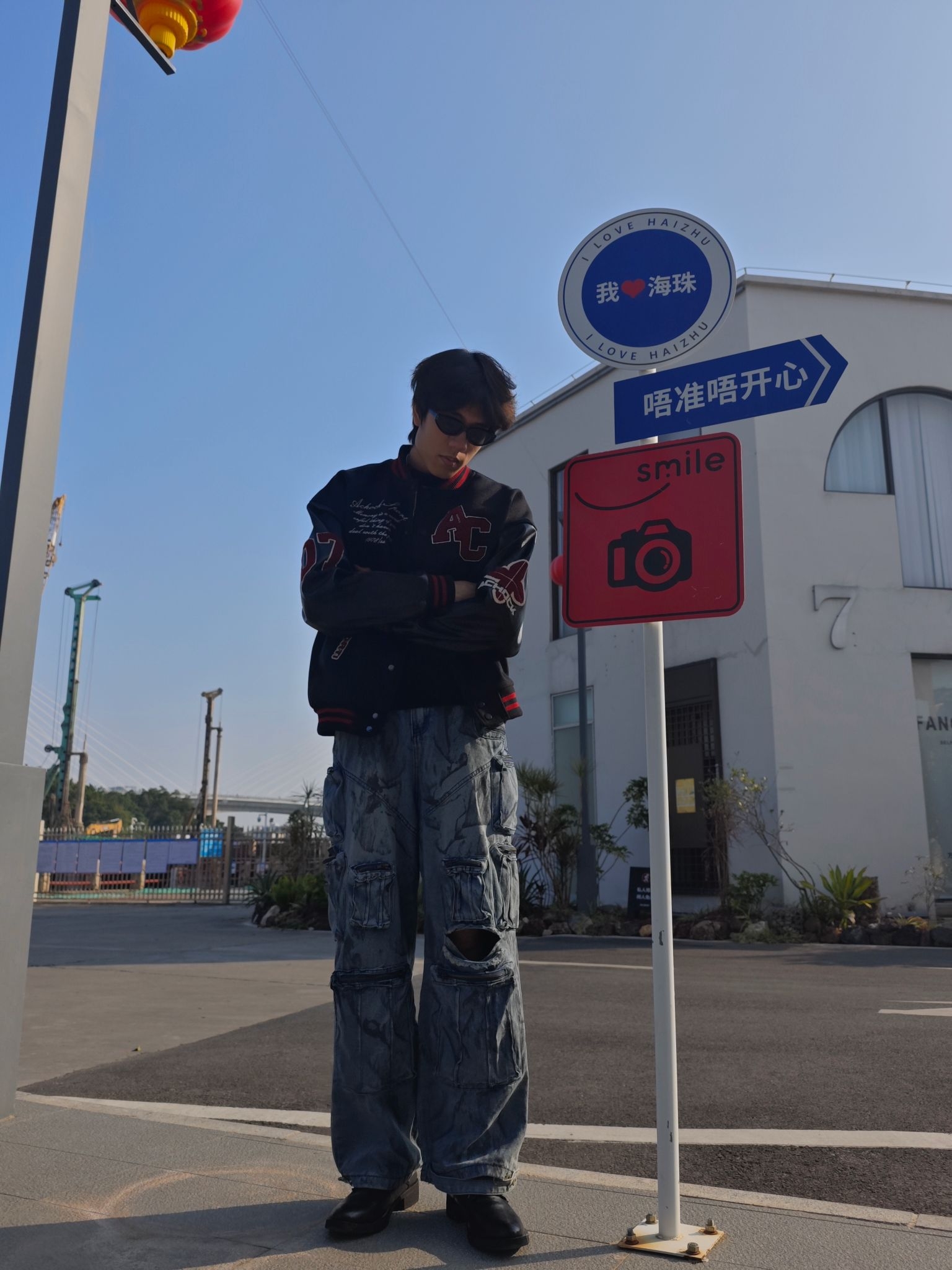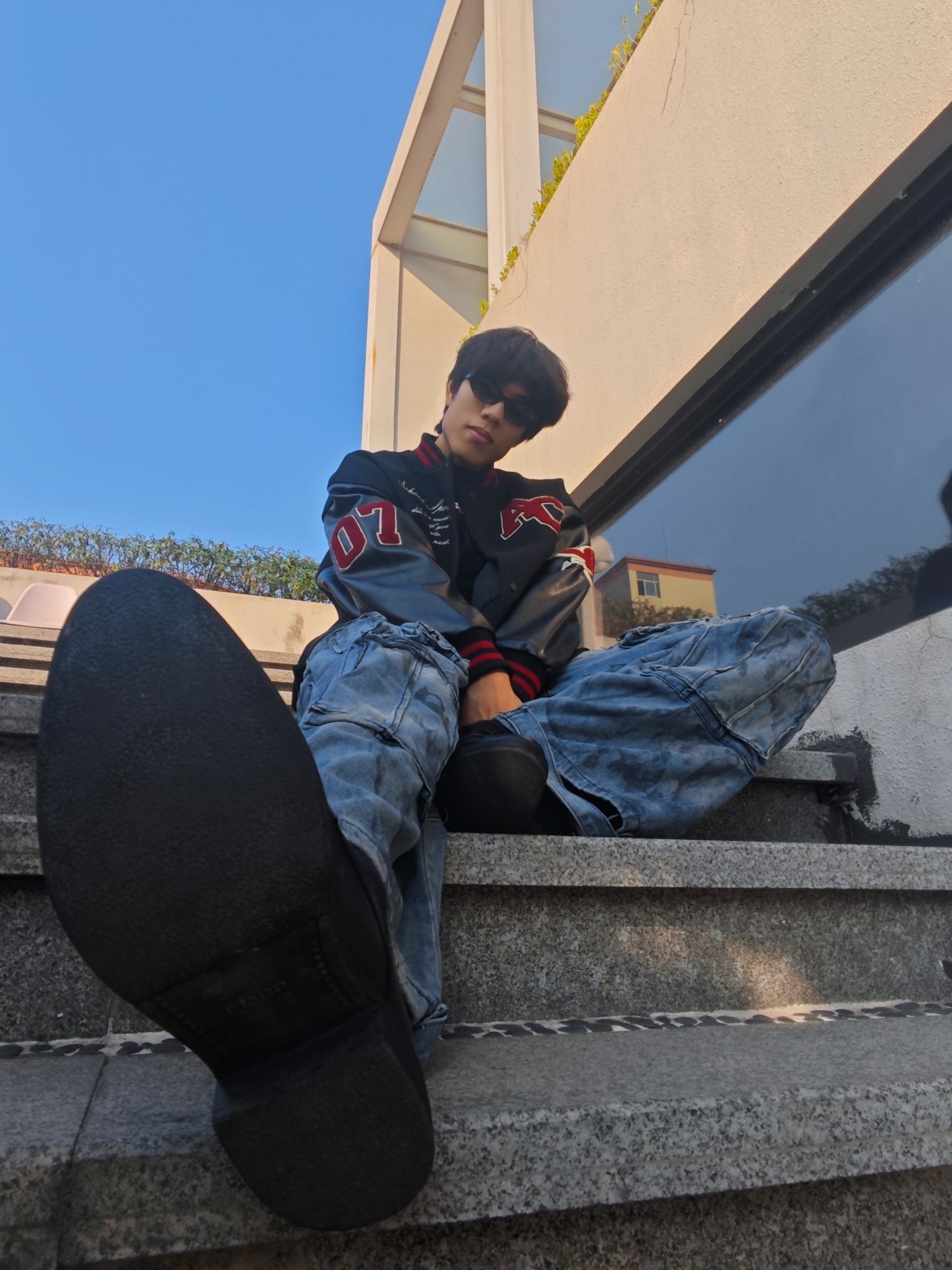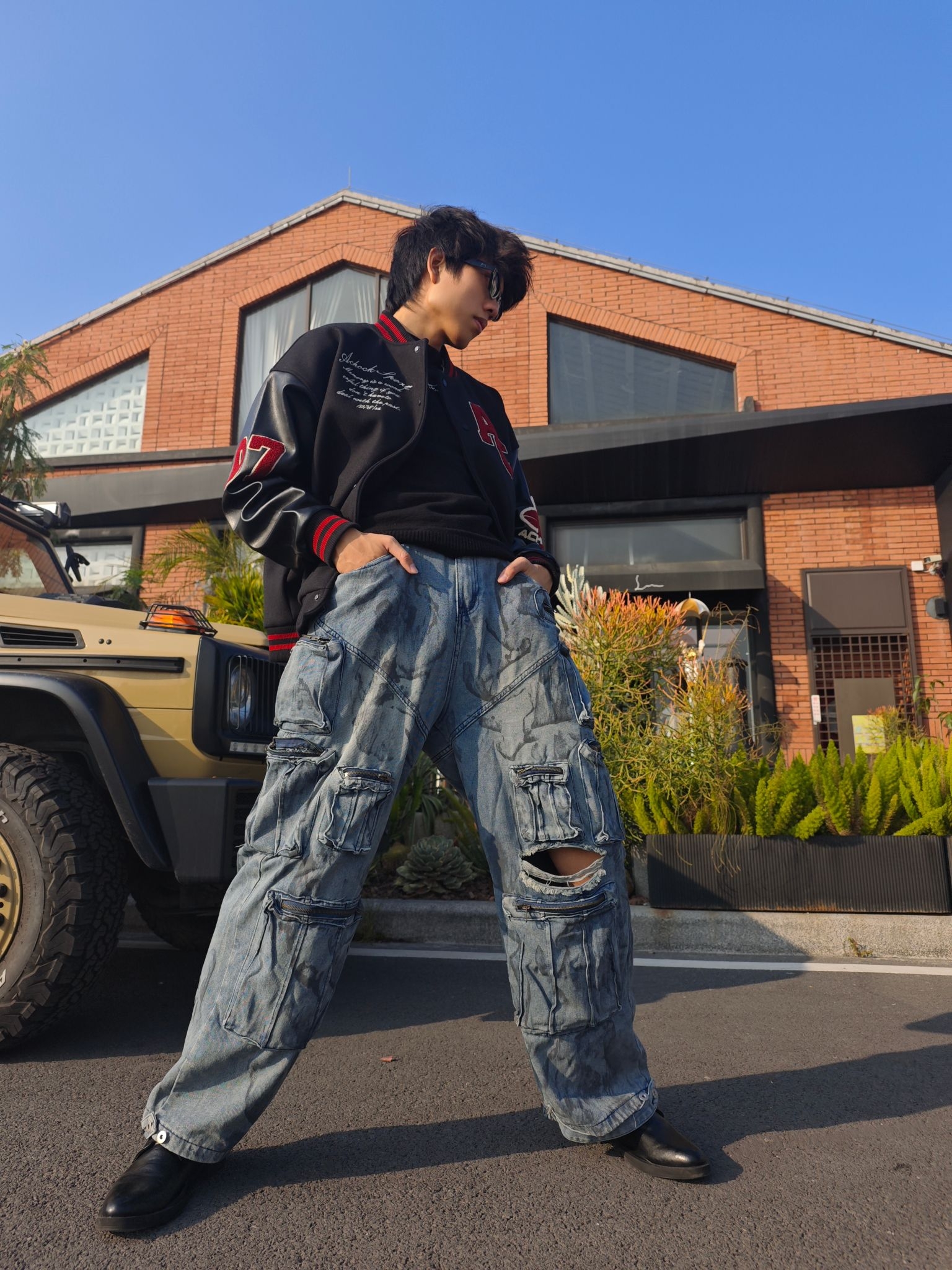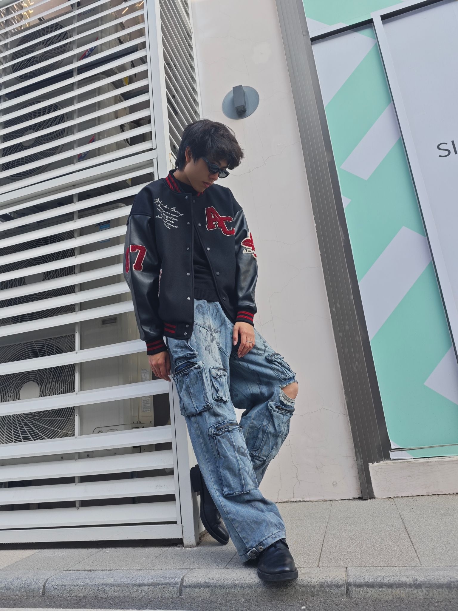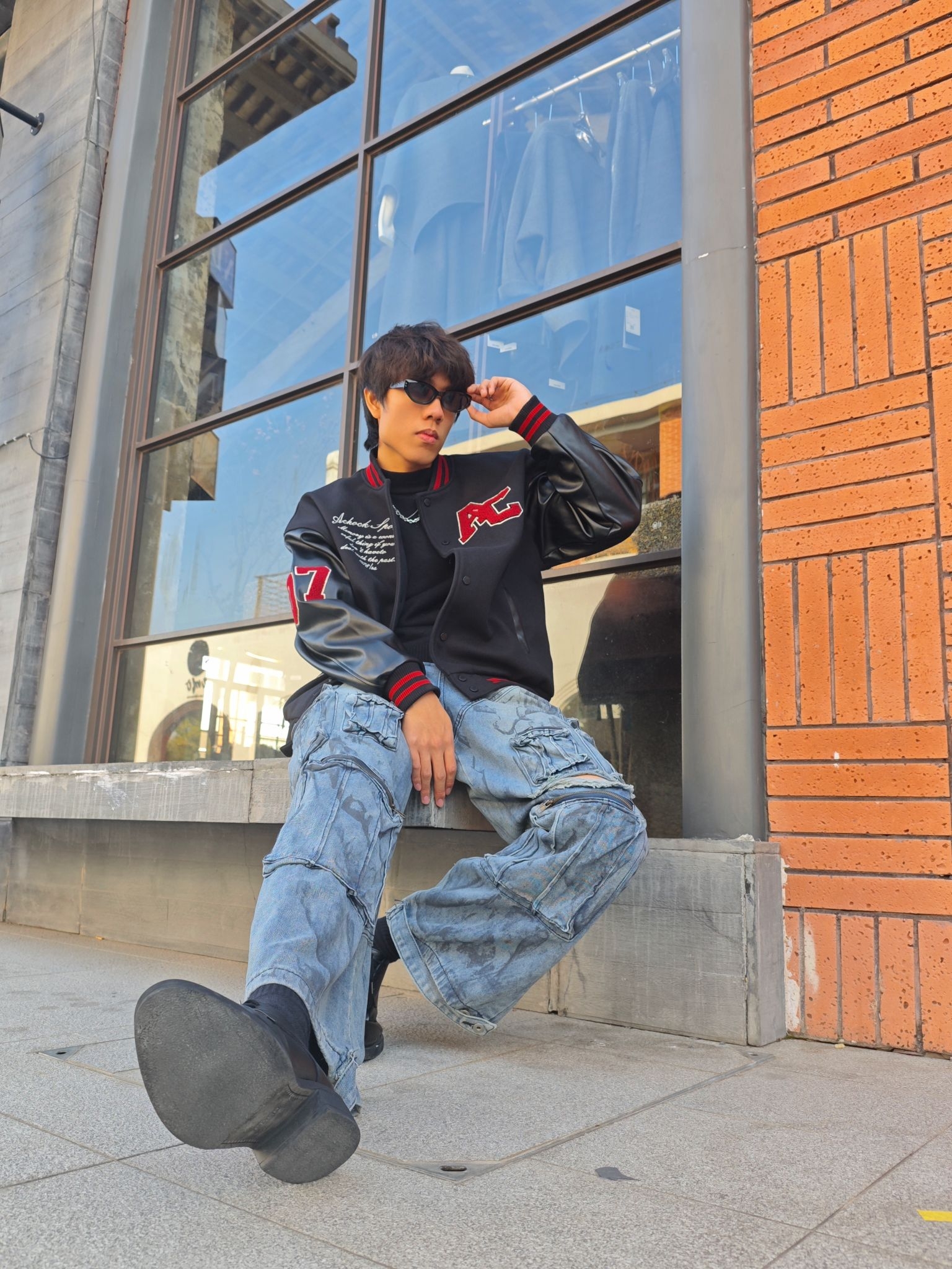 分享今日穿搭之 上衣黑色皮革棒球夹克 质感硬朗,红色字母与刺绣细节精致 内搭的黑色简约T恤 突出了夹克的设计重点🥰🥰🥰 下装水洗蓝工装牛仔裤 做旧纹理与多口袋设计 强化了街头属性 超阔腿版型带来强烈的松弛感 与夹克的硬朗材质形成反差😎😎😎 黑色皮靴硬朗的质感 与夹克的材质完美呼应 也平衡了裤装的宽松感 是美式复古的街头酷感与随性松弛完美融合 这套酷酷的穿搭你get了吗😍😍😍