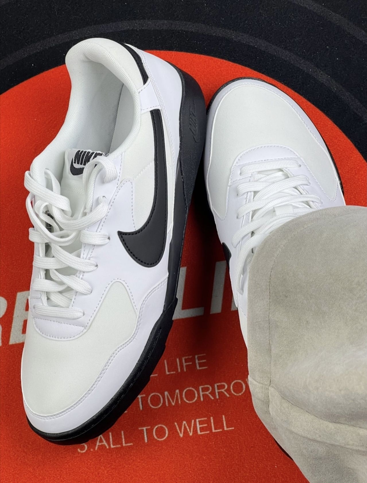 这双Nike上脚一周,说点真实感受👇 白+黑的皮质面,沾点灰拿湿纸巾擦两下就干净,不像网面鞋得搓半天;鞋型偏窄但不挤脚,我平时穿37码,这双码数很准,走半小时路鞋帮也没磨脚踝,软硬度刚好适合通勤。 但鞋底有点薄,踩石子路能感觉到颗粒感,长时间站着脚底板会有点酸;鞋头的皮质有点软,第一天不小心踢到台阶,表面就蹭出个浅印子,得小心爱护。 日常搭牛仔裤、运动裤都不违和,就是下雨天不敢穿——鞋边的...