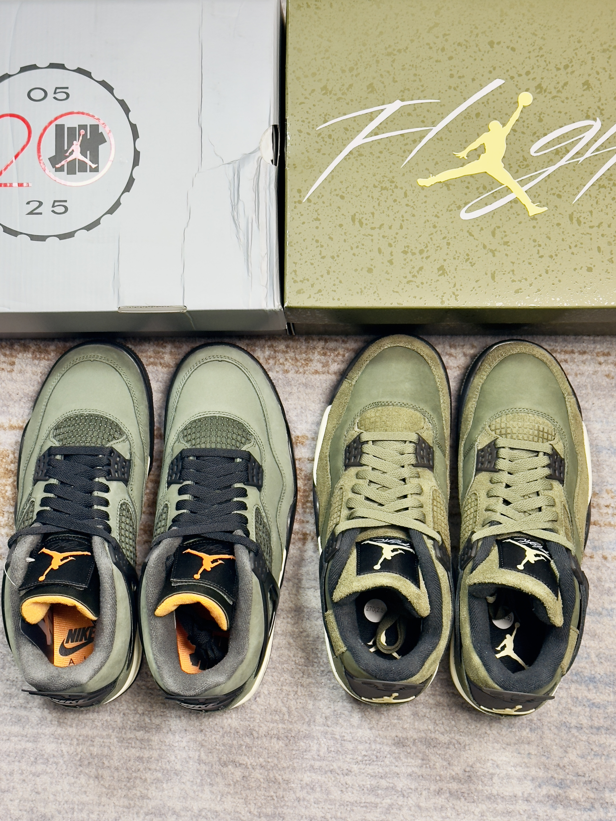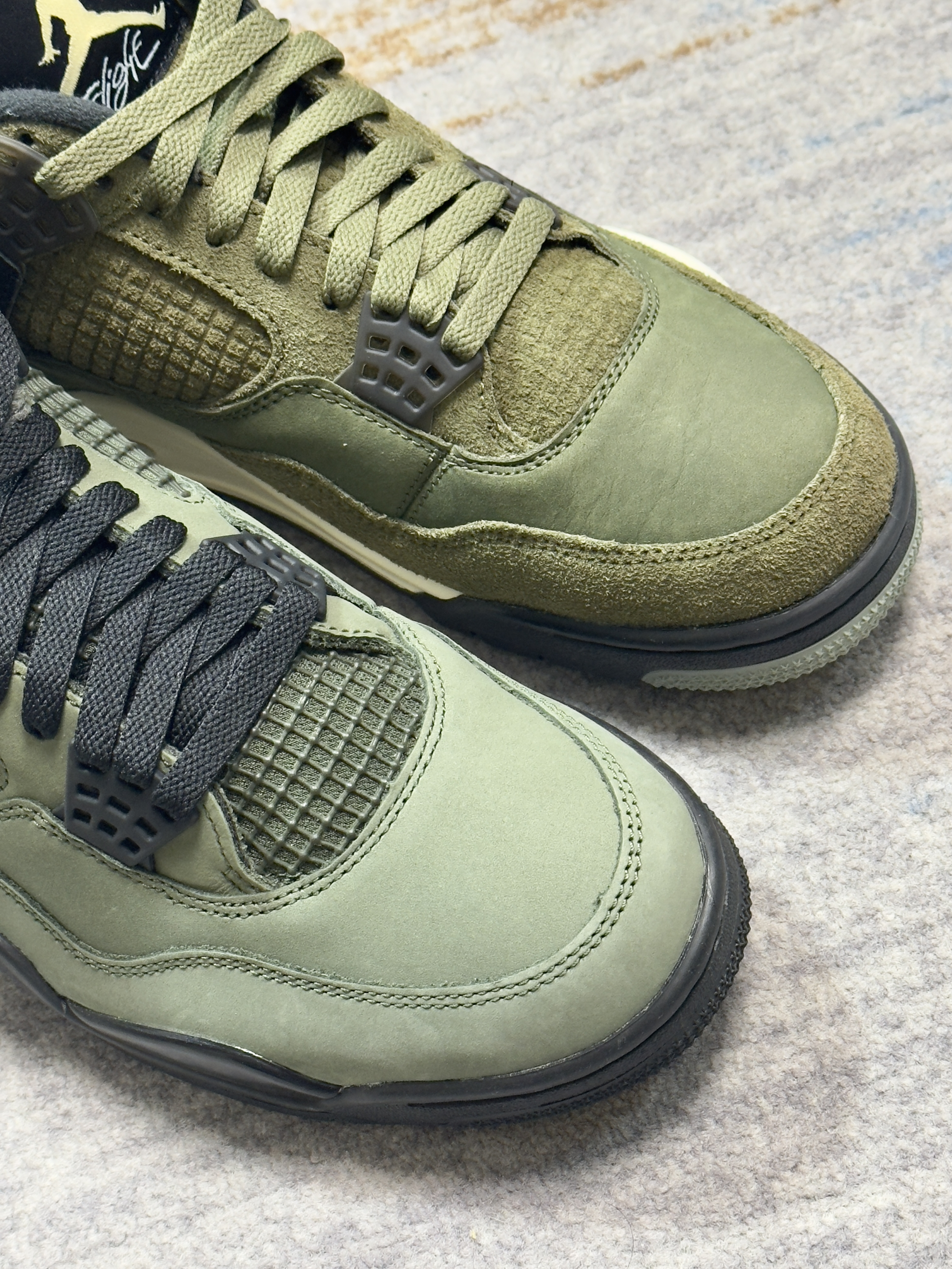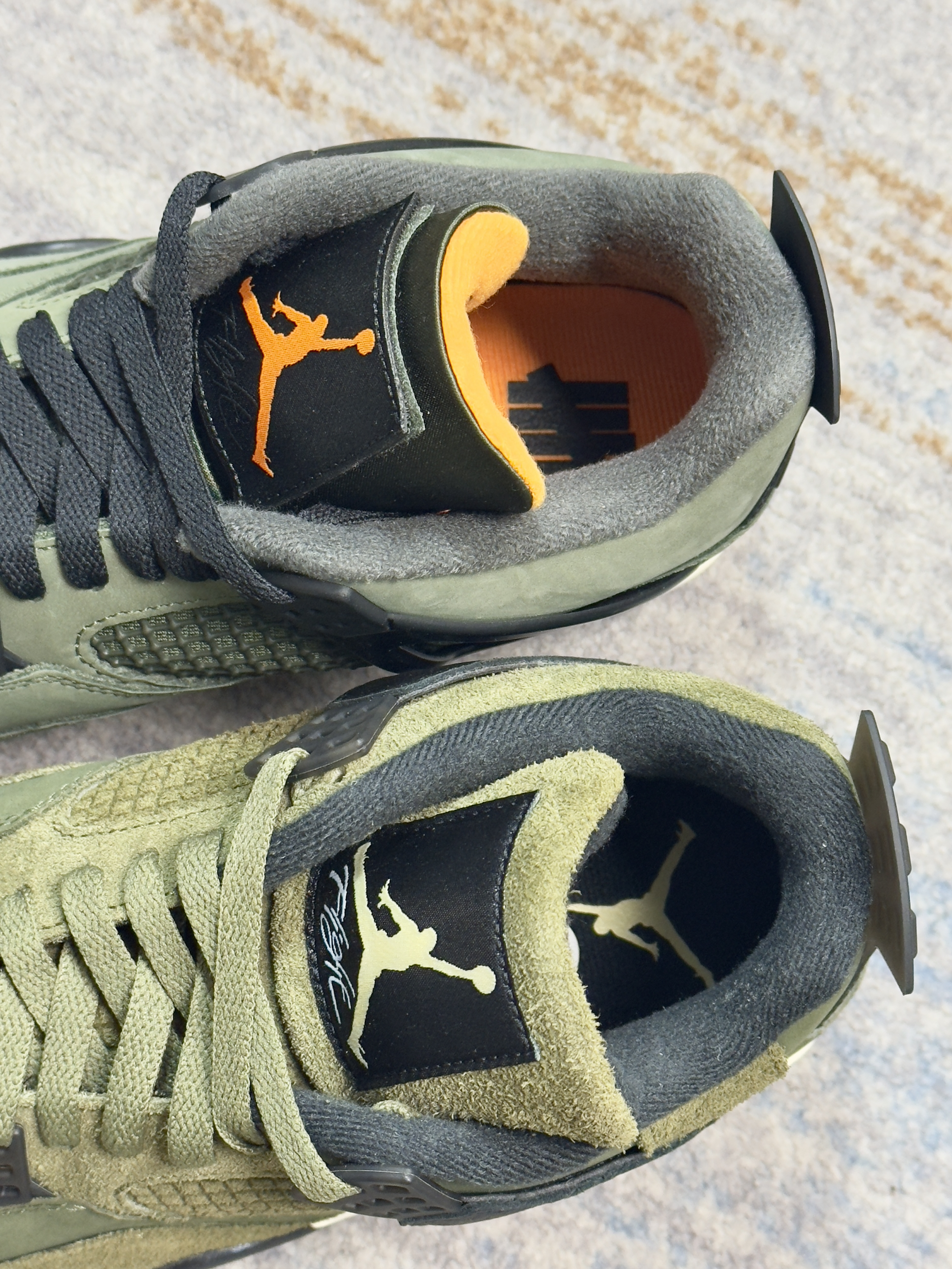 一直有人说这双军绿色AJ4可以平替UND 如今UND联名AJ4复刻了,正好拿来做对比 两双配色仔细看并不算相同,细节材质都不同 UND联名自然是质感看起来更好一些的样子 不过拿一双普款和联名神鞋比,没有可比性的!