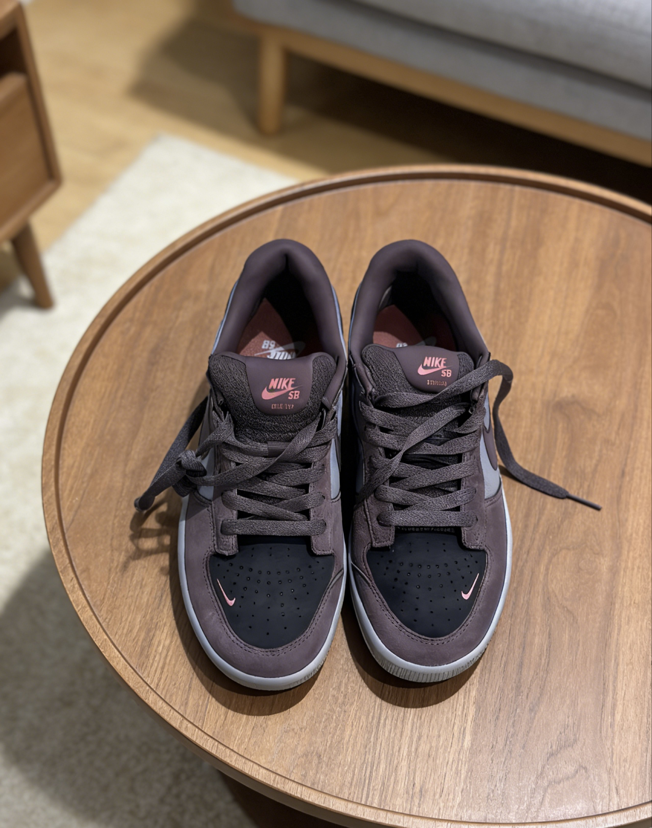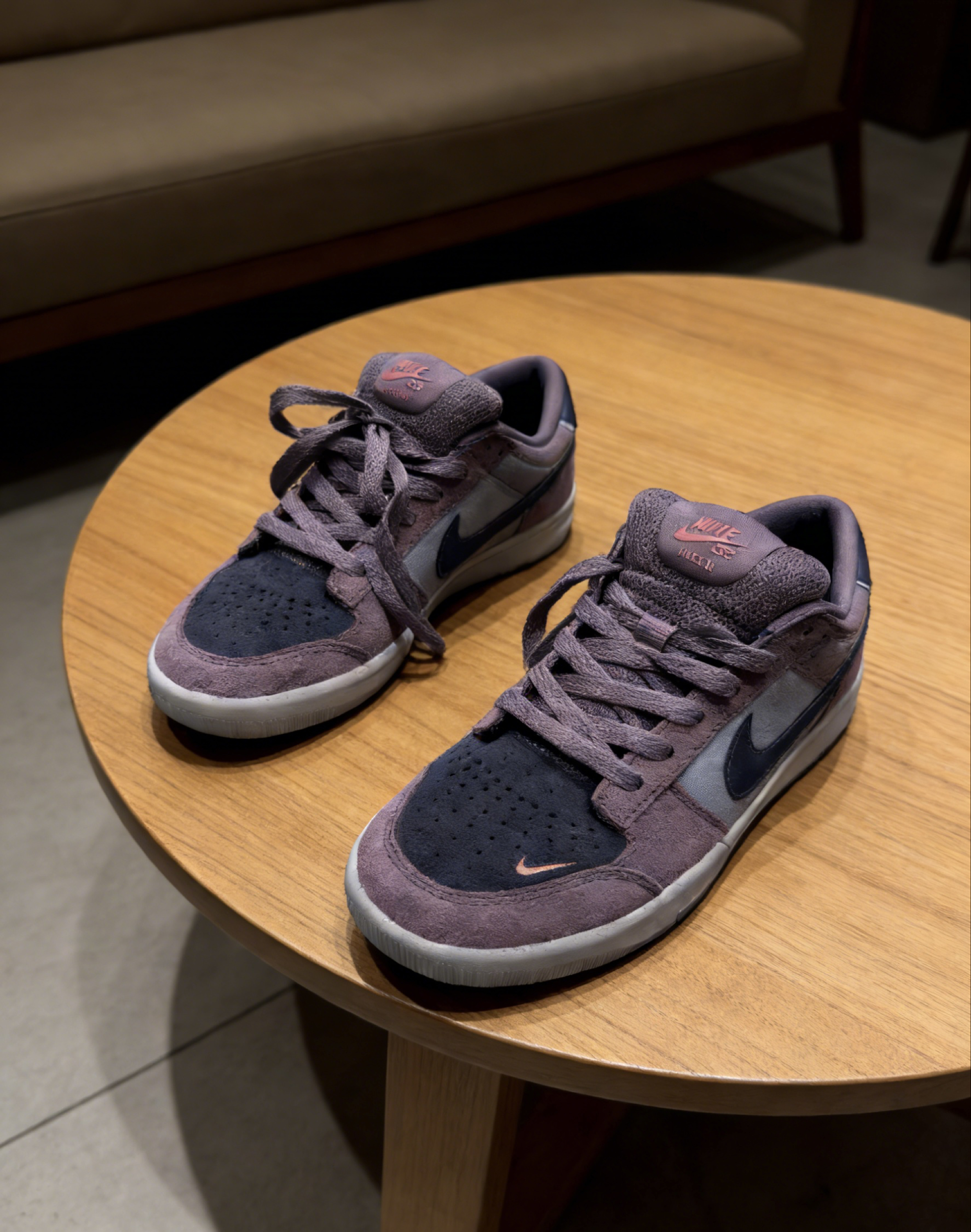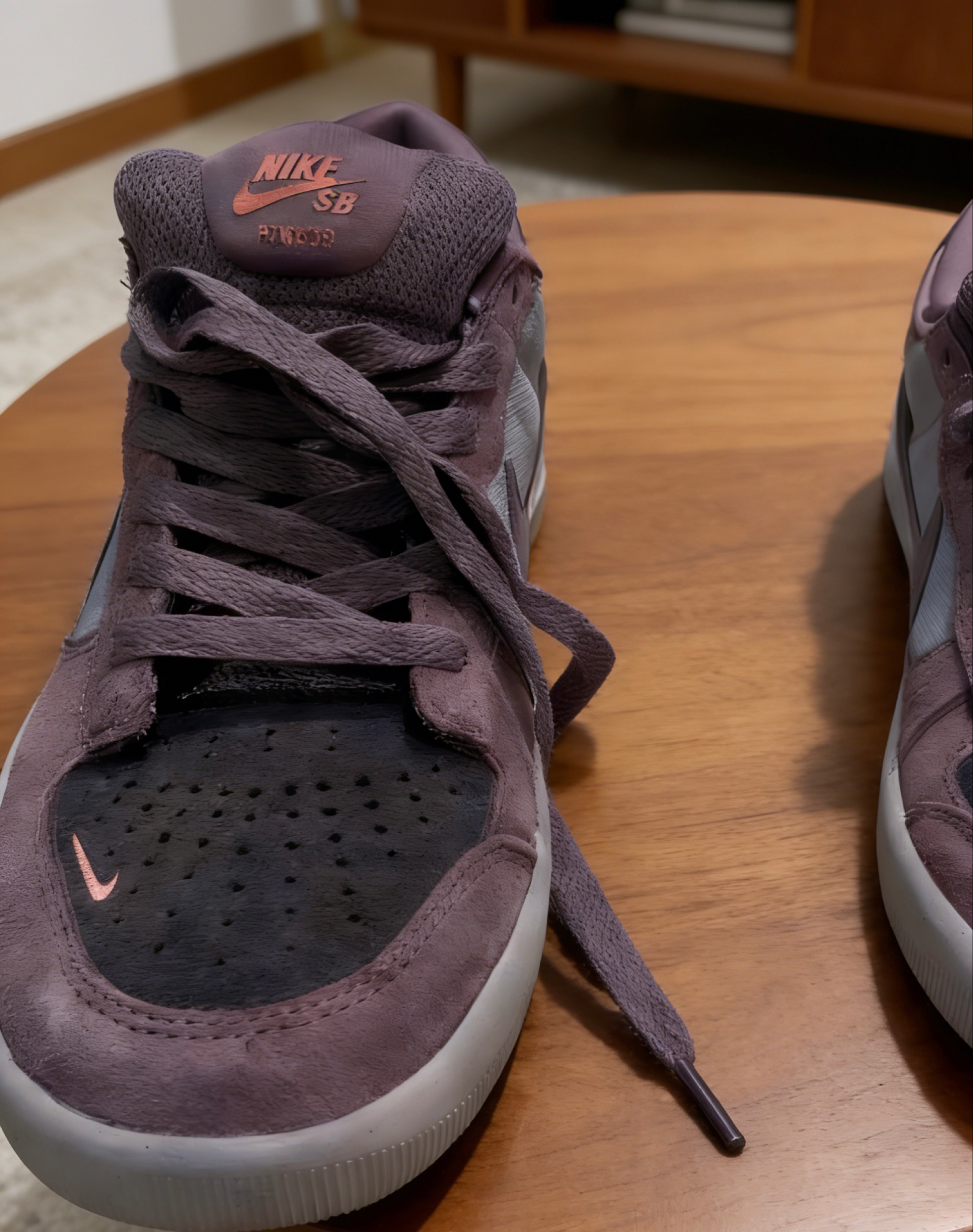 这双Nike SB Force 58我上脚快半个月了,暗紫棕的配色真的越看越有味道,低饱和度的紫调糅合棕调,不是那种张扬的色系,反而透着低调的质感,鞋头的细闪小勾还添了点小心机。 上脚第一感觉就是软弹,鞋身的麂皮材质贴脚但不闷,平时走路或者滑滑板都很跟脚,鞋底的抓地力也够。这段时间我穿它通勤、逛市集,甚至周末去滑板场练动作都没换鞋,搭工装裤、牛仔直筒裤都很适配,连宽松的休闲卫裤配起来也毫无违和感。...