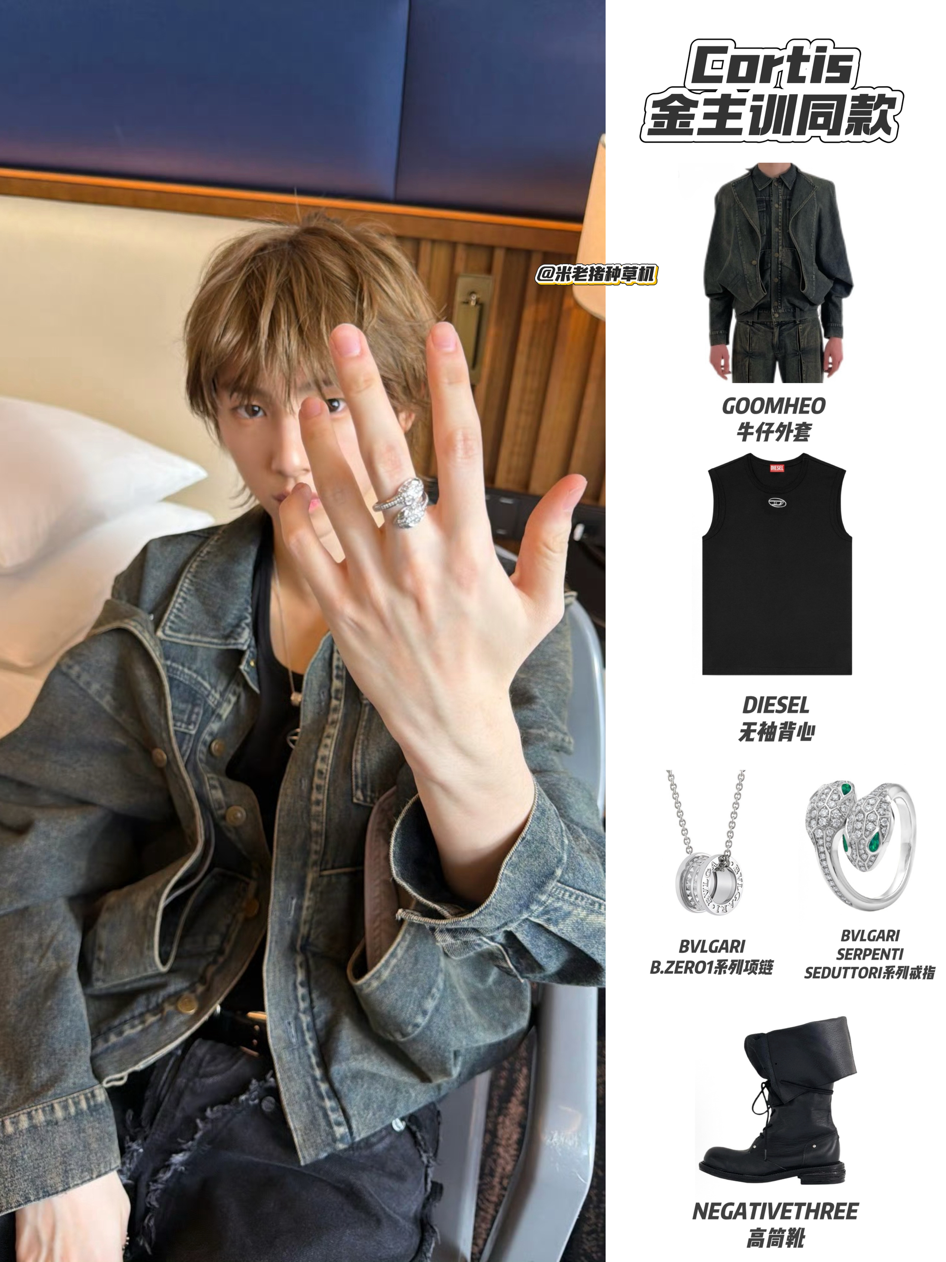 猪歌谣大战红毯这套穿搭以做旧牛仔套装为基调,酷帅有型。内搭的DIESEL背心提升了整体的硬朗感。 点睛之笔在于BVLGARI的配饰——B.ZERO1项链简约大气,SERPENTI戒指则以灵蛇造型增添了一丝不羁与贵气,完美平衡了街头风与高级感。 是贵气高街猪没错了奢牌都来看看我们主训吧~
