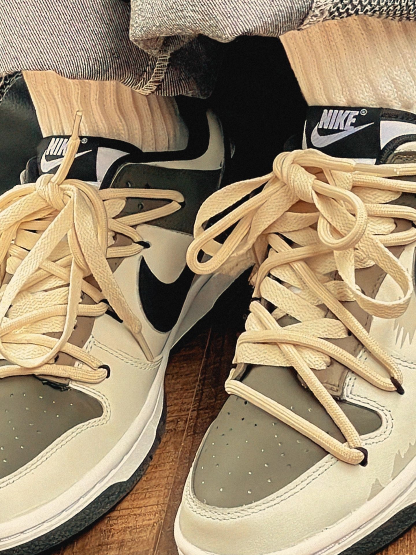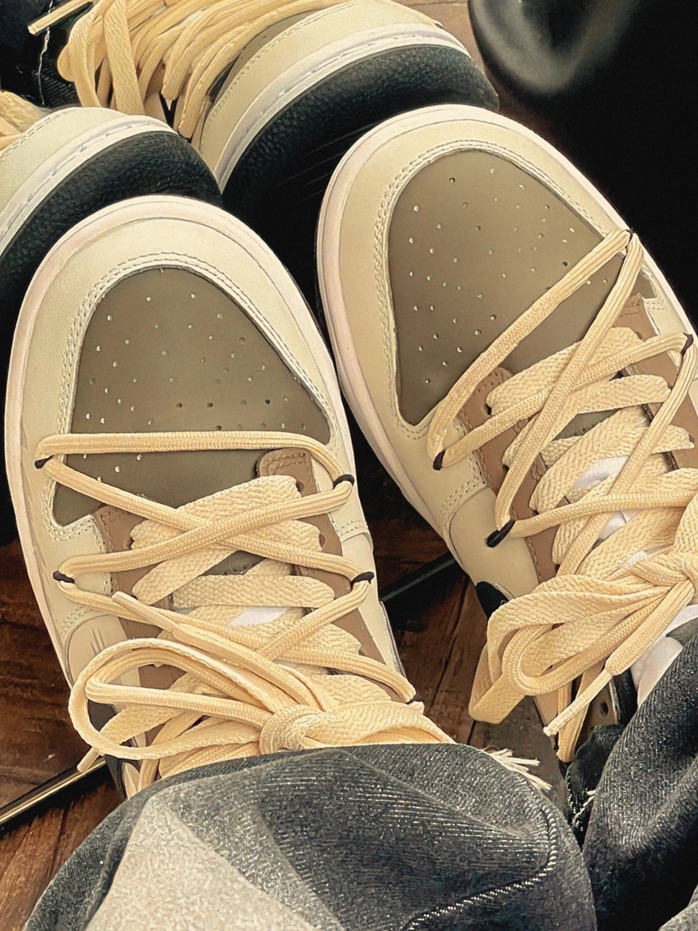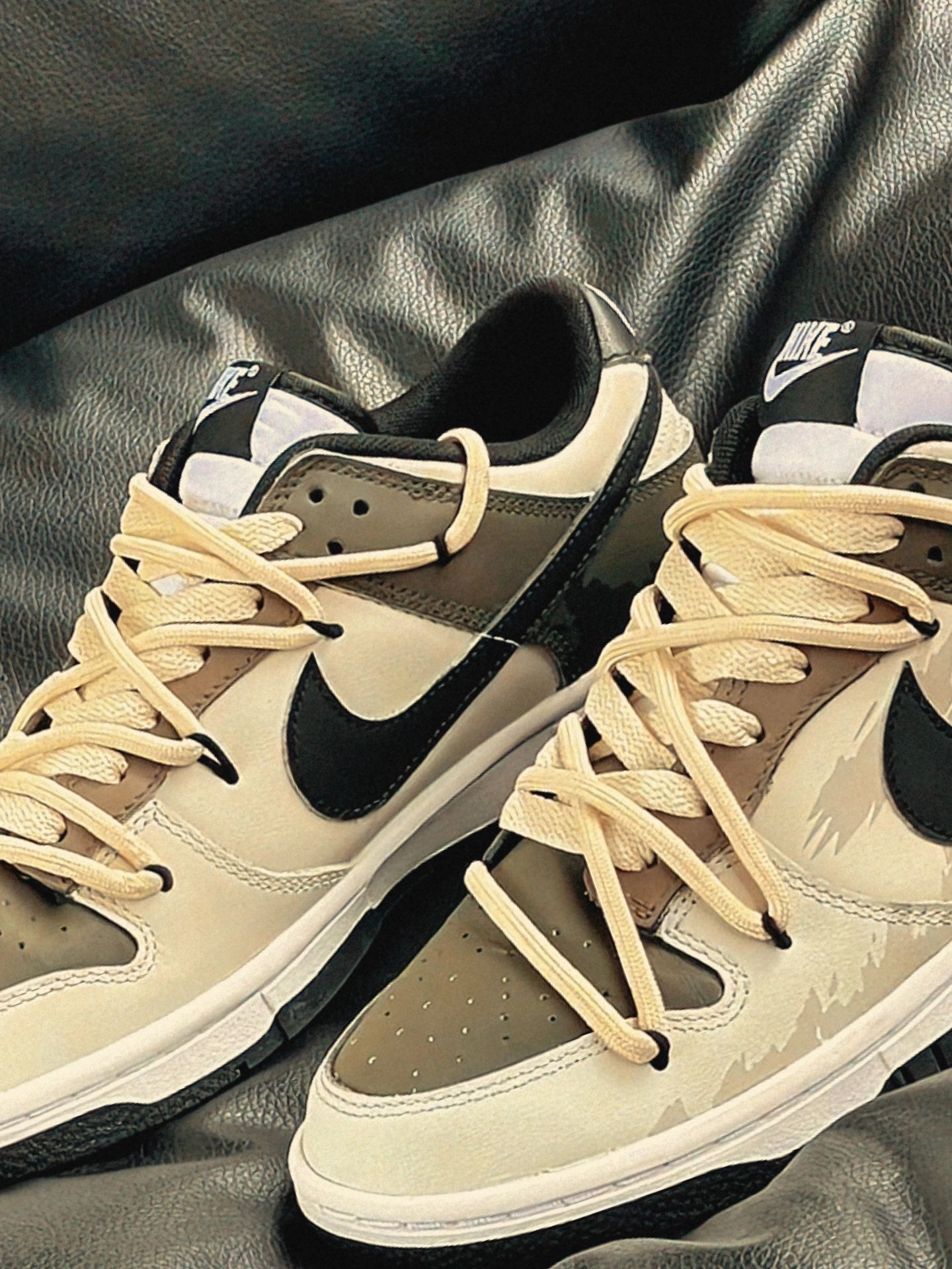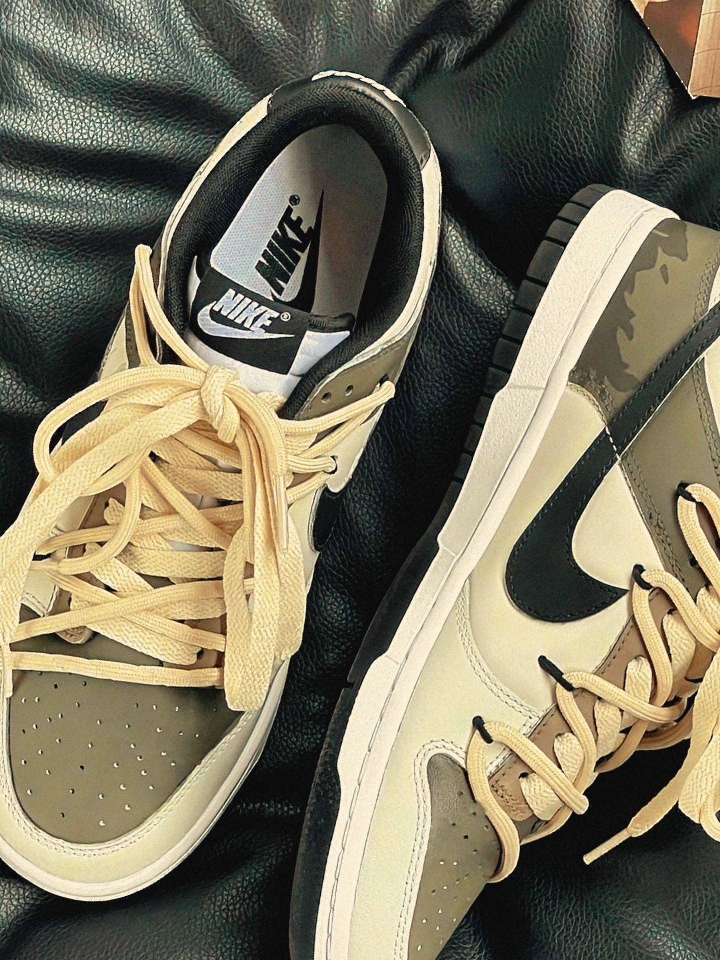 这双鞋是冬日氛围王🎨🤎✨ ||| 下午裹着燕麦色毛衣+做旧牛仔阔腿裤出门,阳光斜扫在这双Nike鞋的卡其拼接面上,像揉碎了半块焦糖。上脚软弹得刚好,鞋带垂下来扫过裤脚时,被咖啡店的猫凑过来扒拉了两下。选正常码就行,裹厚袜子也不挤。 你们觉得这双鞋子搭配什么衣服会更好看呢?