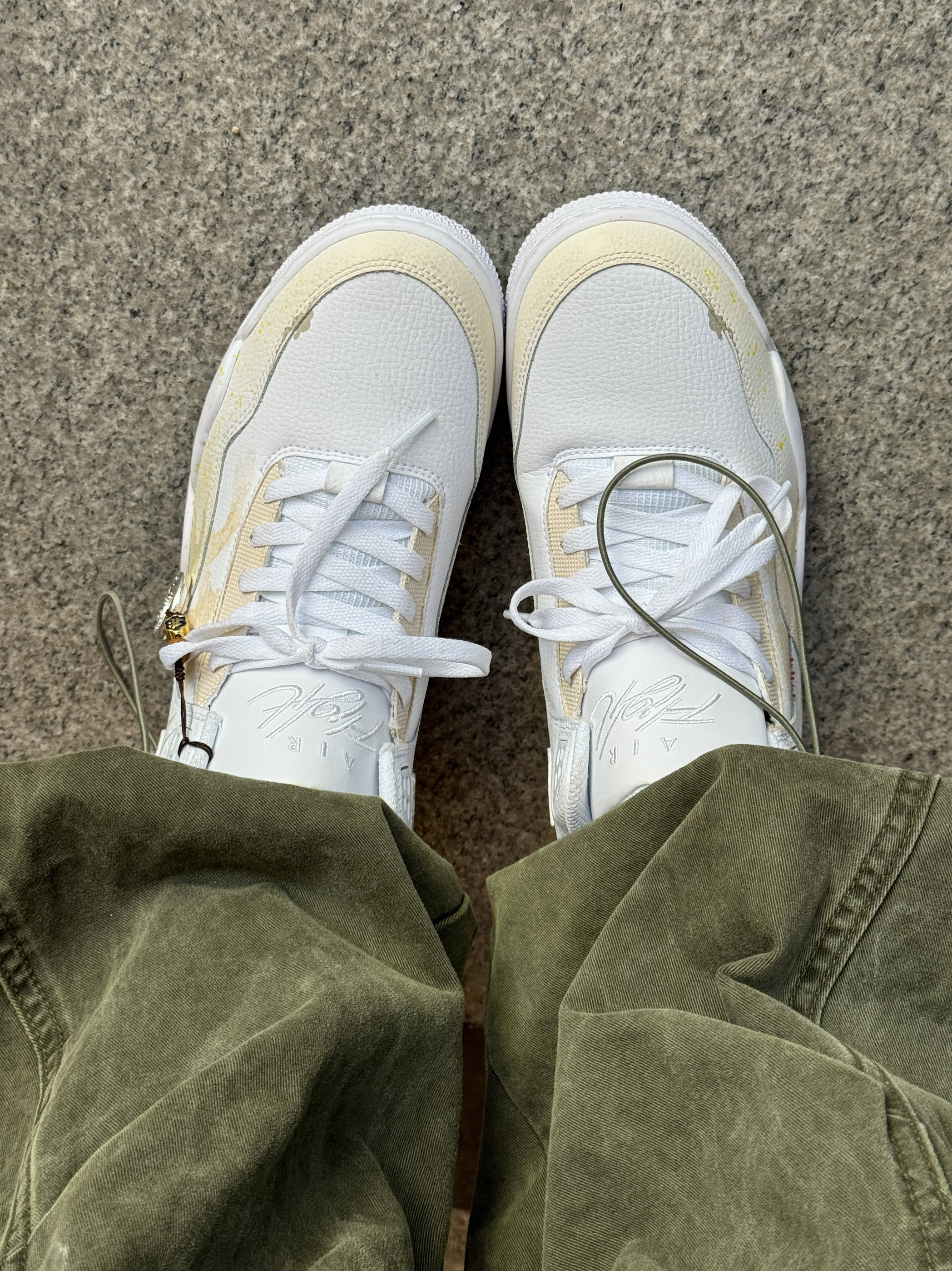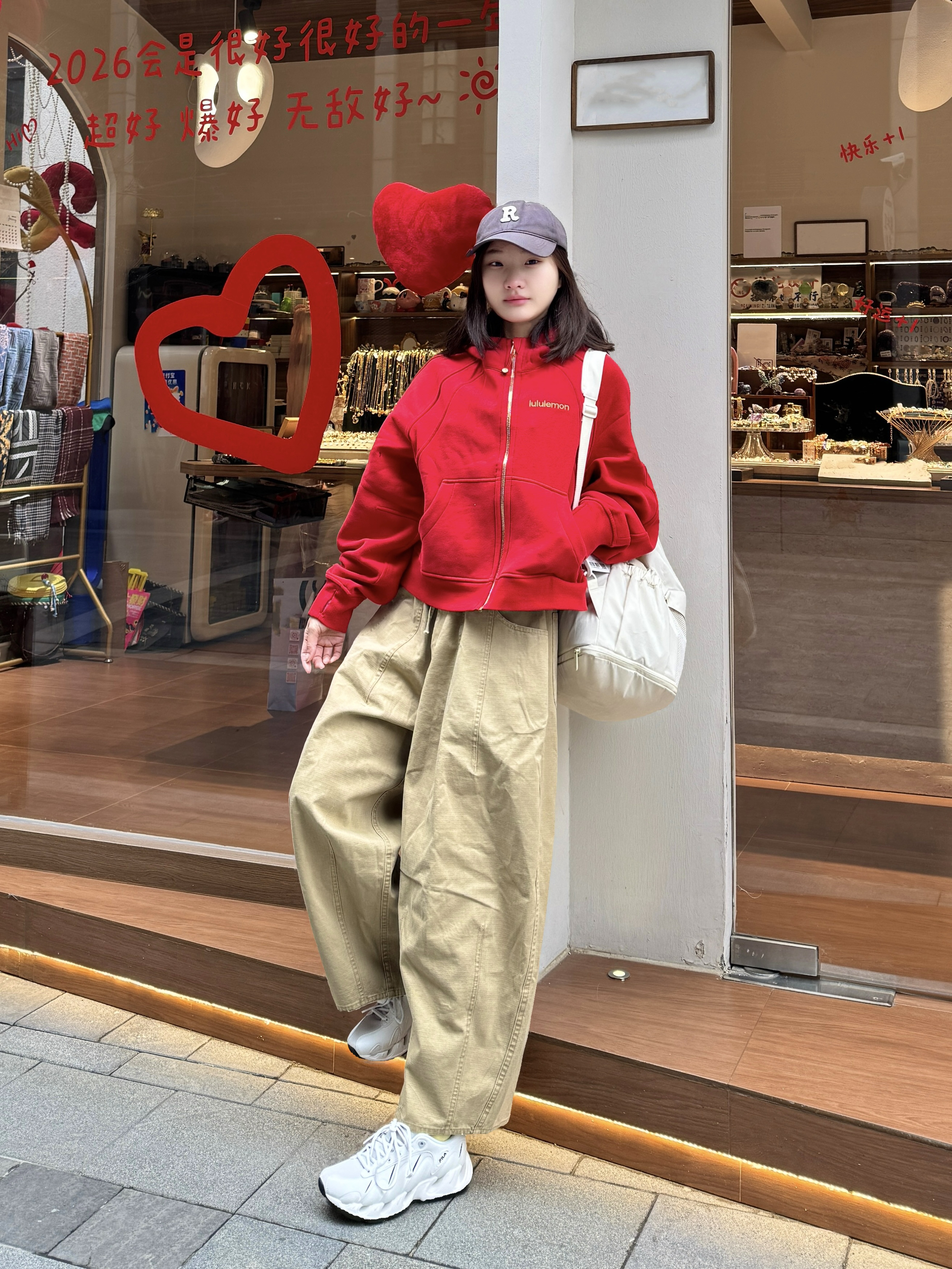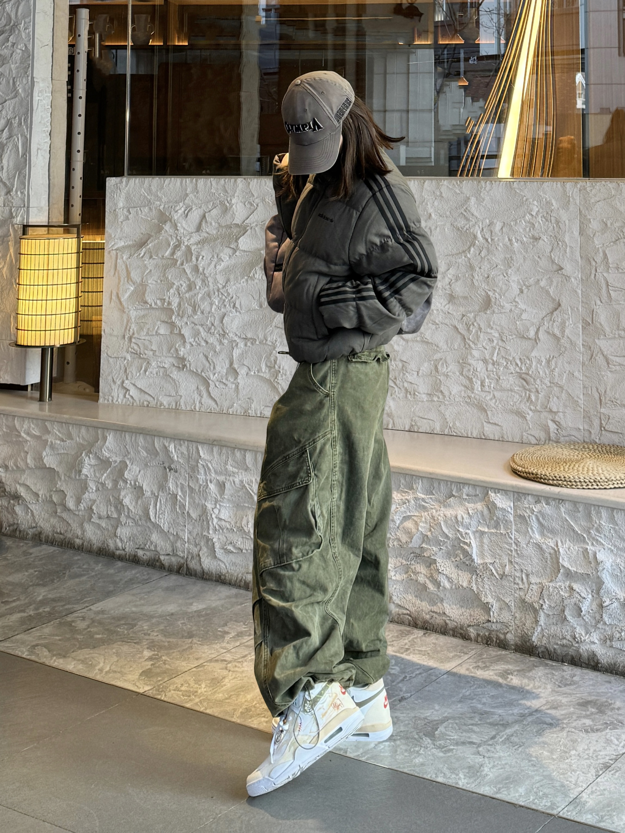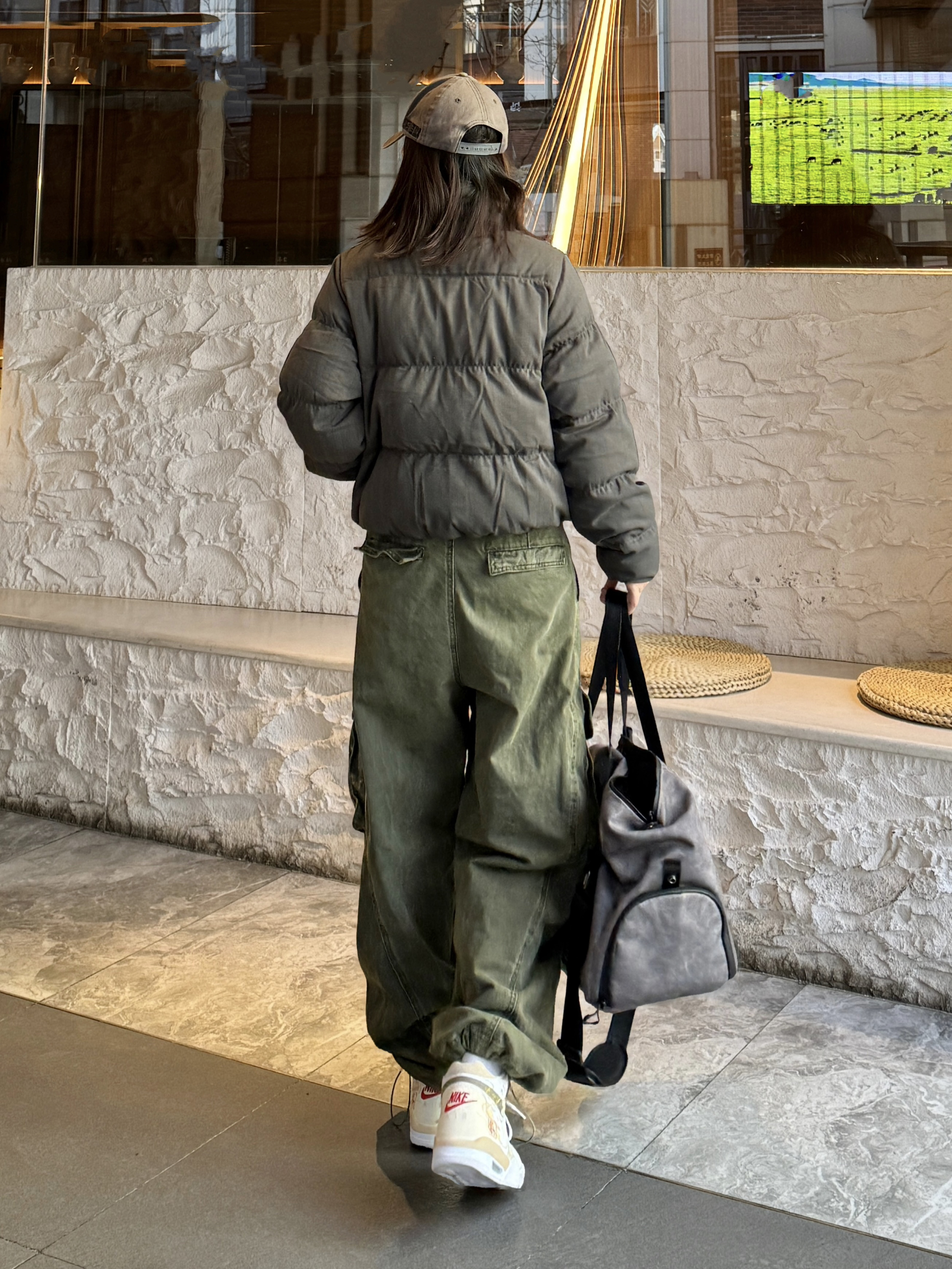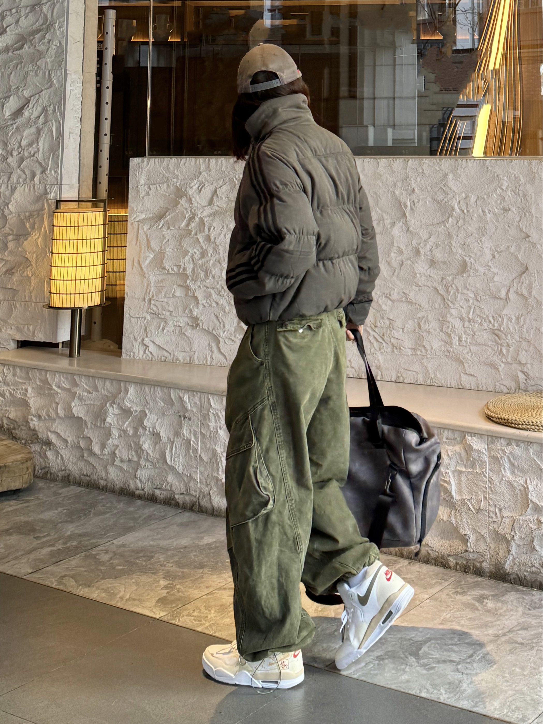 秋冬穿搭怎么能少得了美式复古工装风 暗橄榄绿宽松短款羽绒服 搭配一条军绿色工装阔腿裤 上下深浅绿呼应 很有层次感~ 搭配了一双nike定制款篮球鞋 白黄配色➕国风细节设计 清爽又有年味 鞋底耐磨又舒服 日常走路和运动穿都没问题