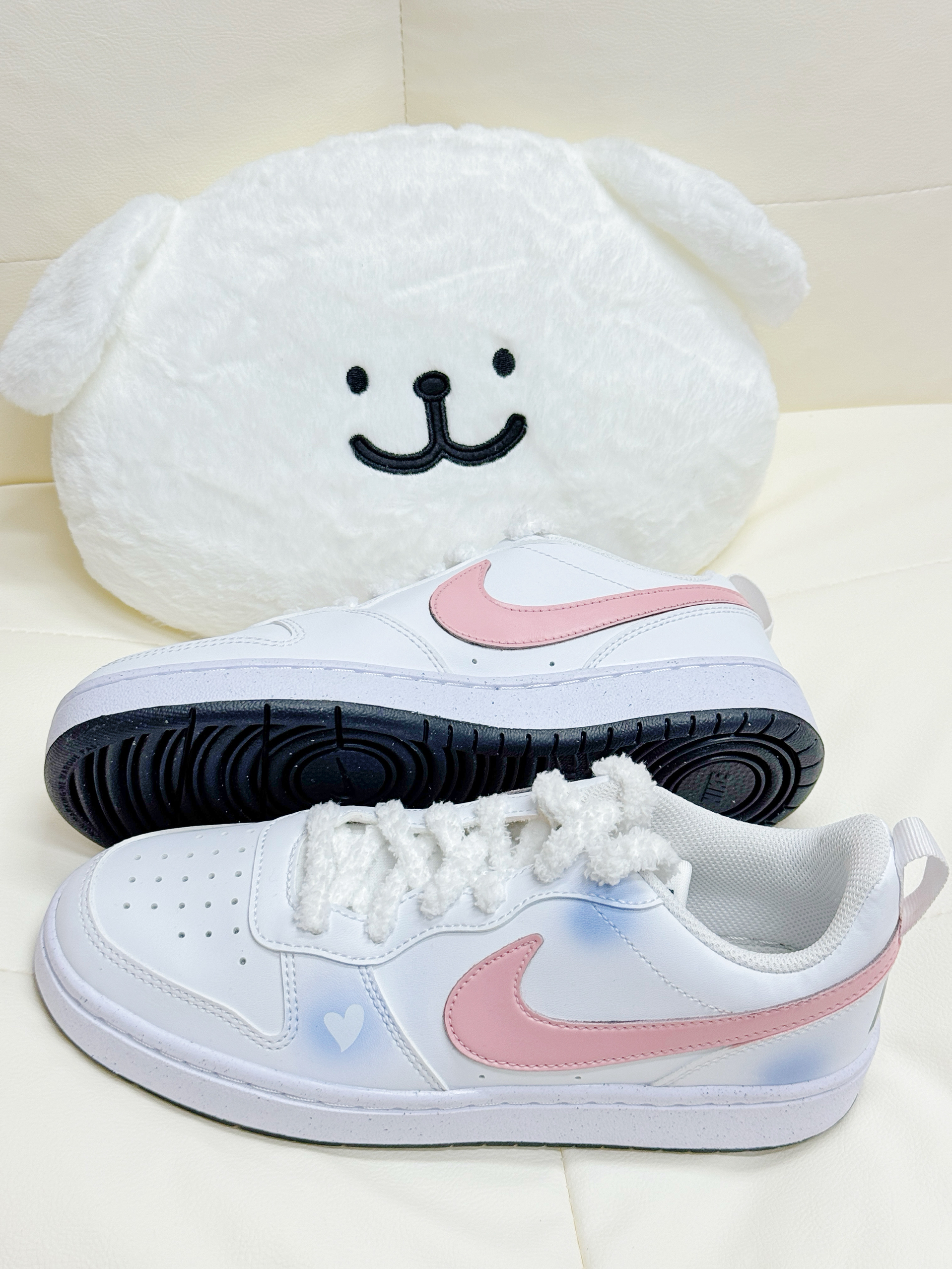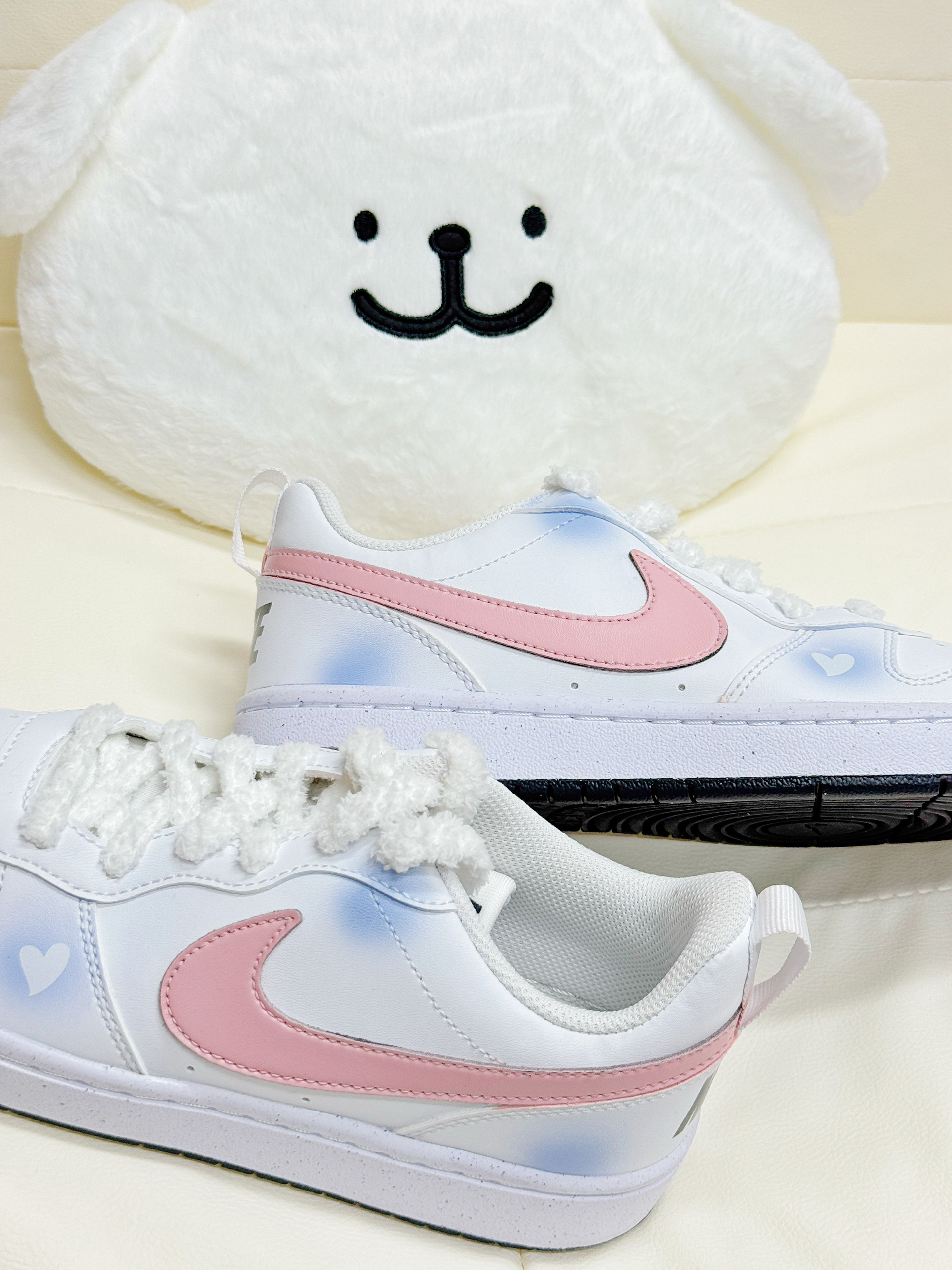 这双Nike板鞋的细节也太戳少女心了!鞋身是清透的蓝粉晕染,还藏着小爱心暗纹,樱花粉Swoosh超温柔,毛绒鞋带软乎乎的超有质感。皮质鞋面软弹不磨脚,低帮设计显腿细,鞋底防滑又轻便,日常搭小裙子、牛仔裤都超适配,甜妹闭眼冲!