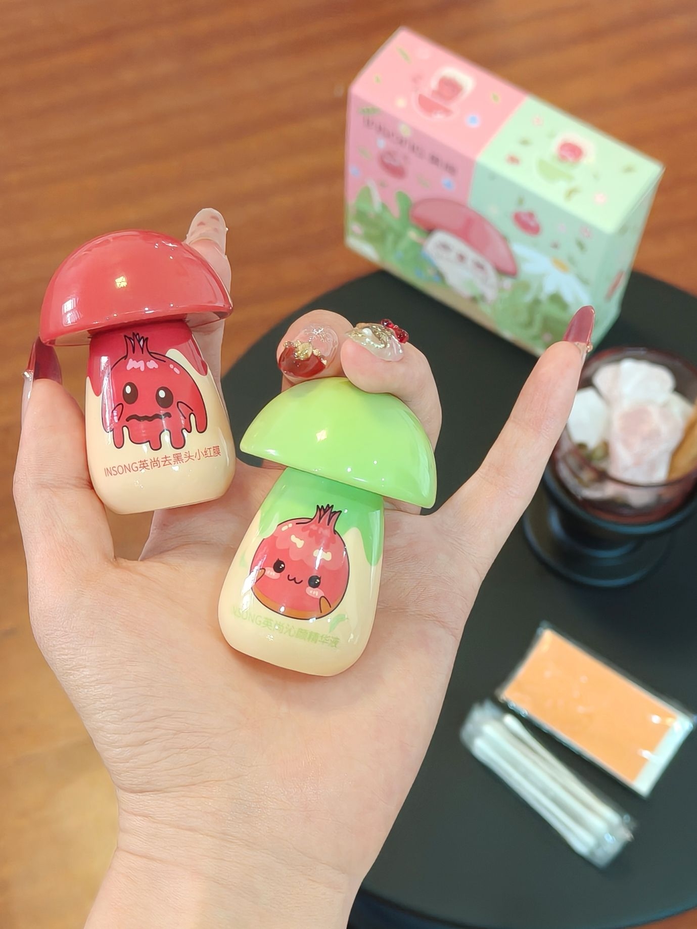 最近刷爆的去黑头神器终于到手了 这颜值真的不要太戳我 两个小蘑菇也太可爱了吧 拆开包装就被萌化 红色清洁+绿色收缩一套搞定 抱着试试看的心态用了一次 结果惊呆了 黑头白头真的浮出来了 轻轻一刮就掉 之后再抹上收缩毛孔精华 鼻子摸起来滑溜溜的 感觉毛孔都隐形了