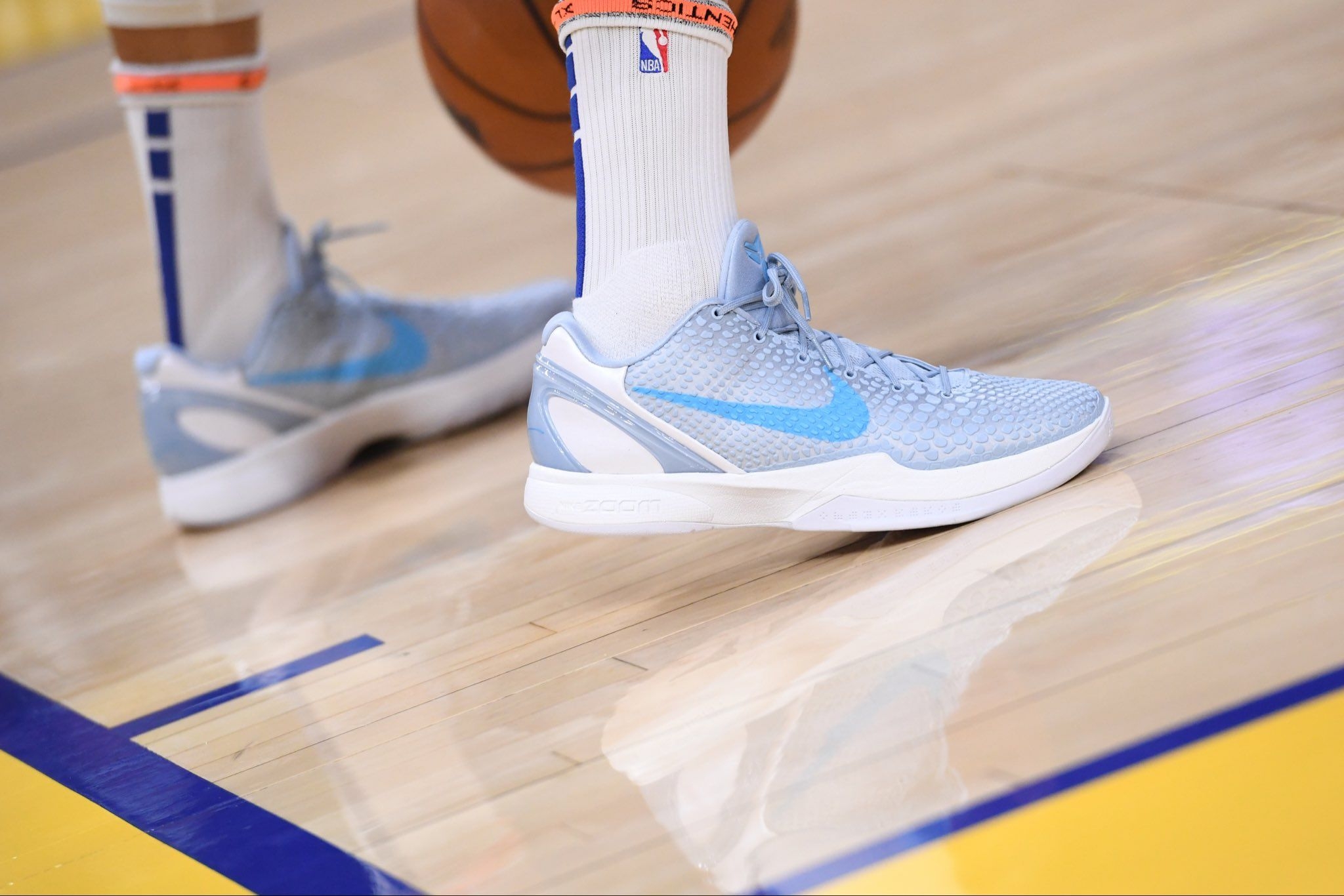 斯蒂芬·库里在热身时继续表达对科比的喜爱,穿着凯特琳·克拉克的科比 6 代 PE 球鞋。
