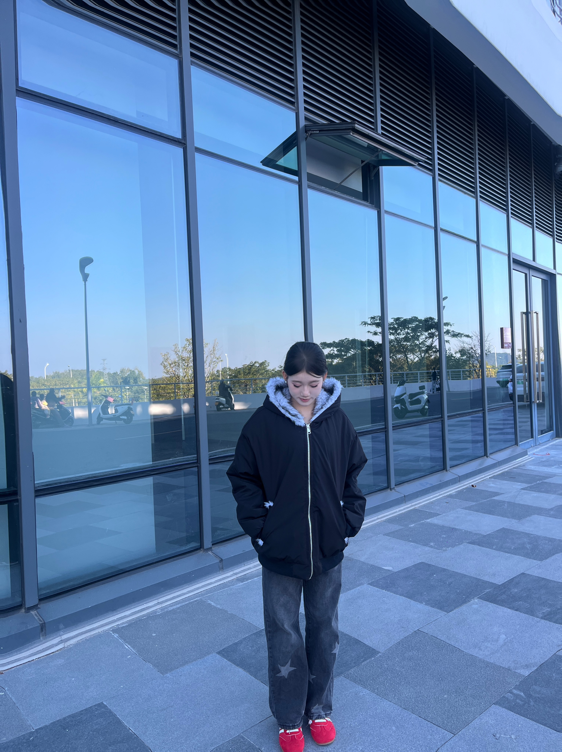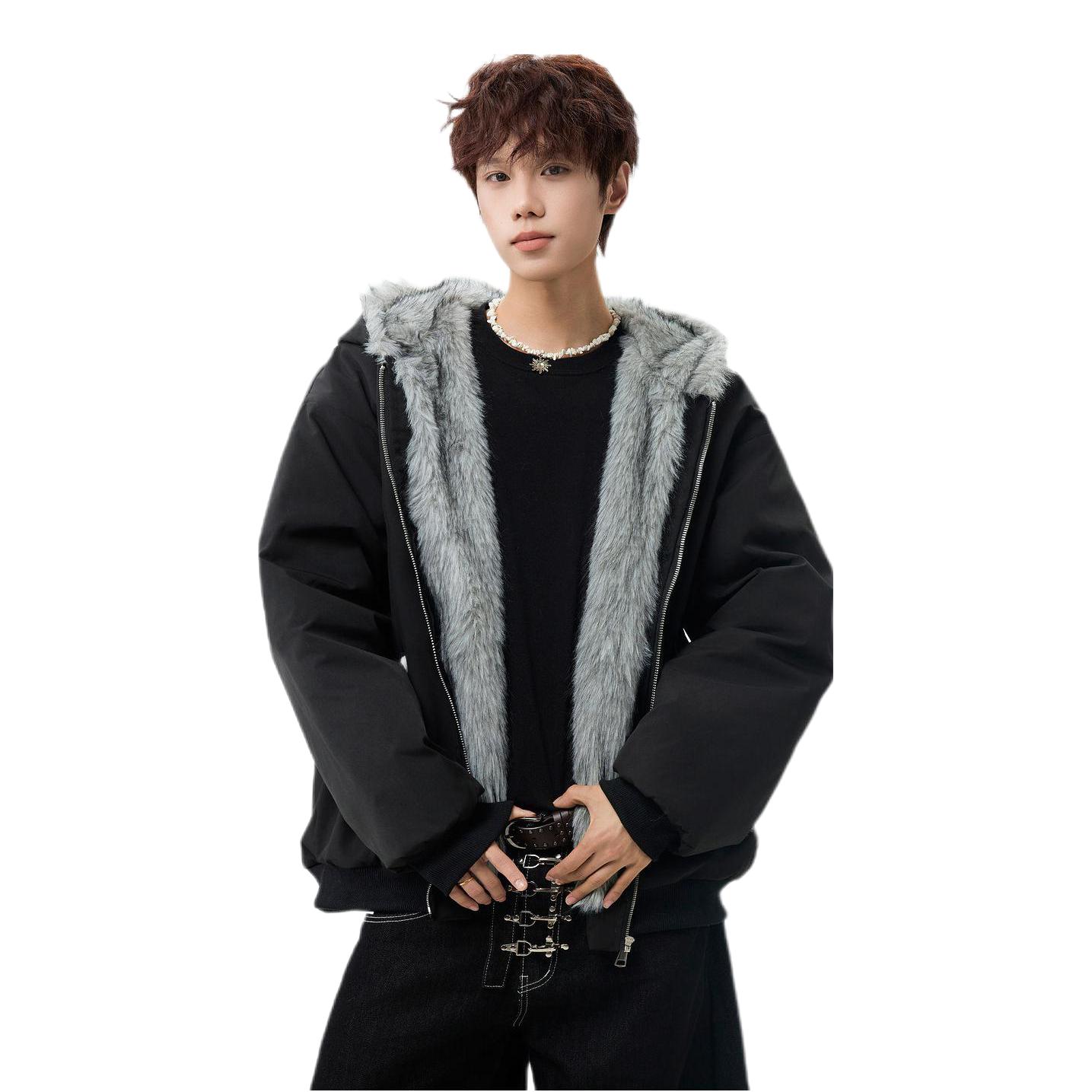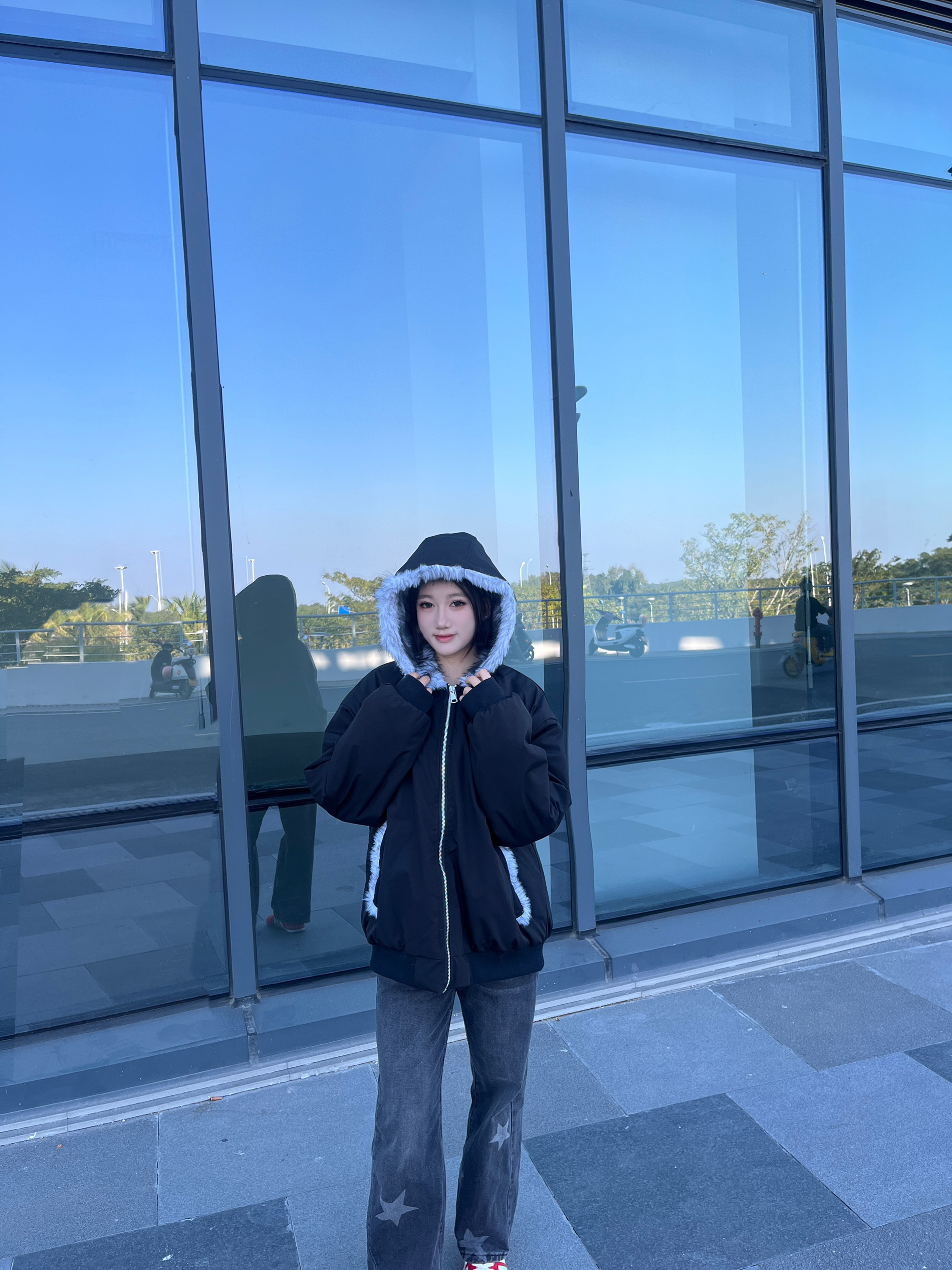 这件外套的质感真的绝了!👍 黑色的外层面料挺括又防风,不会软塌塌没型,连帽处的浅灰毛绒边蓬松又柔软,摸起来手感超棒。😽 内里的绒面更是软乎乎的,贴身穿也特别亲肤,保暖性拉满还不显得臃肿。🤩 宽松的版型对小个子超友好,158cm穿也能轻松驾驭,拉链和口袋的细节设计也很精致,整体颜值和实用性都在线❗️
