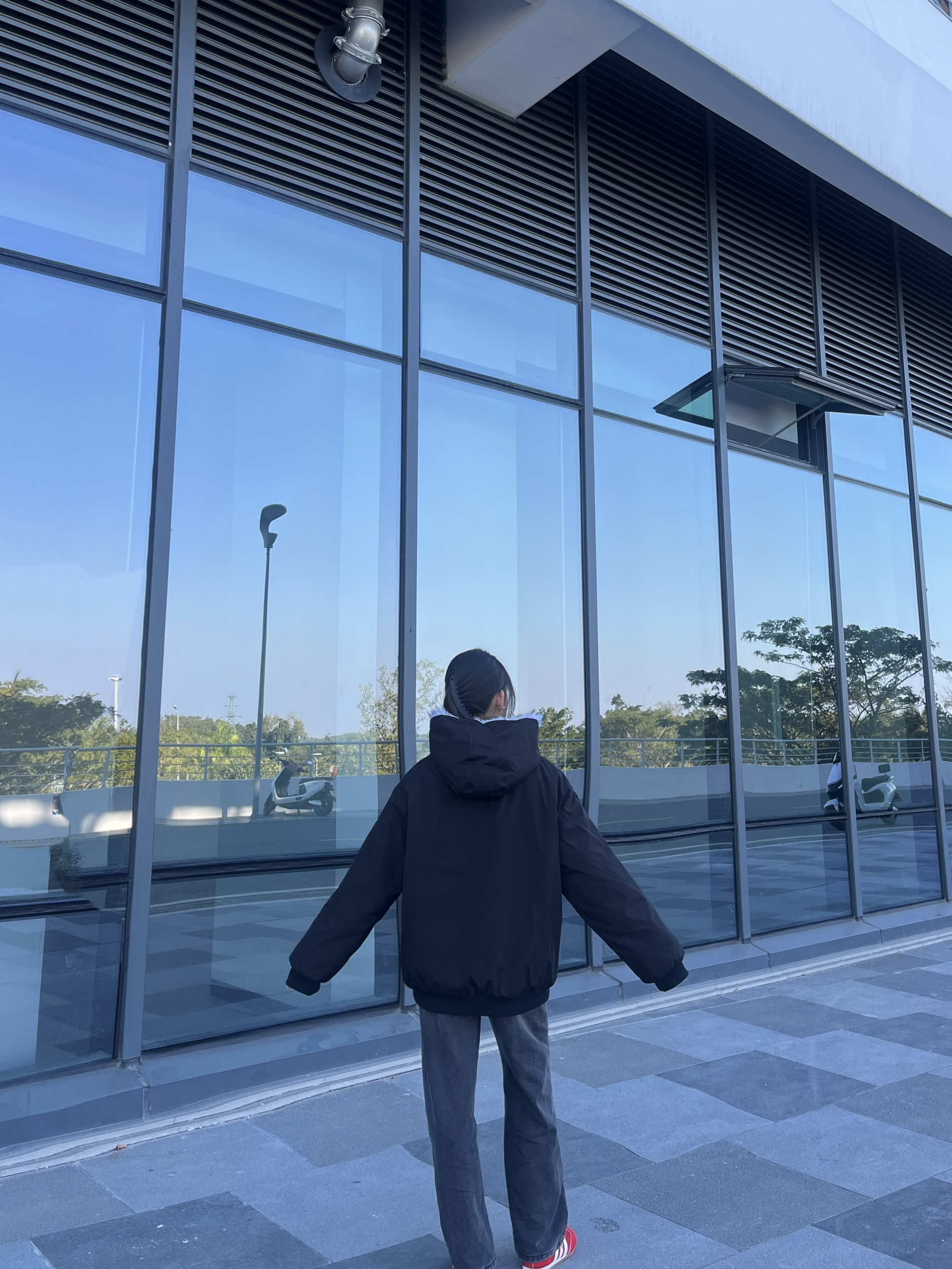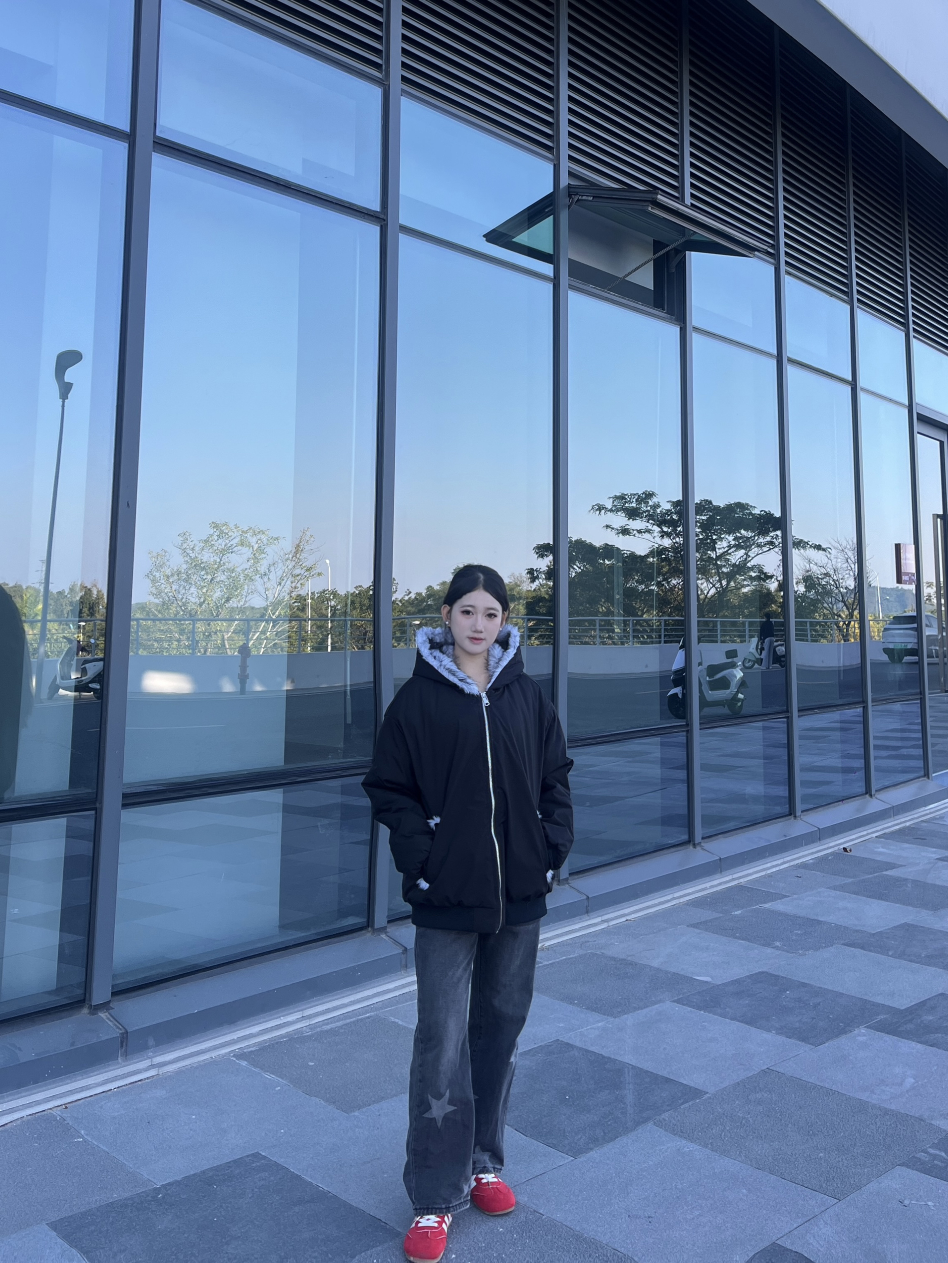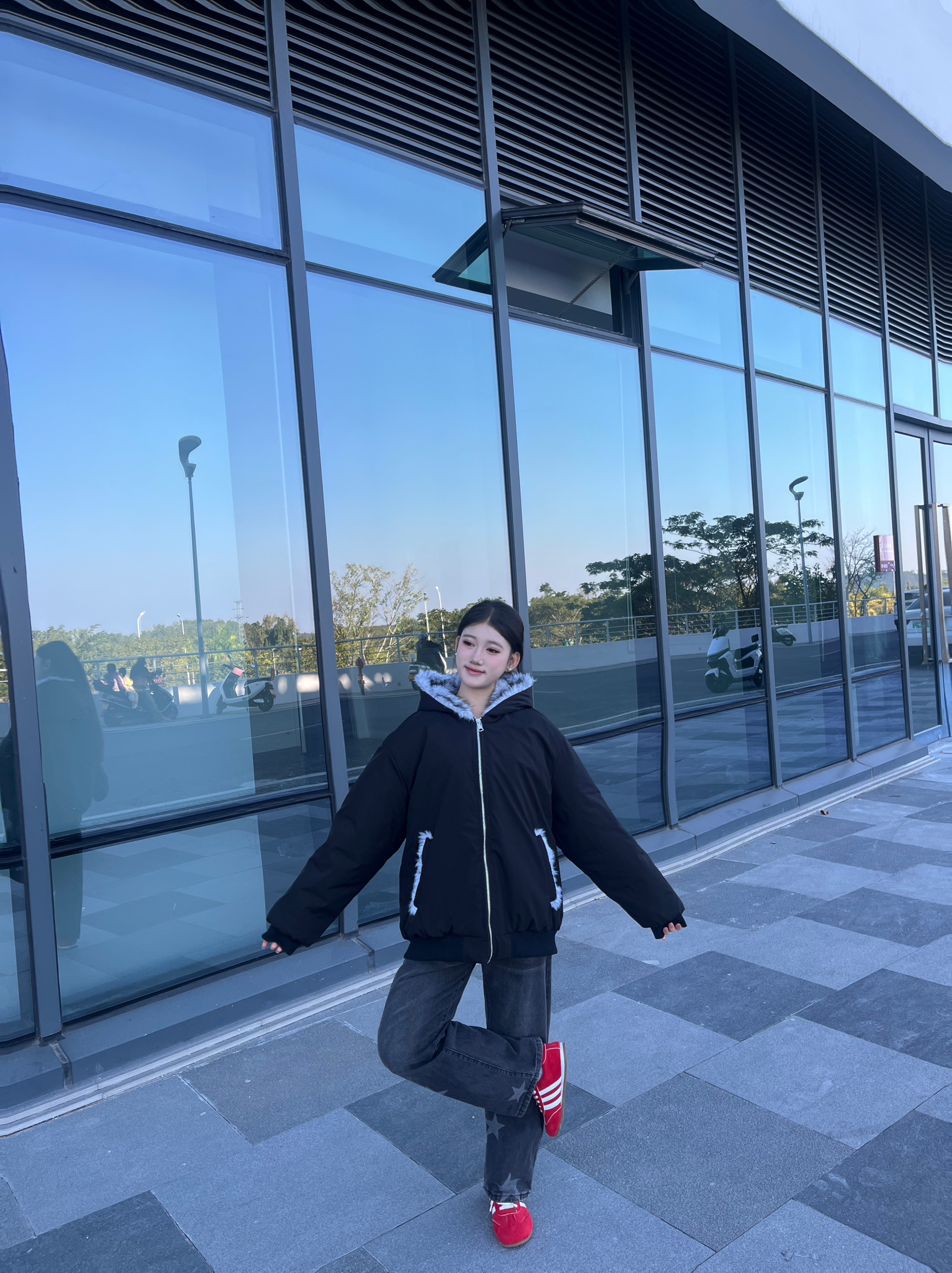 这件外套的质感真的绝了!👍 黑色的外层面料挺括又防风,不会软塌塌没型,连帽处的浅灰毛绒边蓬松又柔软,摸起来手感超棒。😽 内里的绒面更是软乎乎的,贴身穿也特别亲肤,保暖性拉满还不显得臃肿。🤩 宽松的版型对小个子超友好,158cm穿也能轻松驾驭,拉链和口袋的细节设计也很精致,整体颜值和实用性都在线❗️