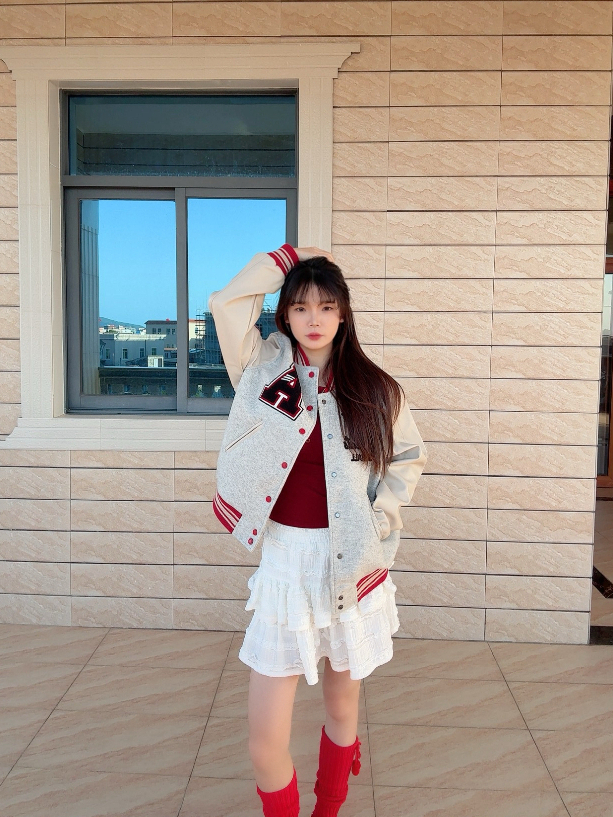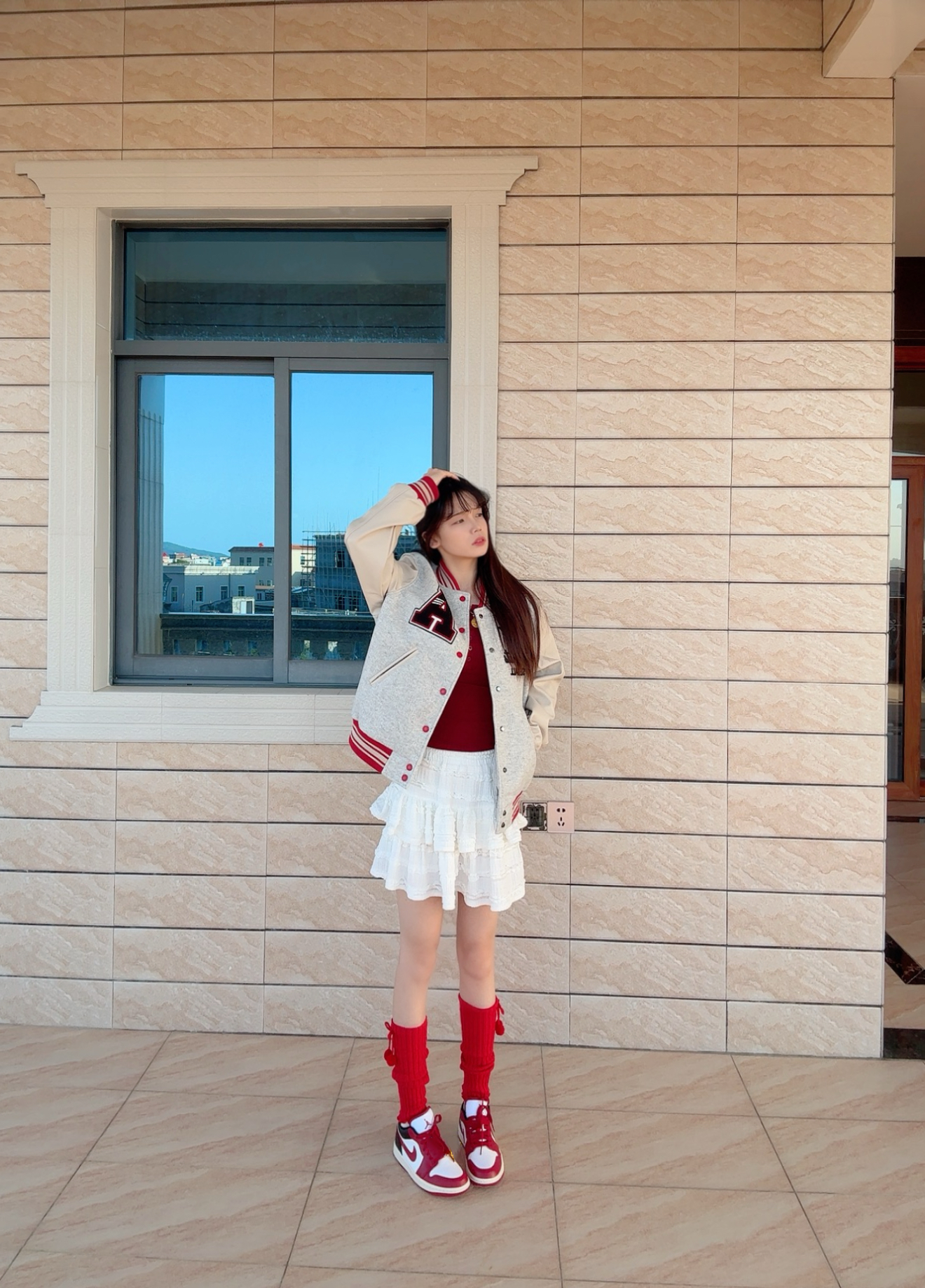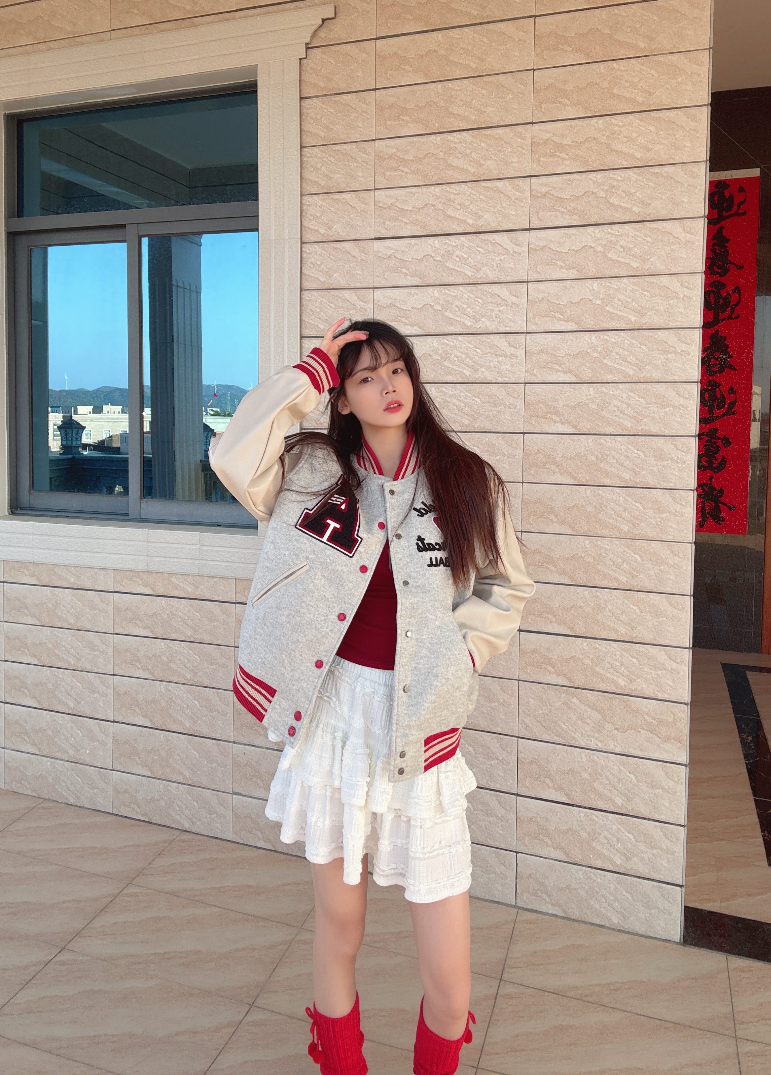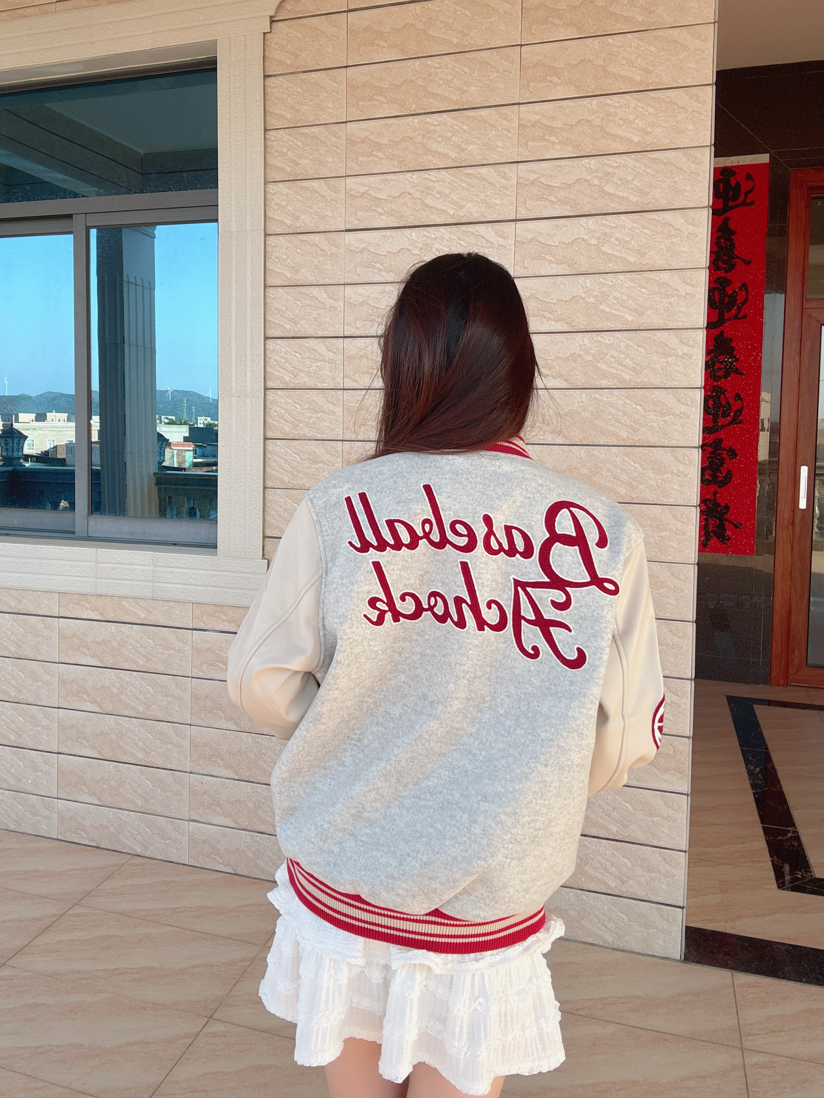 今日穿搭花灰色棒球服➕白色百褶裙 这套上身太有新年氛围感了吧~ 🧥是 A chock 🏠的棒球服⚾️外套 灰调拼杏色又甜又酷呢! 红纹刺绣好有美式那味儿 做了重工🪡刺绣设计 质感超不错😌 日常搭配牛仔裤或者休闲裤都很好搭配 当情侣👫款也超不错呢! 我是166/43kg穿的是M码哦 再搭配AJ1黑红整体的新年氛围感就起来啦~